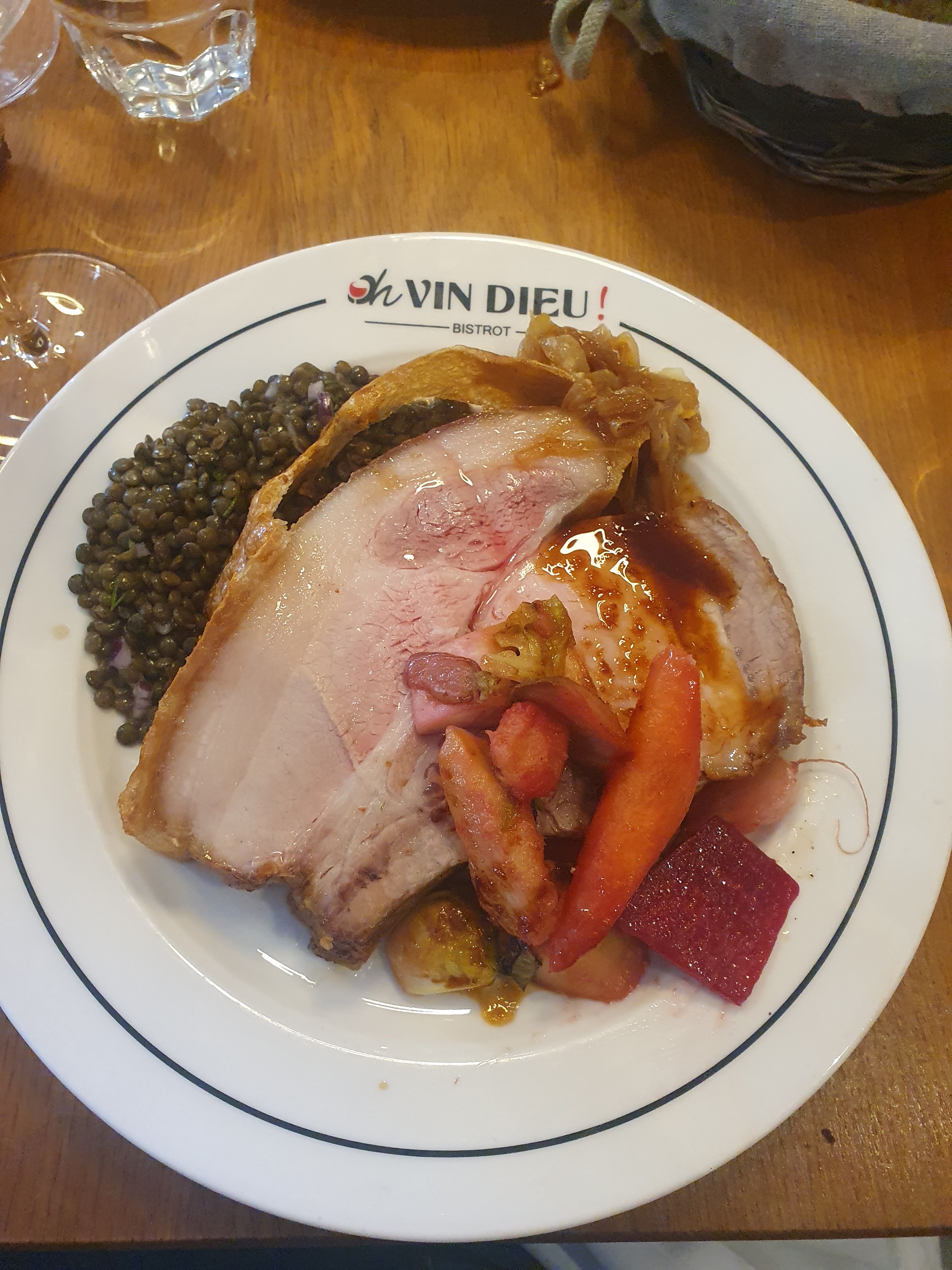 Je continue avec une autre adresse.. ca il n'y avait plus de place.. Je disais donc que.. la soirée aidant...le carafon bien entamé, l'oeuf mayo évaporé, la cote de cochon démontée..la bavette envolée, une petite virée sur la poire au vin en dessert ne serait pas de refus..Raisonnables que nous sommes nous demandons deux cuillères...pour partager..C'est vrai qu'on aurait pu se travailler à la tatin... mais point trop n'en faut. Le dessert est sympa, bien présenté mais la sincèrement j ai trouvé que çà manquait un peu de fantaisie de relief de revenez-y..dans la présentation... En revanche sur le taste, rien à dire.. C'est du bon job, bien préparée pas trop cuite, un poil croquant comme il faut avec la mâche de la poire qui va bien..ok j'achète..ca finit bien la dinette mais ca pourrait être un peu plus flatteur au regard du reste des agapes. Niveau prix c'est très raisonnable on est à un 50e par tête sachant qu on a pas mégoté.. Nous avons passé une belle de belle soirée, un vrai moment de qualité ...bonne ambiance, un service tout à fait juste dans son timing en phase avec la cuisine. Sebastien le patron est plus que sympa, on sent l'amoureux des choses bien faites et le respect du plaisir client. Un petit mot mais un grand talent pour le chef Ethan, qui venant du Frenchie de Greg Marchand a su mettre sa patte et son amour de la cuisine sur la carte de Oh vin Dieu.. en y apportant talent, rigueur et savoir faire.. le cuissons sont parfaitement maîtrisées, l'originalité est au rendez vous..Vraiment c'était un bon test, une belle expérience..Merci Apres discussion en fin de service avec Sebastien, ce dernier nous disait qu'il faisait evoluer tous les jours sa carte..tant mieux...ca promet...Mais la je pleure.. car quand reverrais-je ma cote de cochon? En tous les cas je recommande clairement et vivement Oh vin..Dieu..Un bistrot parisien nouvelle génération..mais qui sait se souvenir que l'on ne fait du bon qu'avec du très bon.. qui rappelle le monde d'avant avec le talent du monde d'après..On y retourne quand?