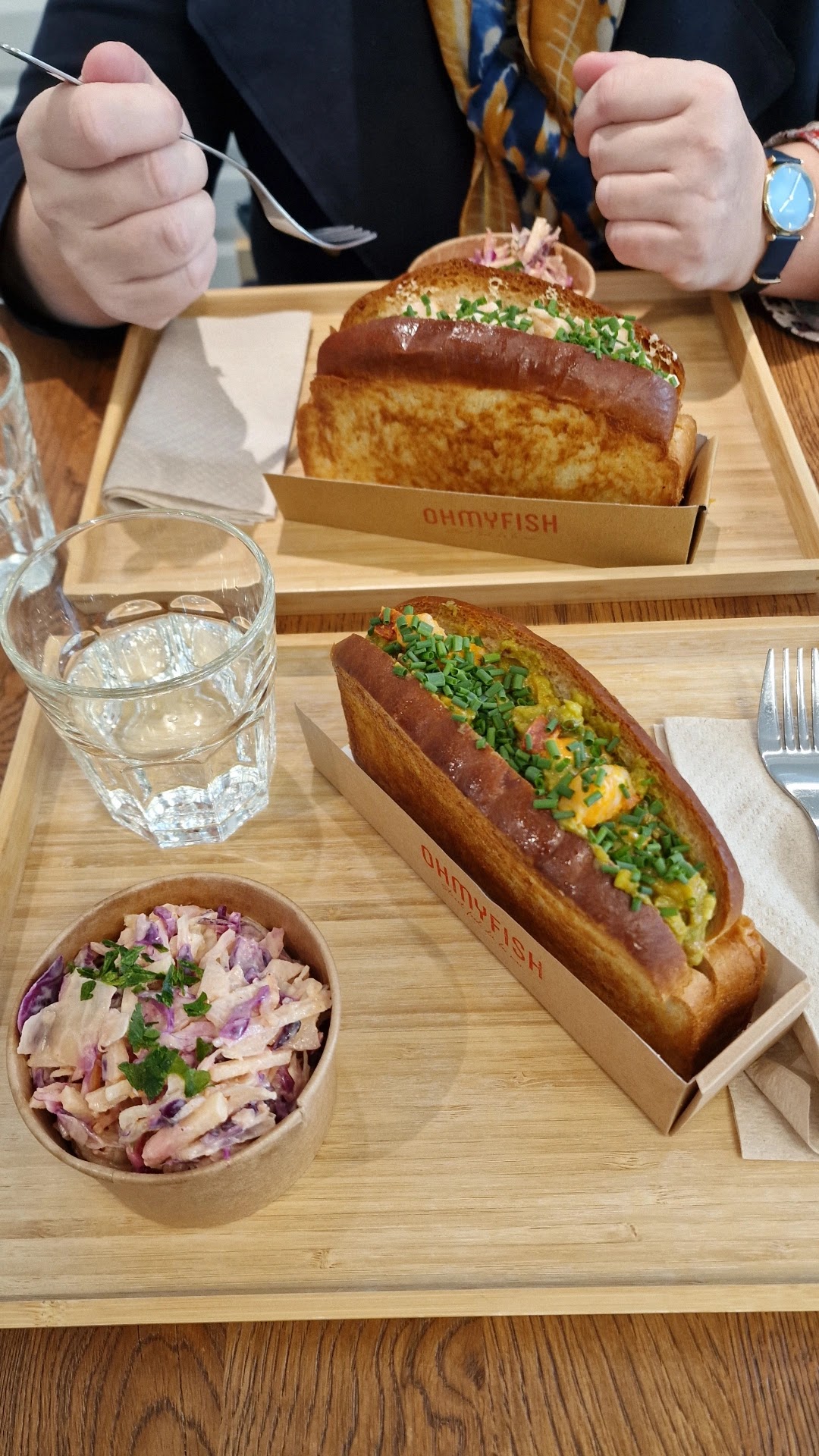 On a mangé une première fois chez Oh My Fish a leur ouverture, on avais eu un avis un peu mitigé. Nous y sommes retournés (toujours à emporter) pour retenter l’expérience. - Le shrimp: garnitures qui se marient bien ensemble, un guacamole savoureux et bien relevés, le piquant du chorizo et quelques crevettes - Le salmon: généreux sur la proportion de saumon mais une crémé de chèvre fade, manque d’adicité et de peps Les deux pains briochés étaient trop grillés, on ne retrouve pas le côté moelleux et gourmand, et pour nous c’est ce qui fait toute la différence avec la première fois. - Le coleslaw: bien équilibré dans les saveurs mais assez pâteux en bouche, proportion correcte L’accueil y est toujours chaleureux mais un peu trop élevé pour le rapport qualité prix et quantité. Décevant !