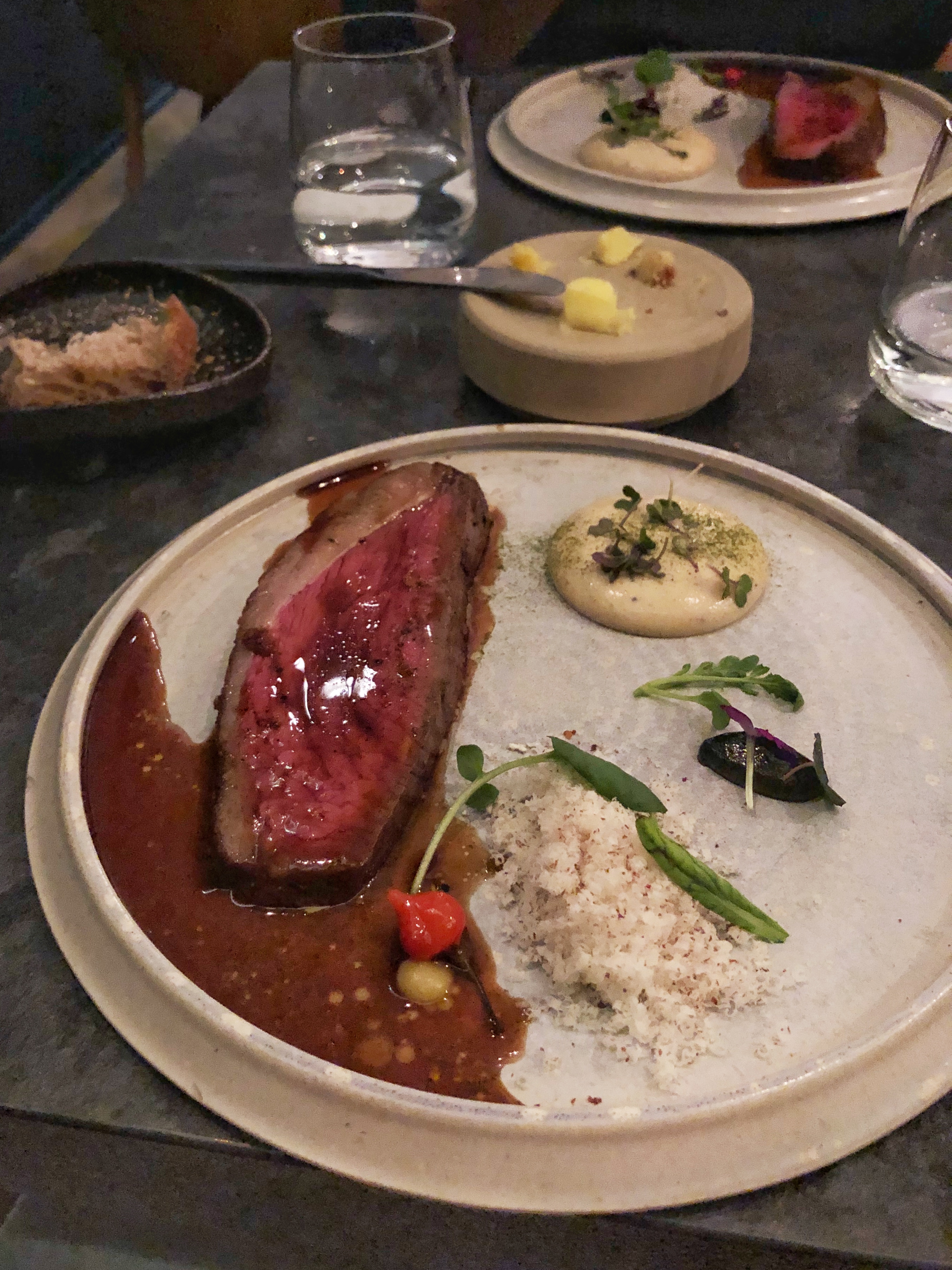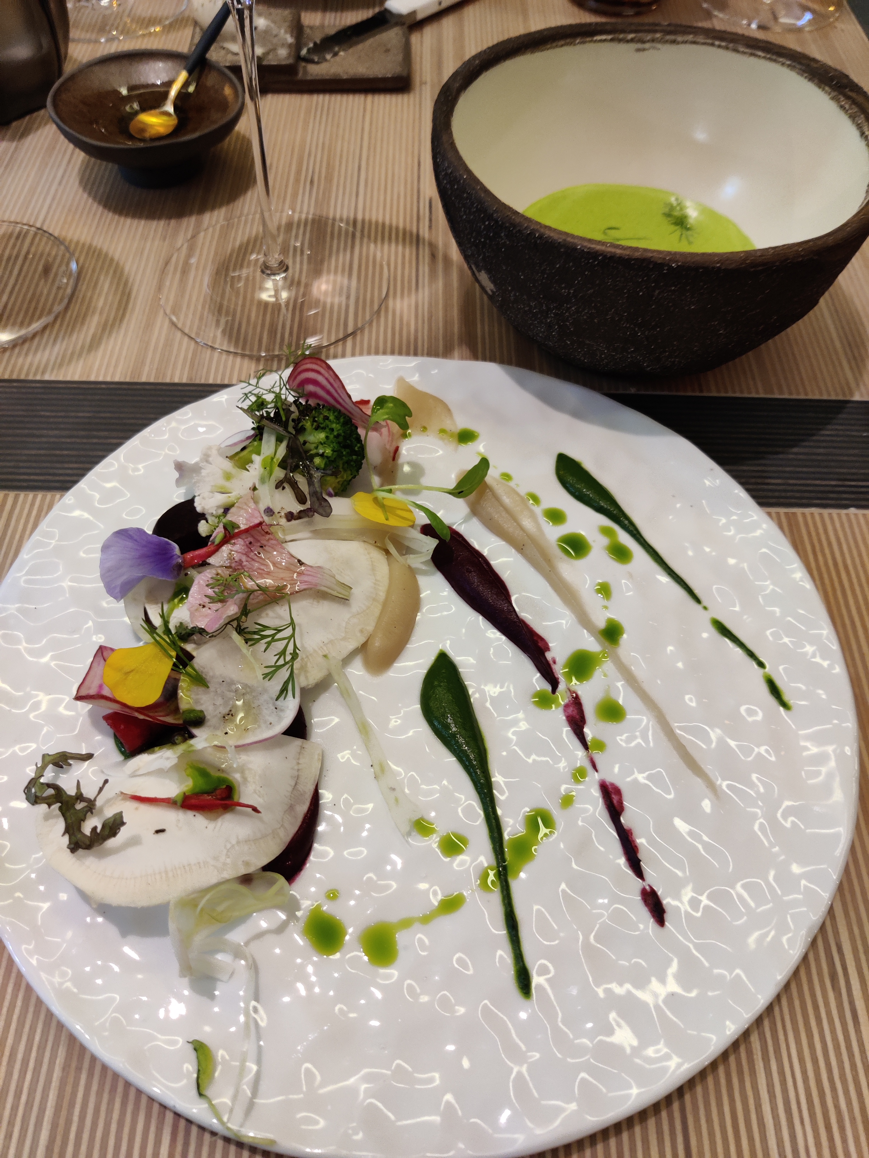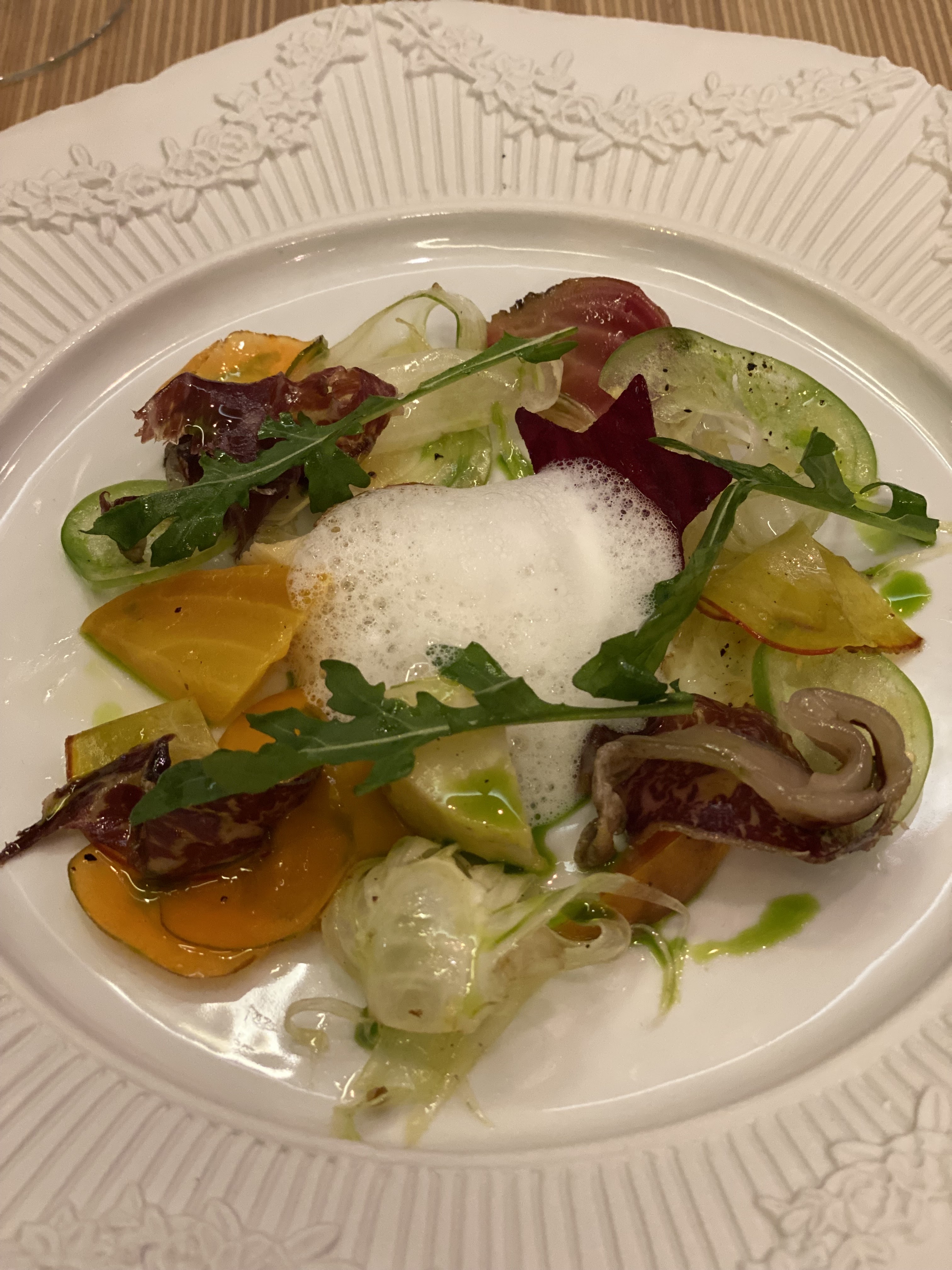 Dîner savoureux et beau - produits pas bon marché mais définitivement de qualité utilisés. Le fermier d'où provenaient les produits était également présent et nous a parlé. À mon avis, trop de service - de nombreux serveurs surveillent chaque mouvement que vous faites et remplissent votre verre d'eau après l'avoir mordu, vous ouvrant la porte des toilettes et vous aidant avec la chaise à chaque fois que vous vous levez ou vous asseyez. De plus, l'équipe de photographie professionnelle qui était là et qui photographiait et filmait le cuisinier et parfois nous-mêmes nous a fait nous sentir un peu incontrôlés et observés.