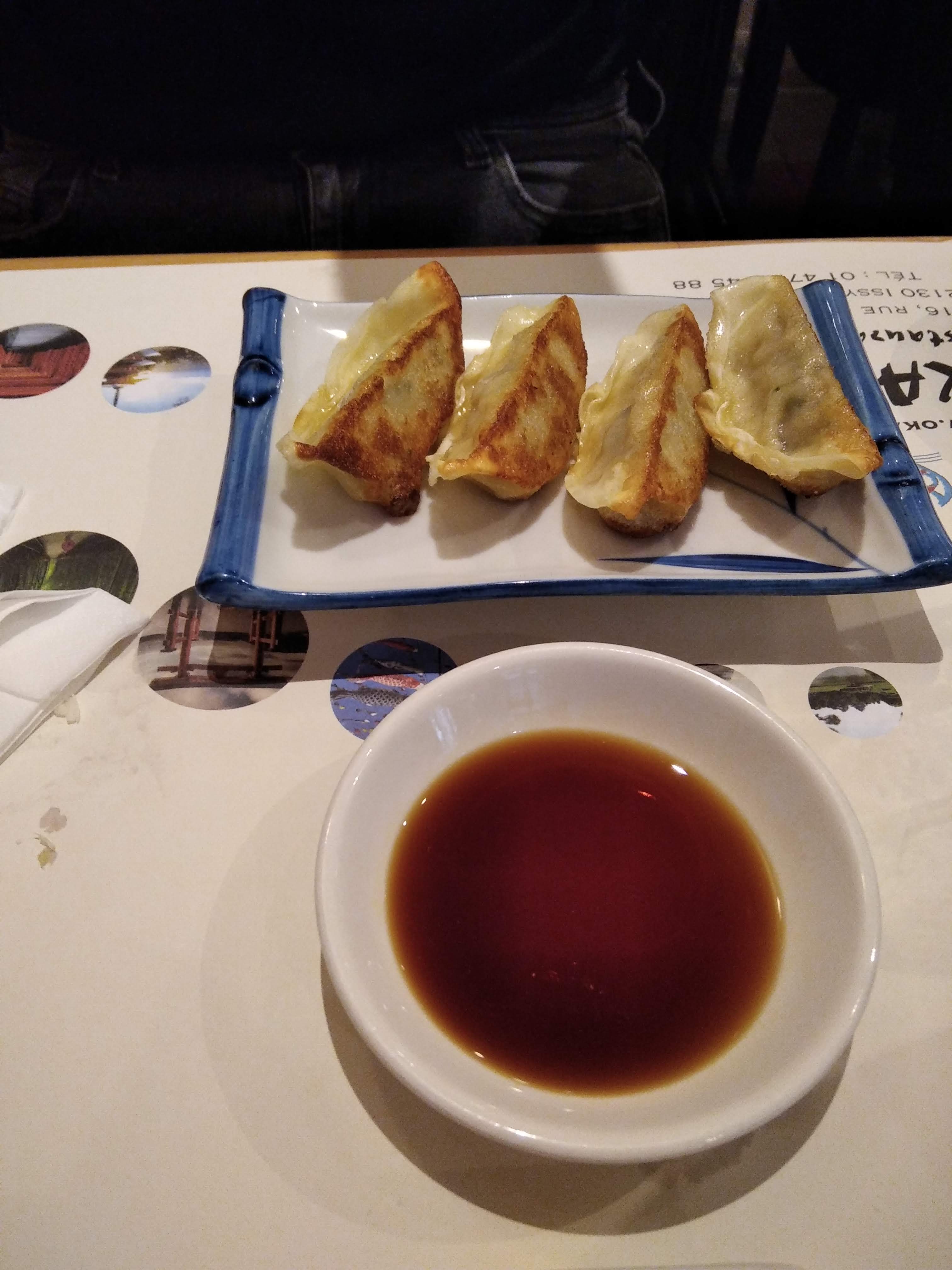Bonne cuisine japonaise Pour ma part jai pris le menu avec soupe miso, salade et gyoza + mochi Bon tarif en général pour les plats (12€ pour les gyoza) mis à part pour les mochi qui était à 6euro les 2 mochi
