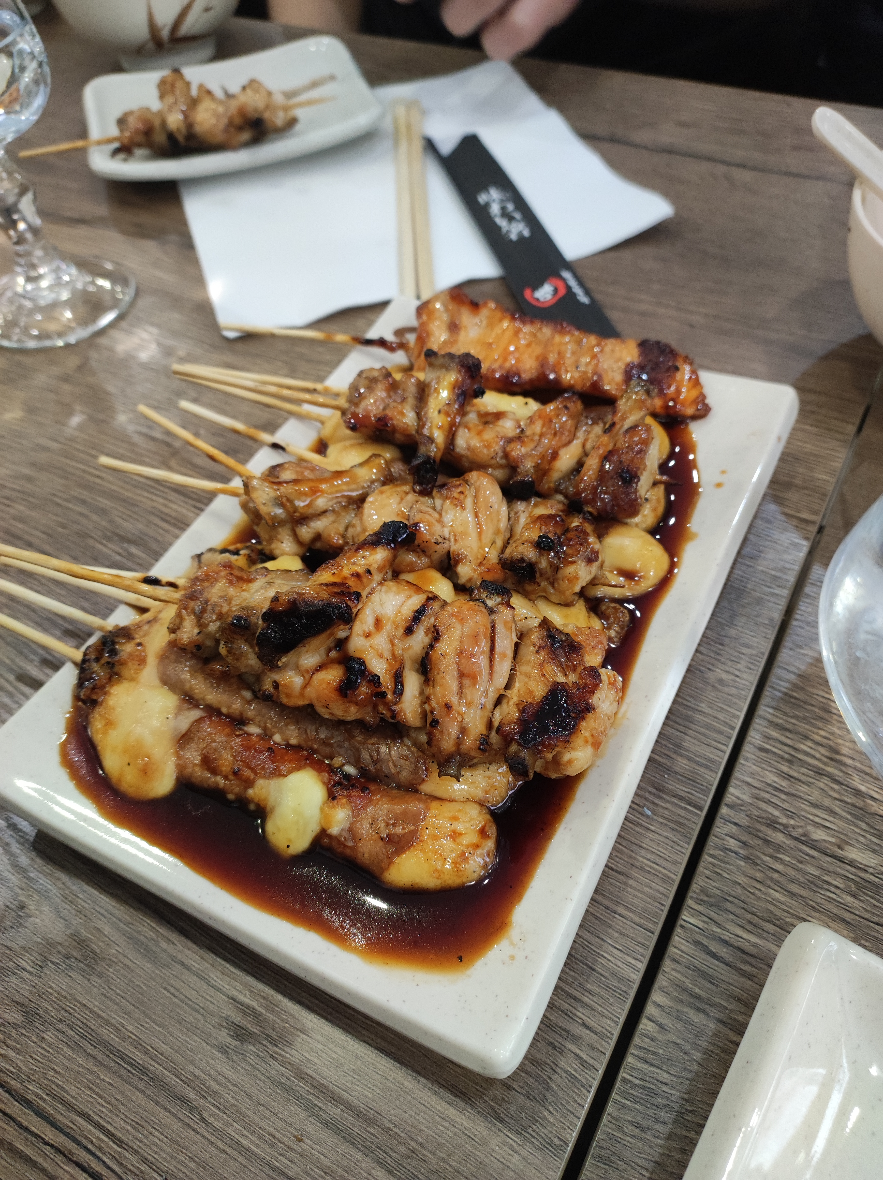 Menu du midi à 15,90 euros et 20,90 euros le soir. Commande de 5 plats servis à table à volonté. J'ai commandé 5 types de brochettes sans sauce. Ce sont des produits classiques par contre elles sont arrivées avec une cuisson parfaite... Une belle couleur légèrement grillée. C'est plus que ce qu'on attend d'un restaurant à volonté. Si j'ai une bonne faim, je sais où aller maintenant. 👍