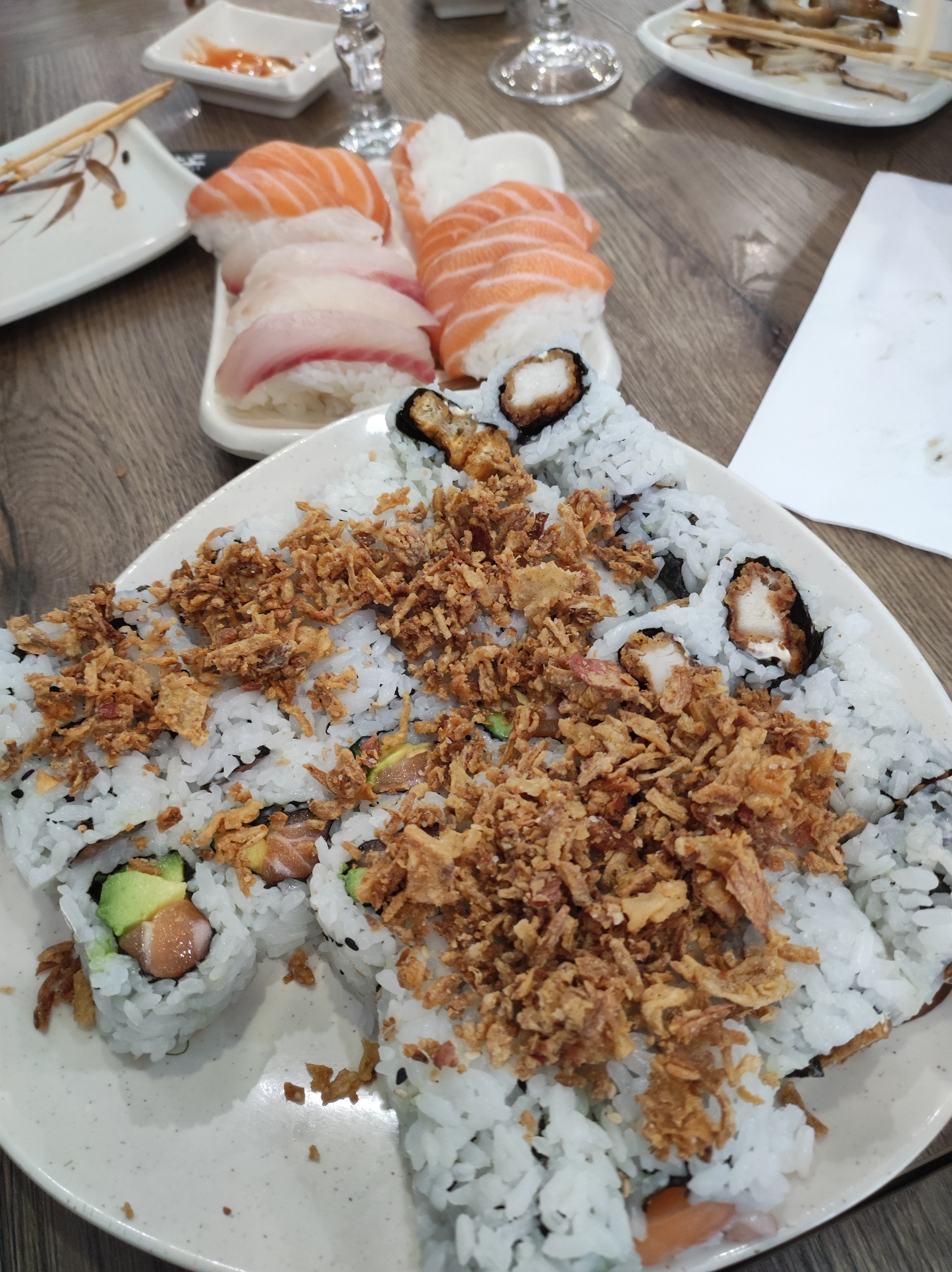 c'était super bon, le service est assez rapide (je n'ai pas pris en photo mais on commande avec des tablettes) le saumon est bon on sent qu'il est bien frais c'est très bien. au chaque commande c'est 5 choix par personnes mais on peut commander en limiter. je recommande ce restaurant.