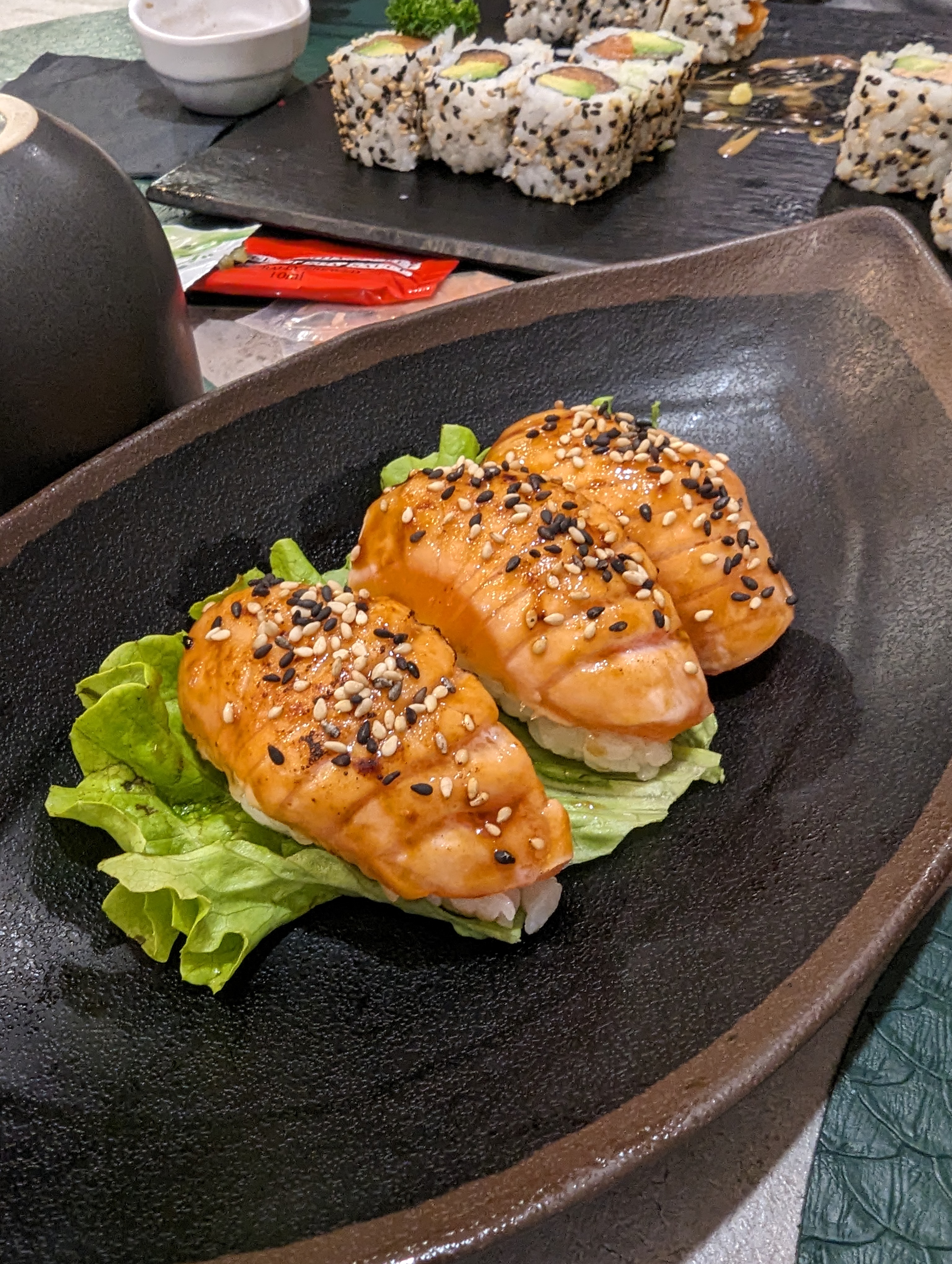Sushi plutôt bien équilibré entre le riz et la garniture. Le goût est bon mais il y a meilleurs dans le quartier. Je vous déconseille d'y aller à 5 personnes car il n'y a pas trop de place, à 4 on est bien installé. J'avoue que j'ai été surprise par la présence à l'accueil d'une personne en peignoir.