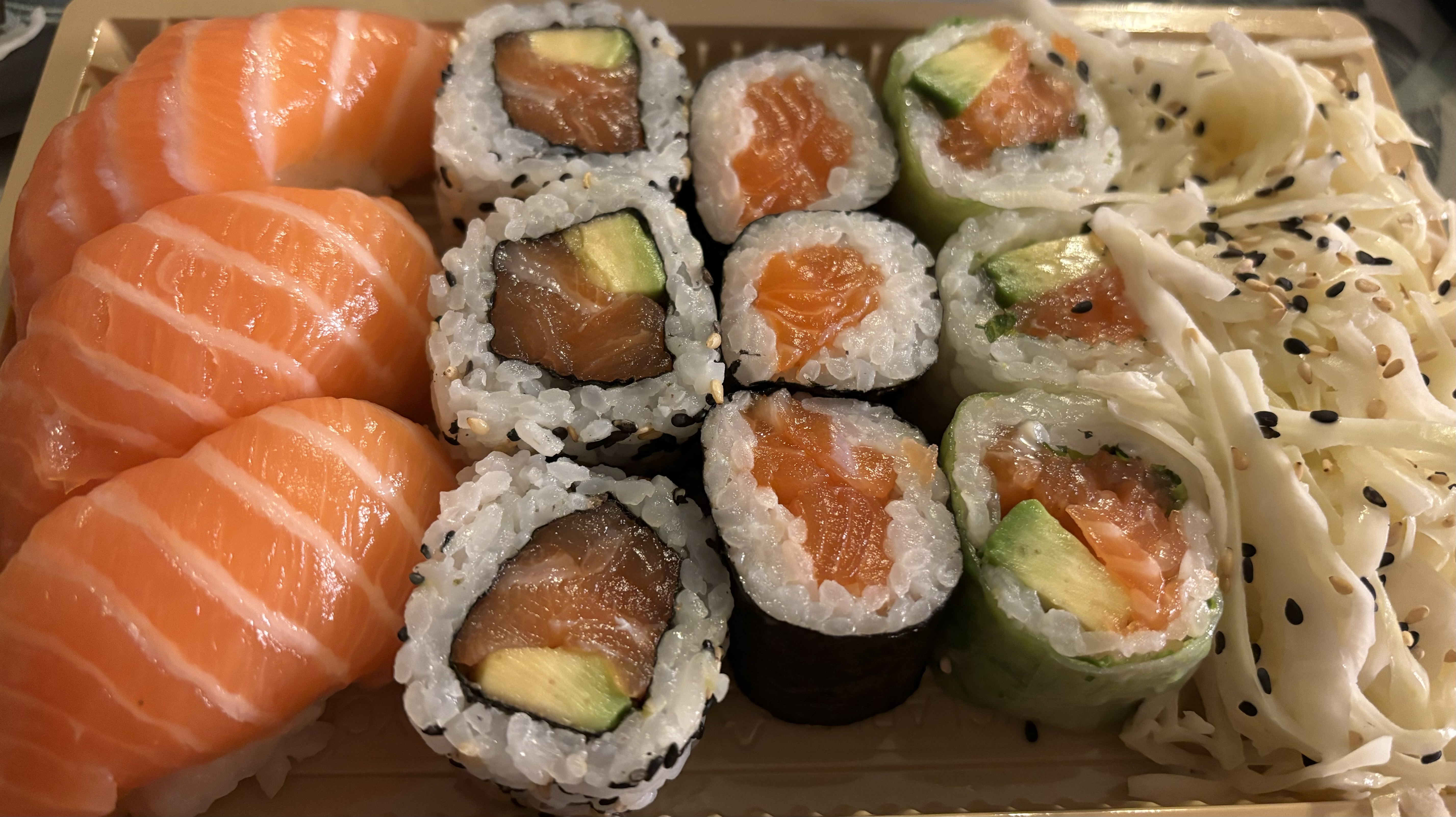 Agréablement surprît par commande en livraison , une box de 18 pièces généreuse. Très bons Rolls au fromage/saumon cuit , alors même que je ne suis pas friand normalement de ce genre d'innovation ! J'ai aussi gouté le sandwichs japonais , un Sando au saumon : lui aussi très complet , il aurait pu suffire à faire mon repas ! Merci à vous.