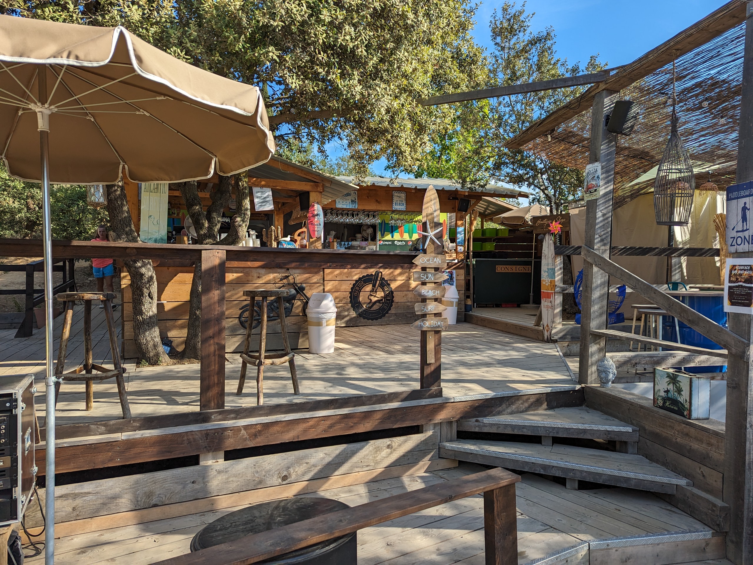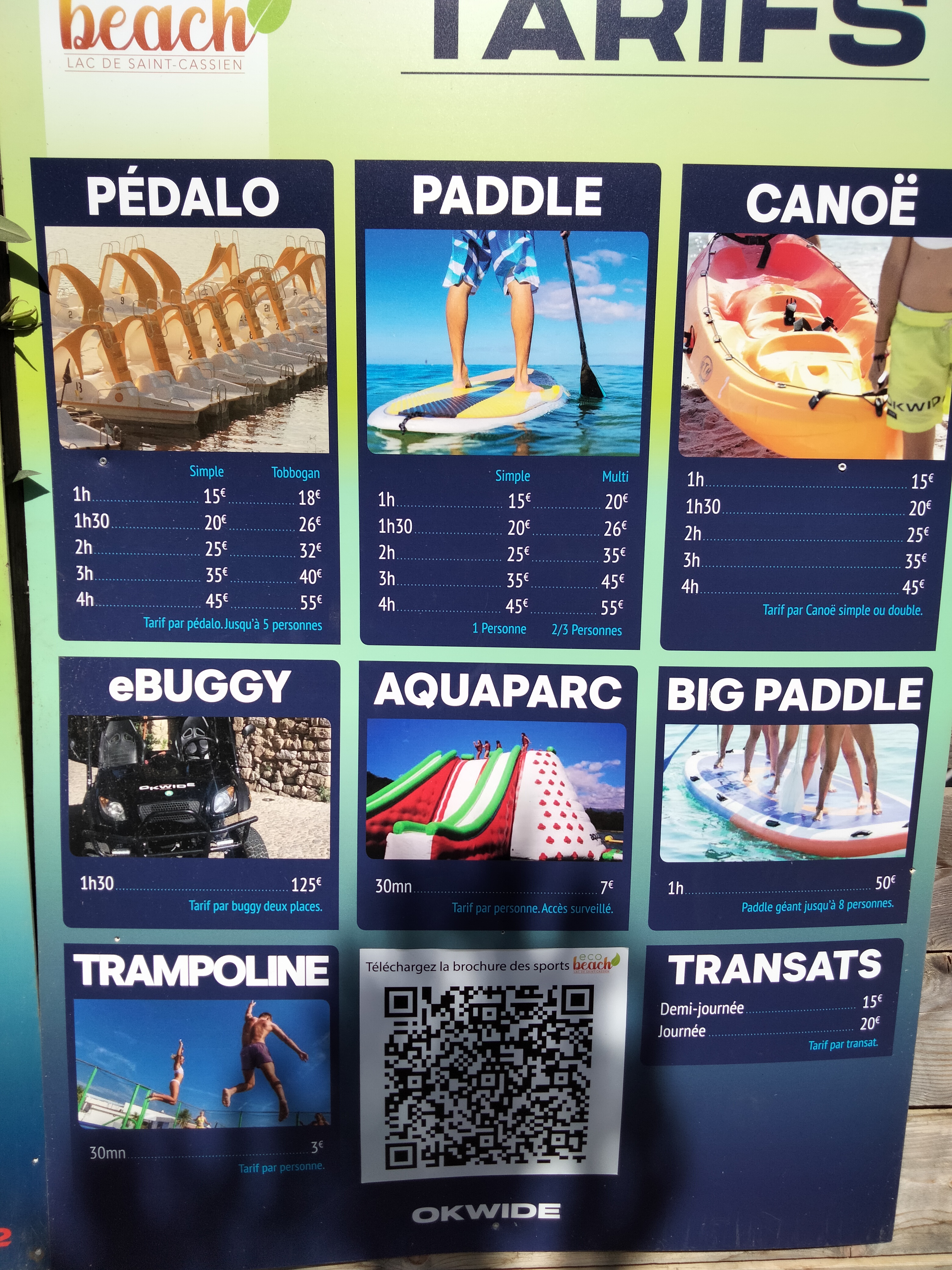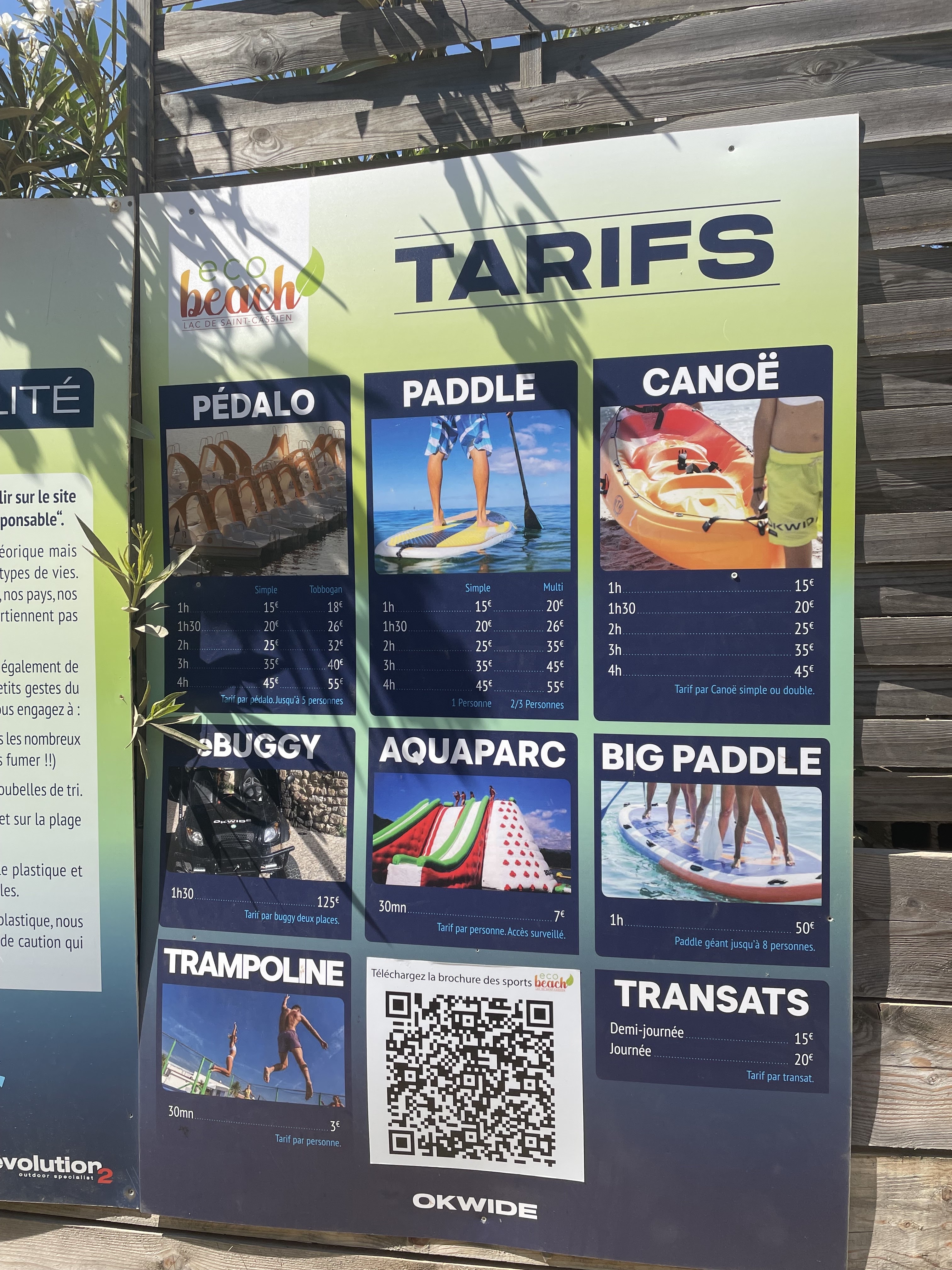 Okwide ecobeach était un lieu formidable il y a quelques années, un petit havre cocooning avec une équipe accessible et cool, et malheureusement le succès fait tout basculer comme d’hab, c’est à présent une usine qui pratique des prix dignes de Saint Tropez (5€ une glace magnum ou un pistoleros, 12€ un mojito etc redescendez un peu vous êtes à Montauroux! Même à saint maxime en bord de mer c’est moins cher!) qui propose des activités nautiques (parcours flottant) avec des installations tellement vieilles et en mauvais état que l’équipe doit regonfler les structures toutes les 20min car tout devient mou et impraticable c’est affreux. C’est criblé de patchs anticrevaison qui se détachent, bref… Ils misent tout sur le tourisme étranger qui ne compte pas les dépenses et en oublient que les locaux les font vivre le reste de l’année. Vous aviez un super concept, dommage de l’avoir dénaturé en oubliant l’essentiel….