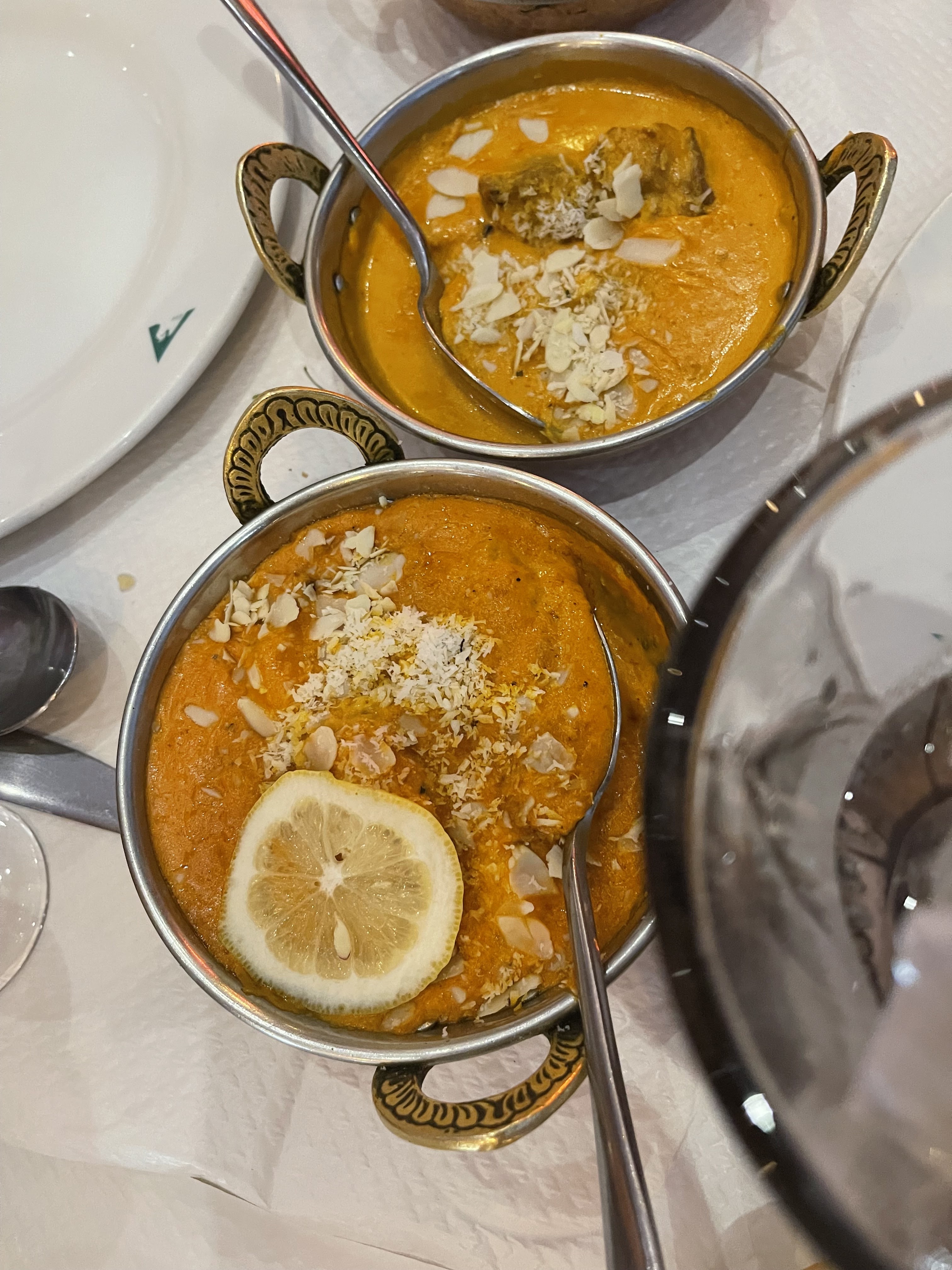 Samosa; trop de petits pois et peu de viande. Le plat curry d’agneau; l’accompagnement (riz) est en supplément 3€ complément incroyable. Le vin blanc 5€90 les 25 cl pas bon du tout voir imbuvable 👎👎👎 70€ pour 2 personne (très chère pour un resto indien) le personnel plutôt disponible et courtois.