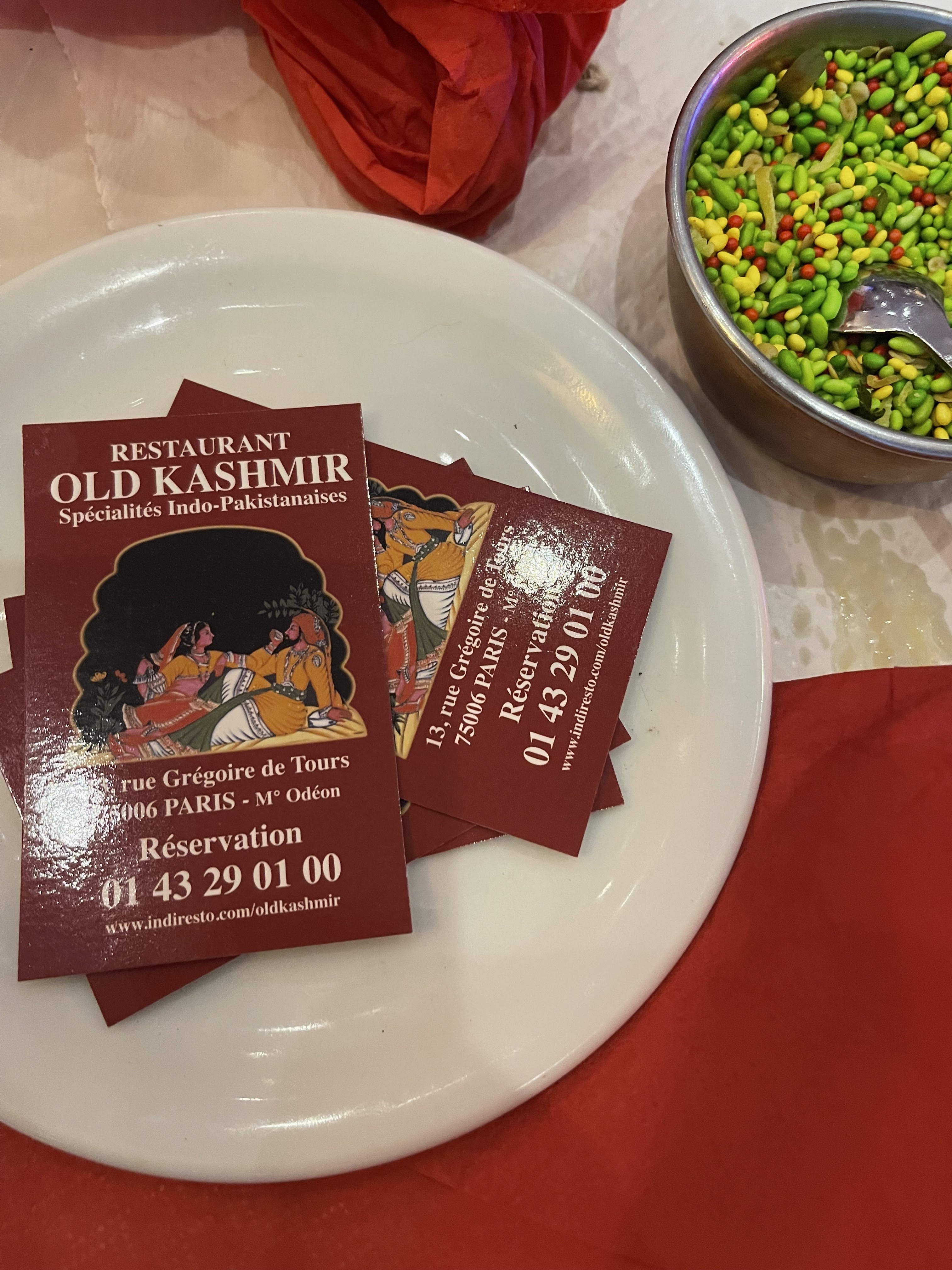 La nourriture était délicieuse, le service était rapide et très sympathique. J'ai eu le poulet punjabi et ce n'était pas trop chaud, mais juste ce qu'il fallait. Il est servi avec du riz et dans des assiettes détachées, donc si vous êtes entre amis, vous pourrez partager et goûter toutes les différentes saveurs. La seule chose à noter est qu'il est assez difficile à localiser car il est situé dans une ruelle étroite et comme la rue n'est même pas les tables ne sont parfois pas très stables. De plus, les boissons sont assez chères, donc je suggérerais de commander 1 litre d'eau à partager avec des amis, mais pour être honnête, les boissons sont chères partout à Paris. Ils proposent également de nombreuses options végétariennes qui ne sont pas seulement des salades, mais de véritables plats savoureux. Il y a aussi le wifi disponible et le code est au menu. La glace (au moins la pistache) est très savoureuse et pas trop crémeuse comme vous pouvez l'obtenir dans d'autres glaciers. Votre facture est servie avec des bonbons (photo ci-jointe) et des cartes de visite, que j'ai également photographiées. C'est définitivement un endroit que je vous recommande de visiter car c'est l'un des trésors cachés de Paris.