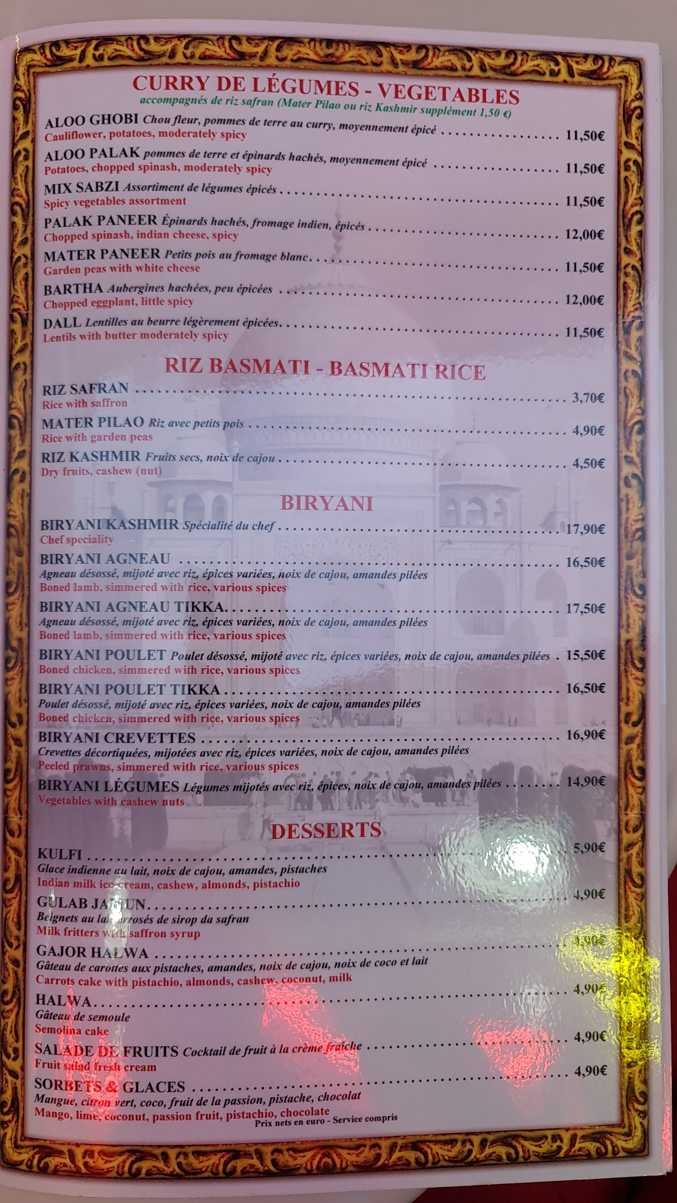 L'emplacement traditionnel vous amène instantanément en Inde, même si vous êtes au centre de Paris. Je suis venu dîner et il existe différents menus avec des prix et des goûts différents. J'ai mangé un délicieux sheek kebab servi avec trois sauces, et un bon riz (même s'il n'est pas très savoureux) au curry et au poulet. Les friandises traditionnelles sont un peu particulières, mais je pense que vous devriez les essayer à la place d'une glace ordinaire que l'on peut manger partout. Je recommande cet endroit pour sa bonne nourriture et son emplacement parfait.