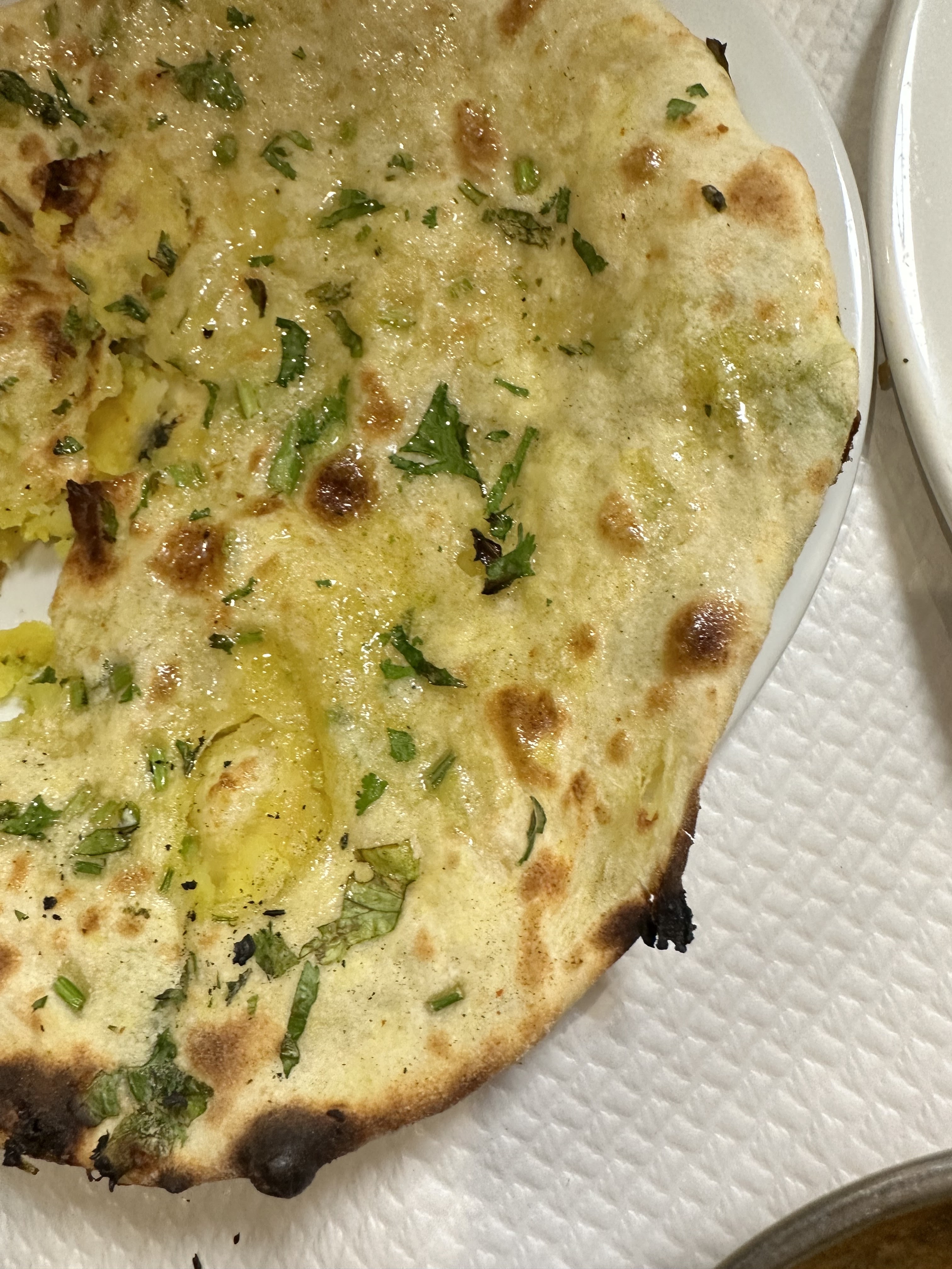 En fin de compte, c'était ok. Le bahja à l'oignon ne doit pas être confondu avec un bahji à l'oignon auquel je suis habitué. C'était des oignons fins frits. Nous avons mangé du tikka masala. Ma fille avait un tikka masala doux et le mien était épicé. Ils étaient tous les deux plutôt bons. Les pains naan à l'ail étaient petits mais ok. Le riz était bon.