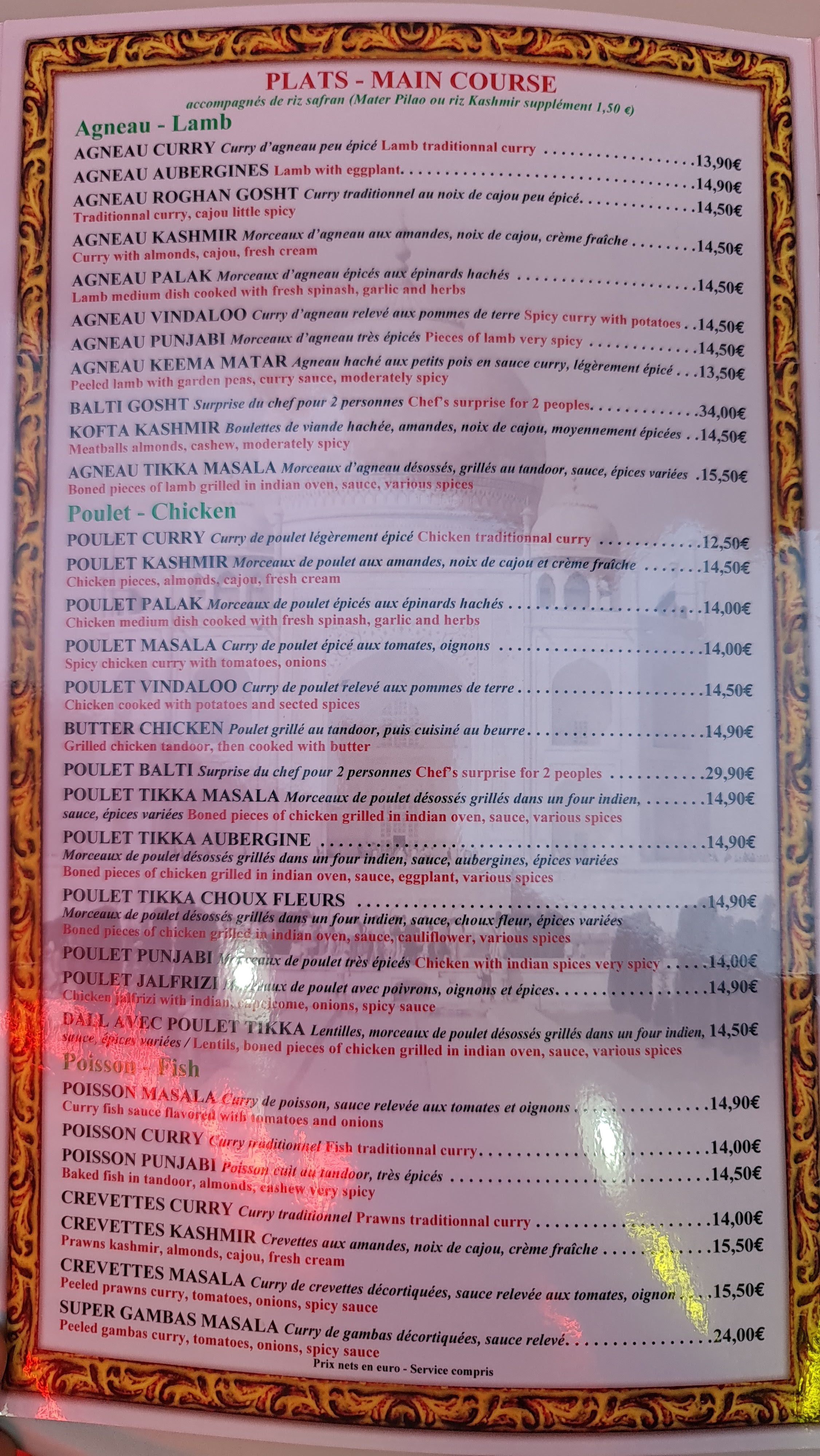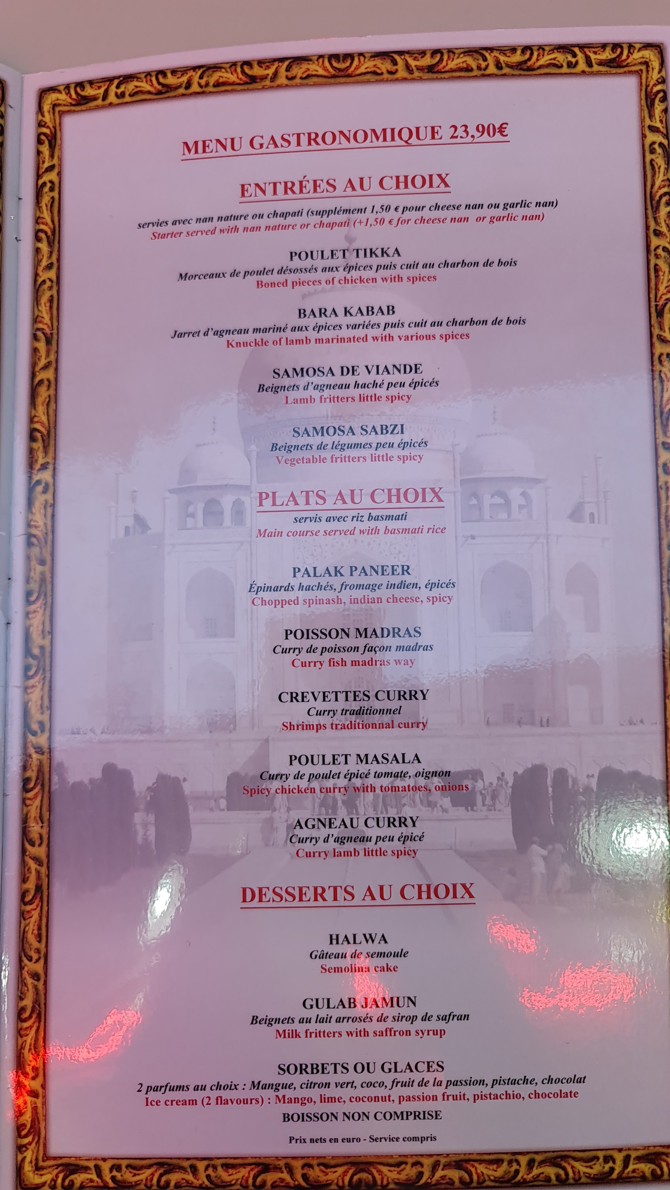 Indien classique sans fioritures. C est pas cher et correct mais loin d être gastronomique.