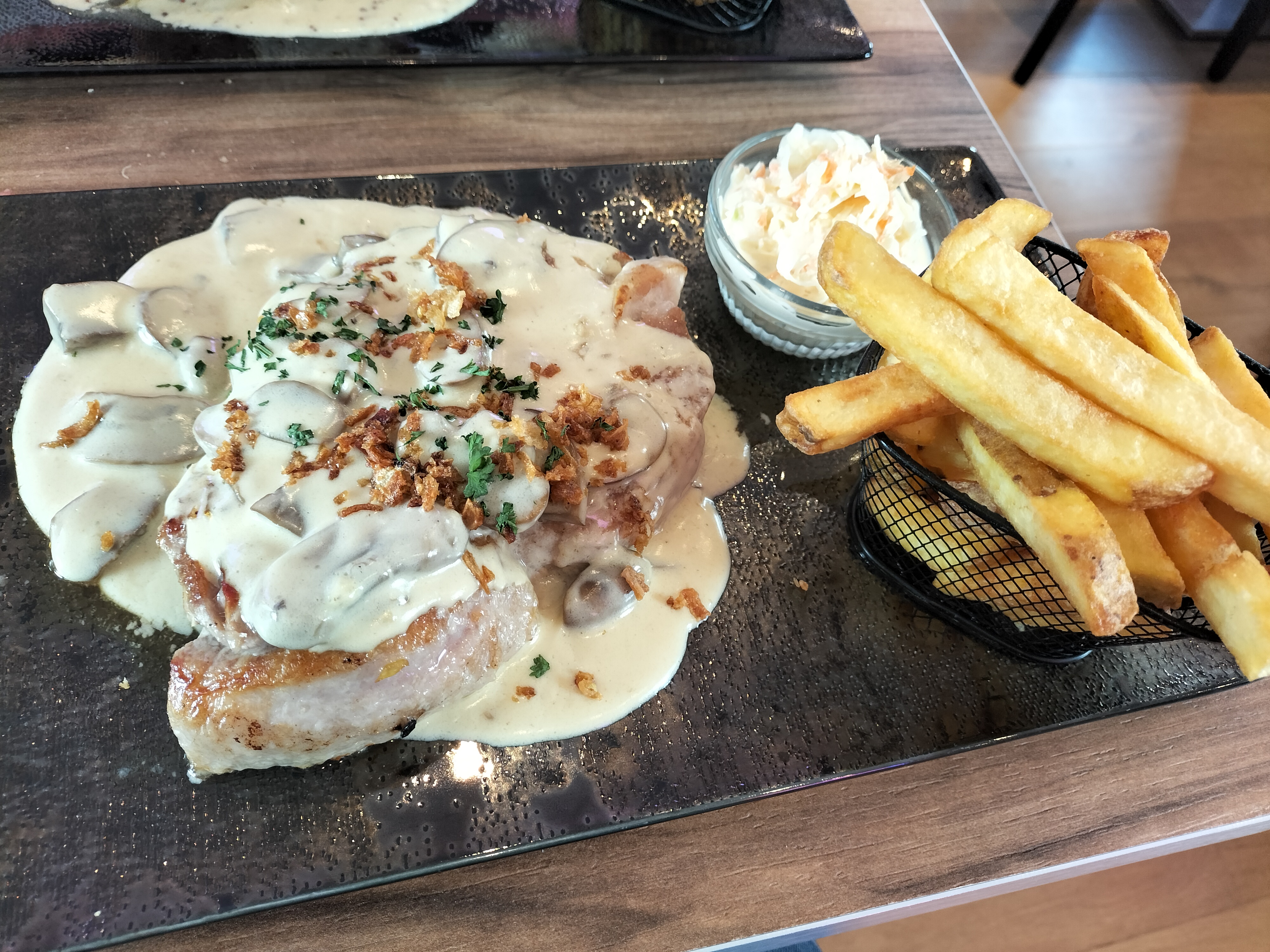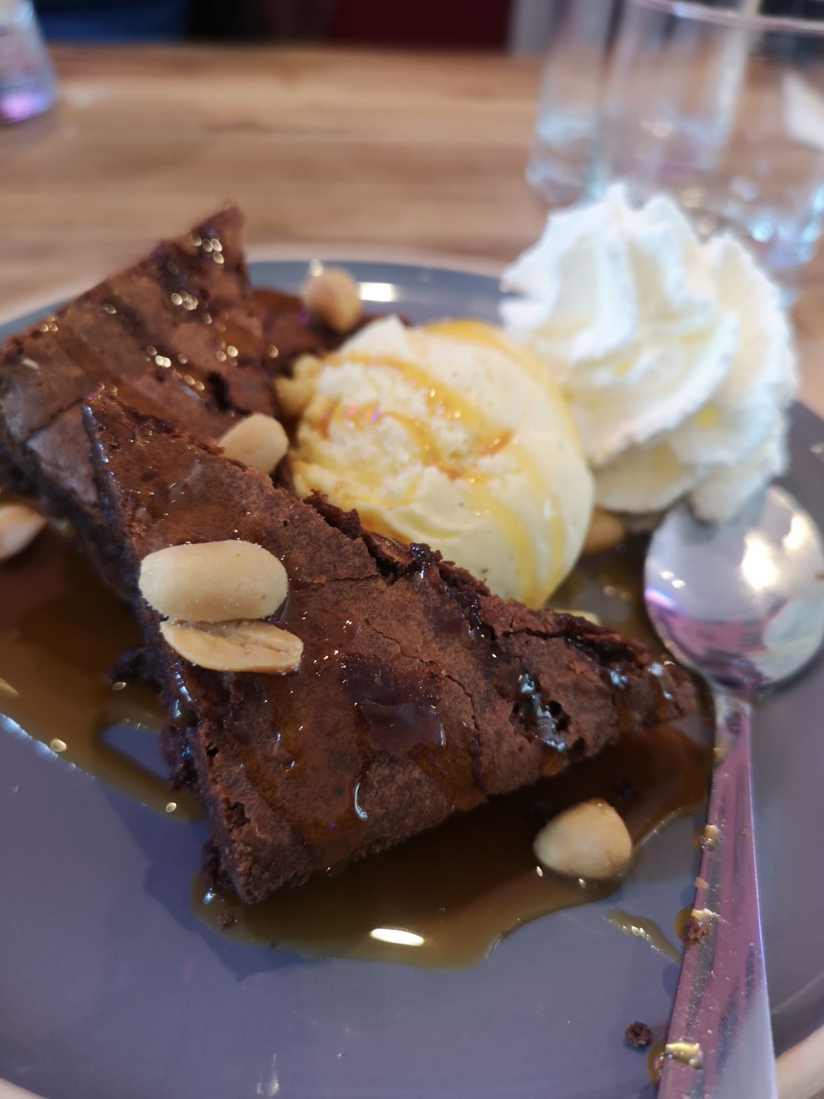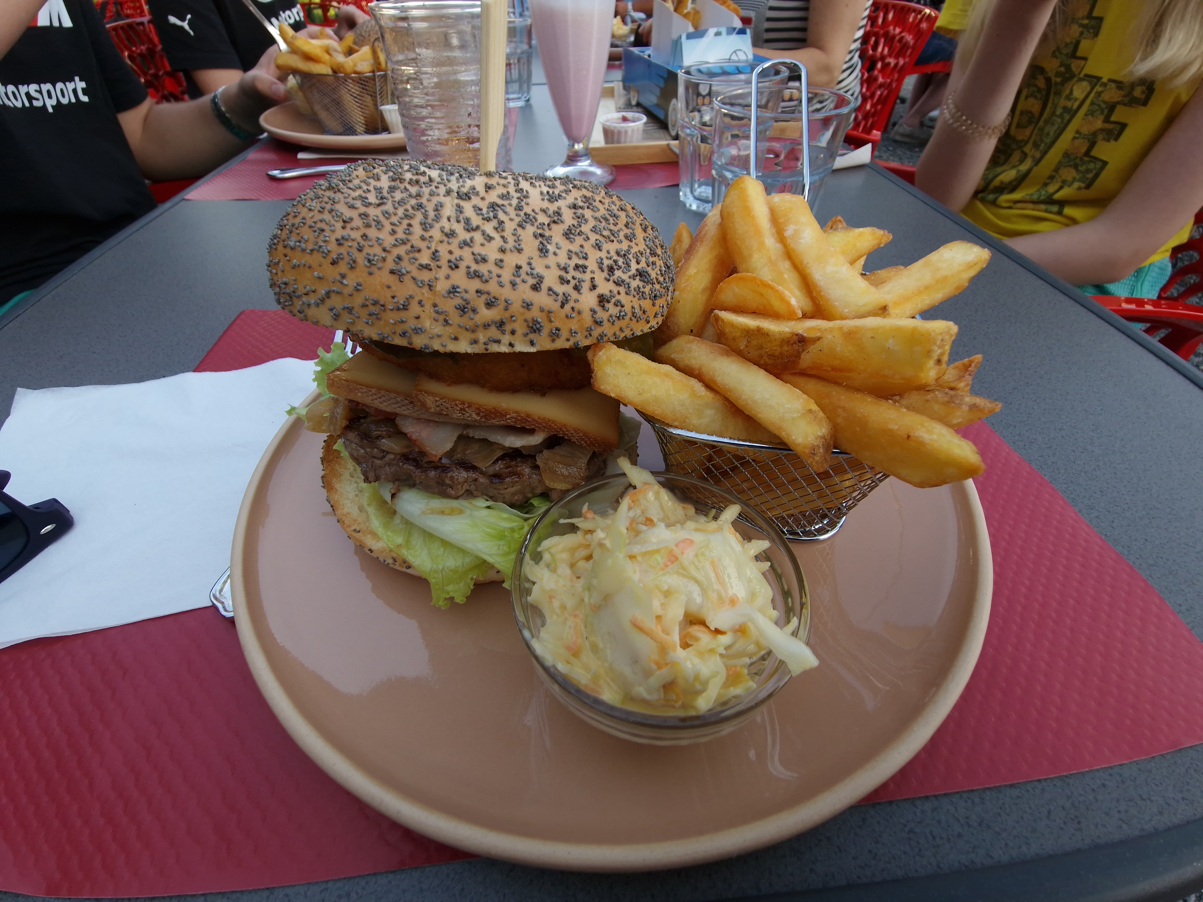 En cherchant un restaurant ouvert dans le quartier, nous nous sommes retrouvés au Old School Diner. Un restaurant décoré dans les années 50 américaines. L'intérieur ressemble à un restaurant américain de l'époque. À l'arrière, ils ont un grand jardin avec de nombreux sièges. Nous nous sommes assis dehors, à l'ombre du soleil du soir déjà couché. Le menu est - vous l'aurez deviné - américain. Milkshakes, snacks en entrée, hamburgers divers, mais aussi autres plats de viande. Le poisson est absent de la carte (sauf les moules à certaines périodes). Quelques-uns d'entre nous ont choisi le burger Smokey (voir photo). Il y a aussi une certaine influence française : quelques tranches de fromage français qui se fondent à merveille dans le burger. Le burger est assez petit, mais en tant qu'adulte/adolescent ayant de l'appétit, vous pouvez le manger. Nous avons beaucoup apprécié. Pour le dessert, il y avait des « glaces ». Ceux-ci sont très grands (voir photo). Après un plat principal, on imagine facilement en commander un et demander 2 cuillères à manger à deux. Dans l'ensemble, c'est un bon repas pour un prix raisonnable.