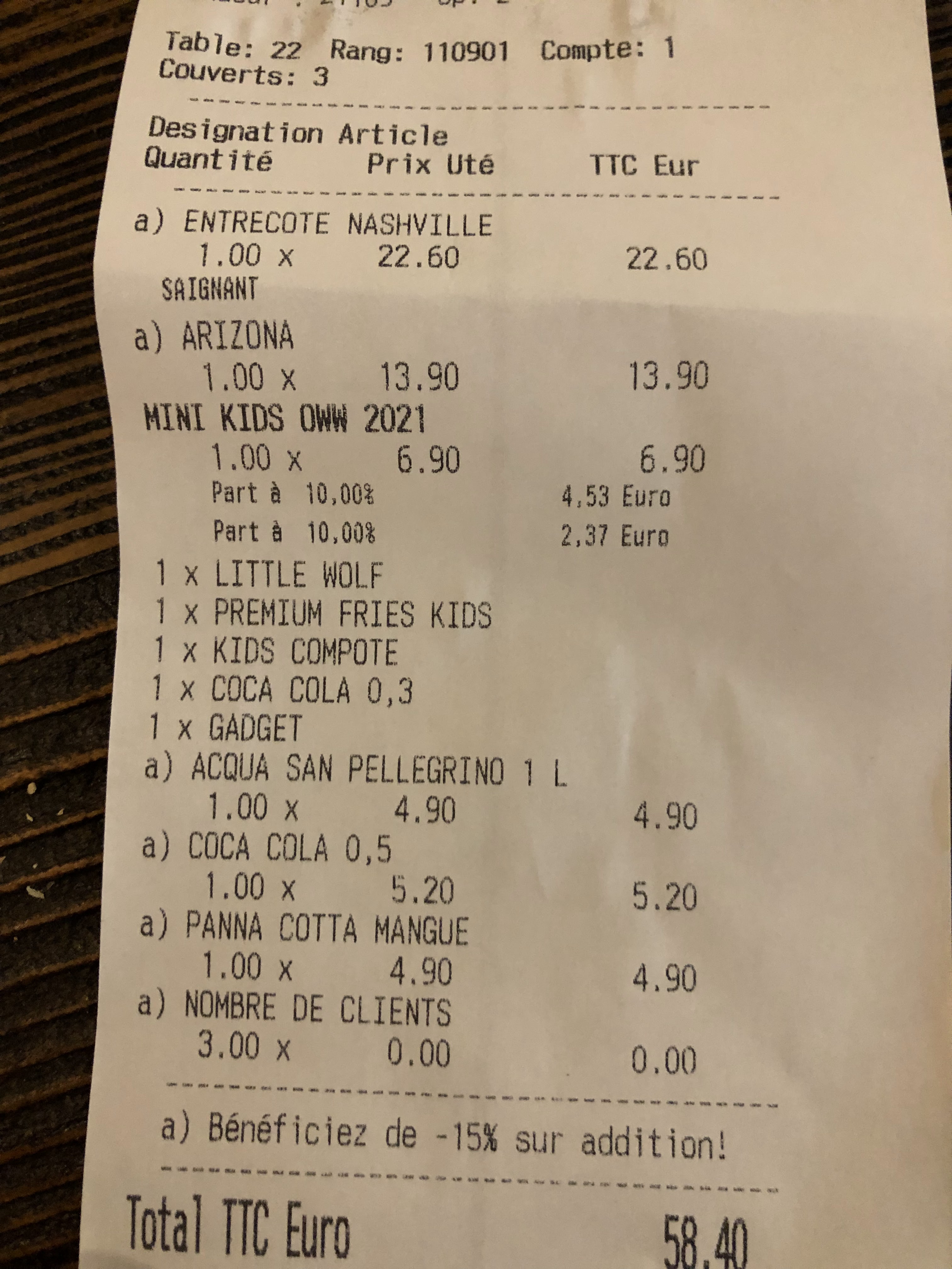 Bonjour à tous conseils d’amis méfiez-vous de ce restaurant en apparence très bien mais en réalité dans l’assiette rien entrecôte Nashville une horreur soi-disant 200 g 😱 mensonge j’ai eu un petit bout de steak, le dessert de ma fille à yaourt Lidl mais j’ai oublié 1,5 euro la sauce barbecue 😡 Tu demandes un coca elle addition tu t’aperçois que coca coûte 5,20 € franchement éviter surtout qu’à côté restaurant très copieux