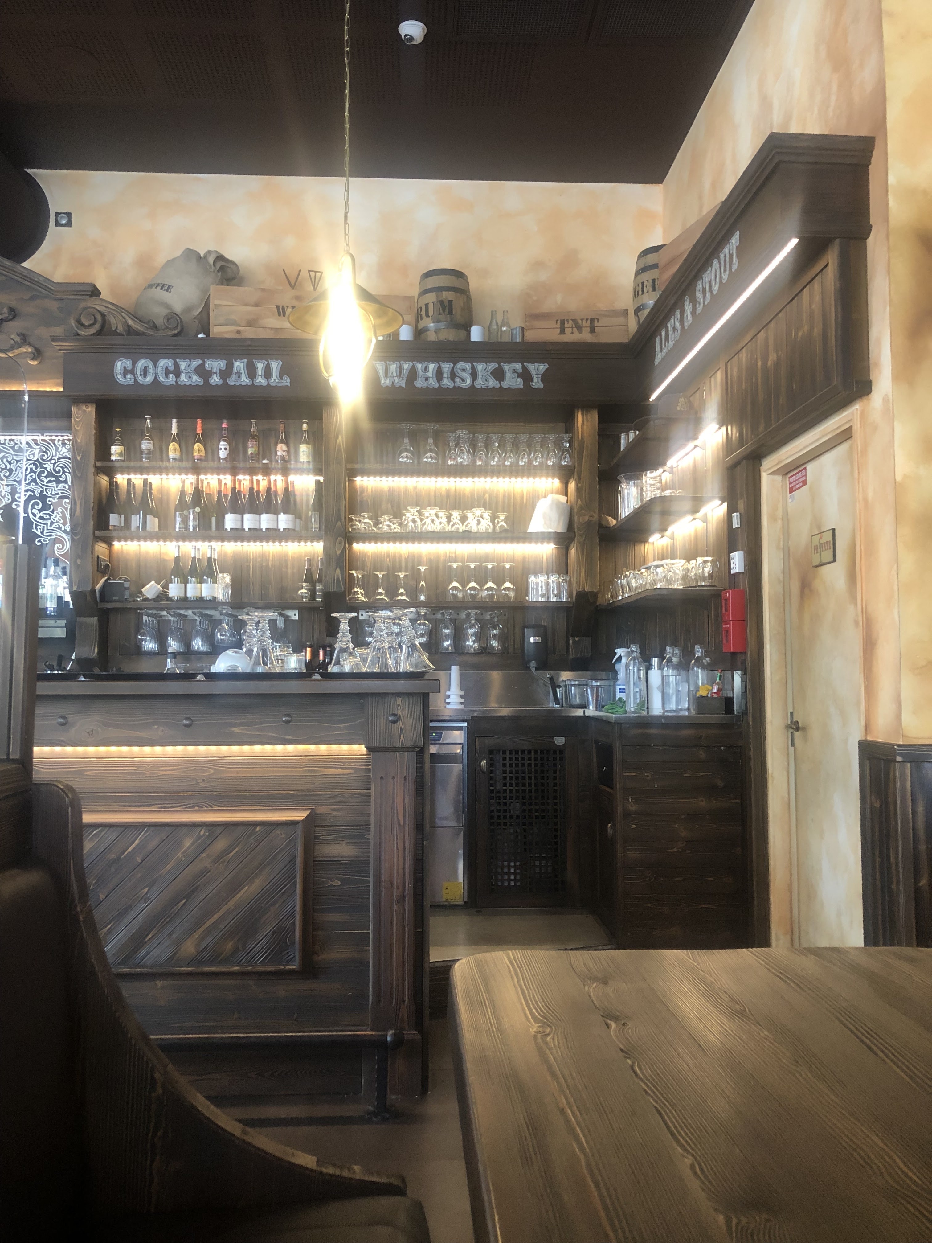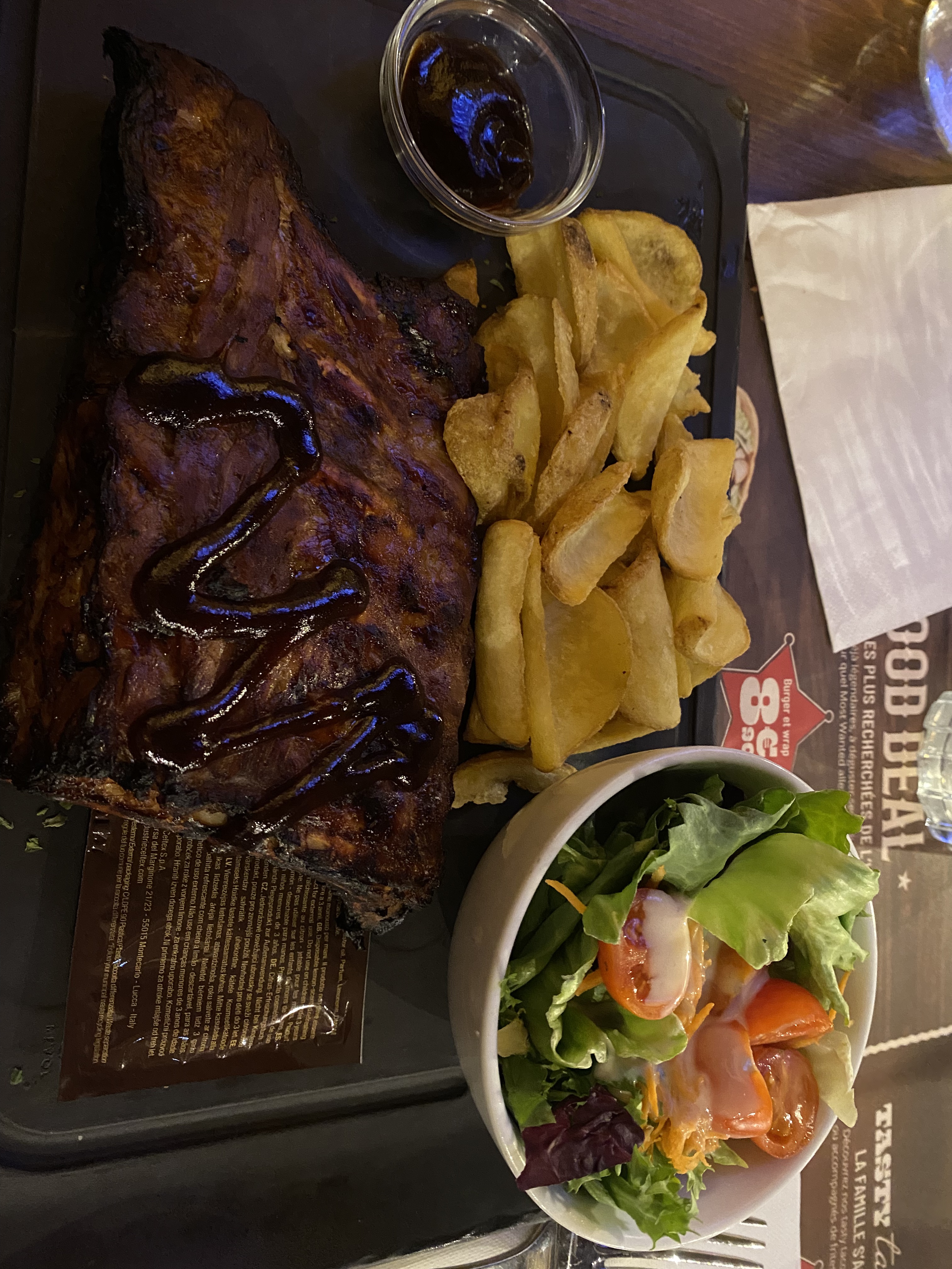 Lieu sympas dès l'entrée, des selles de chevaux en présentation! Les toilettes ne sont malheureusement pas très propre mais avec une double vasque atypique. Une décoration originale dans le thème western avec des ambiances par zone, '' Indian people '' avec des Tipis, zone ''Pioneers'' avec des calèches et d'autres zones aussi originaux. Niveau repas, j'ai testé le '' BBQ RIB '', assez bon mes amis ont testés les BURGER, sincèrement rien d'exceptionnel. Pour le dessert, amateur de panna cotta aux fruits rouges était beaucoup trop sucré. Attention, Il faut être patient car le service est très long pour le ''BBQ RIB''. Nous avons attendu 20 min les burgers et 1h les plats de Ribs. (Frite froide). Sinon j'ai passé une très bonne soirée le lieu est agréable. Je reviendrai pour boire un verre le bar est super. Bonne soirée