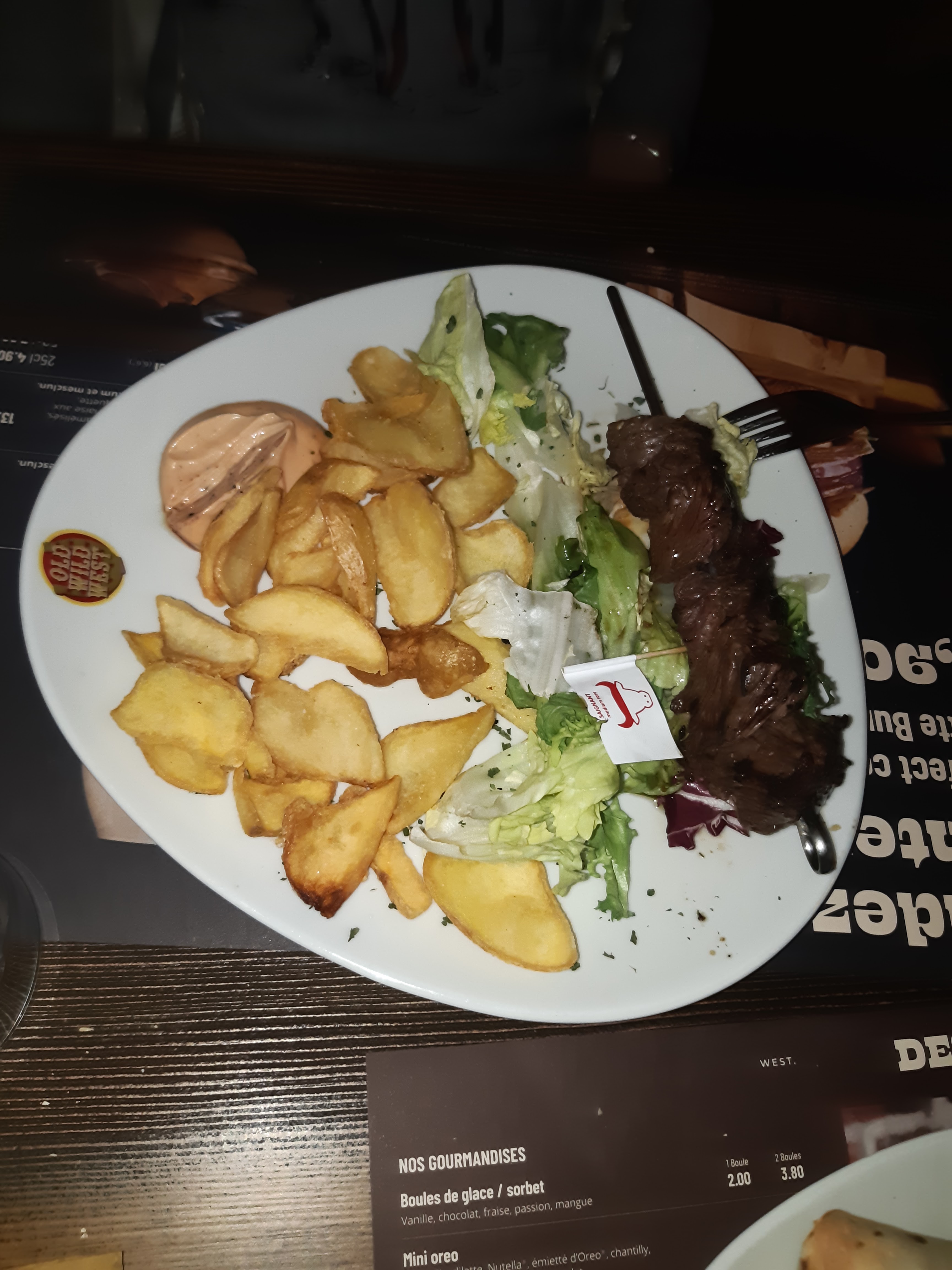 Très mauvaise expérience au Old Wild West. Déjà nous sommes 3 et le personnel nous installe sur une table de 2. Nous avons eu les cacahuètes tout de suite. Nous avons attendu 15 minutes pour qu'une serveuse vienne prendre notre commande de boissons. Puis 20 minutes pour les avoir. Pour le plat, n'en parlons pas, nous avons attendu 1h et les plats étaient froids et chers pour la qualité des produits. Ils avaient aussi oublié les frites pour un plat. Nous avons décidé de ne pas prendre de dessert vu le temps d'attente. Même pour régler l'addition on a dû attendre 10 minutes. L'organisation de la salle et de la cuisine est vraiment à revoir.