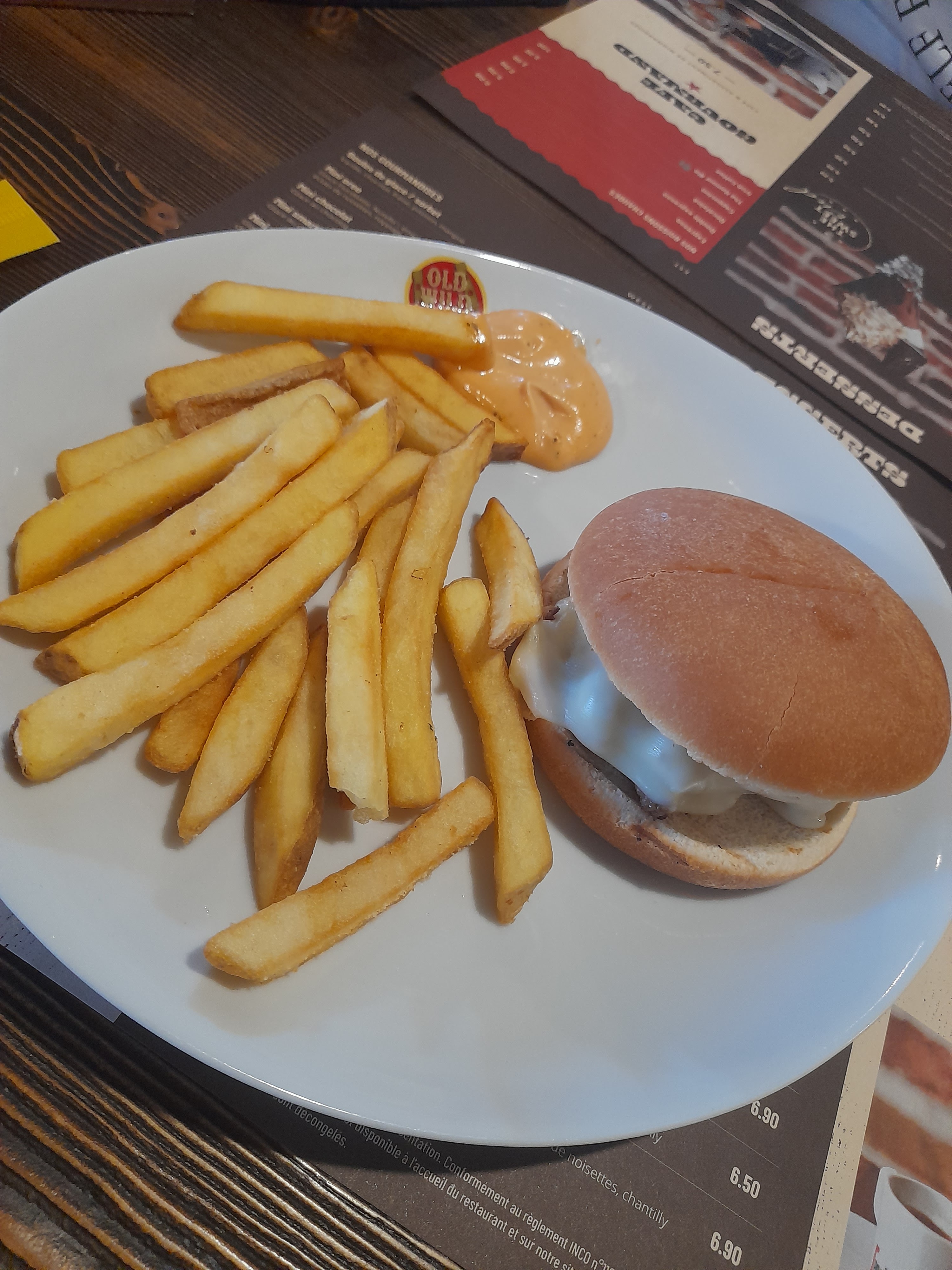 L' accueil et le service sont agréables. L' ambiance est familiale. Terrasse extérieure (avec toile d araignée) Le burger que j' ai mangé n' était pas ouf, manque de générosité, il était froid, plus de pain que de garniture. La cuillère de sauce pour les frites dans l' assiette était durcie, l' assiette avait été préparée sûrement à l' avance. Je ne l ai d' ailleurs pas touchée. Je n' ai pas mangé de bon cœur et n' y retournerai pas.