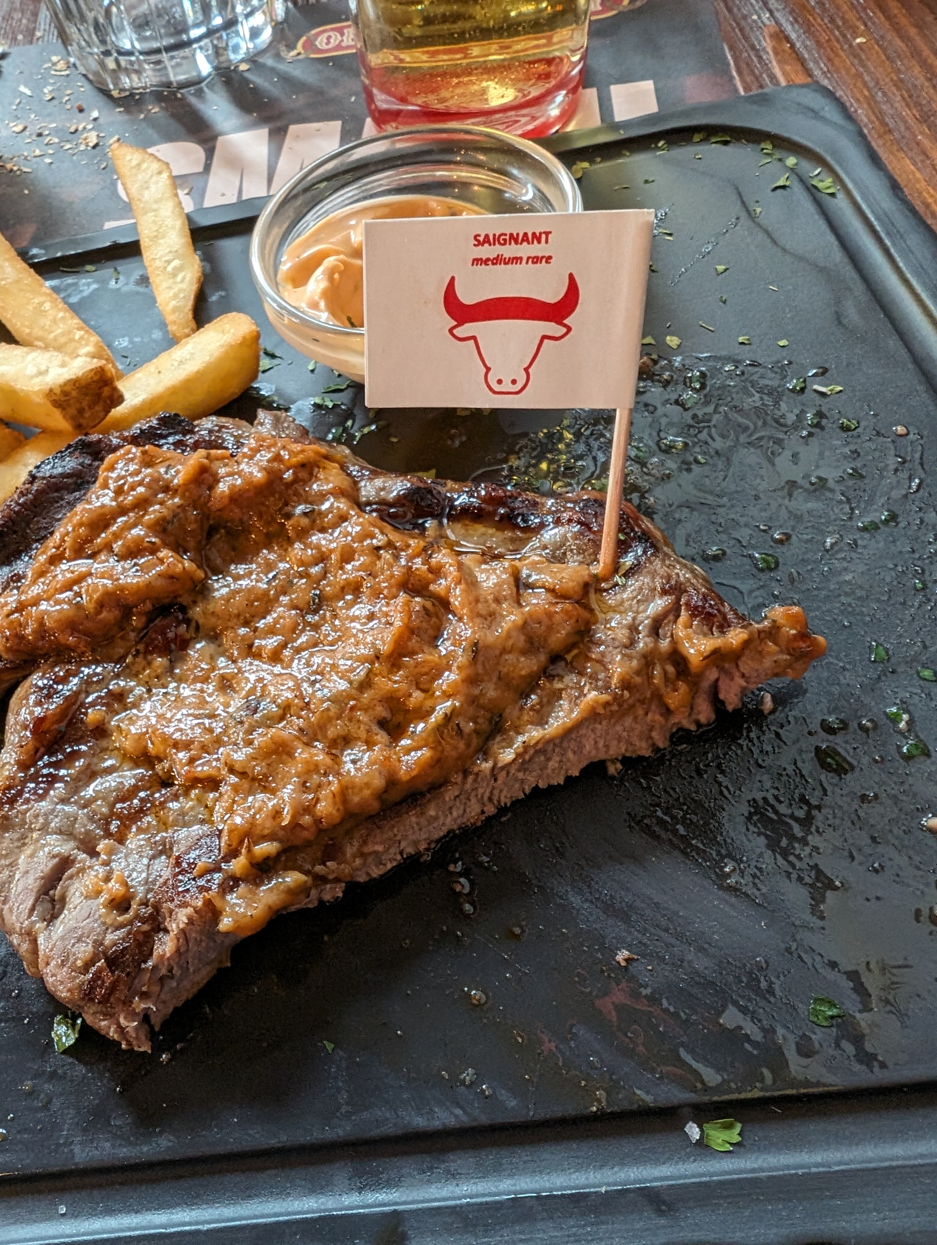 Service lent, ça discute au comptoir. Pavé de bœuf de 180gr je me retrouve avec deux petites bavettes de 50gr trop cuite. 3 frittes 1 feuille de salade un mini pot de sauce. Dans une ambiance cantine a 30cm de la table d'à côté.