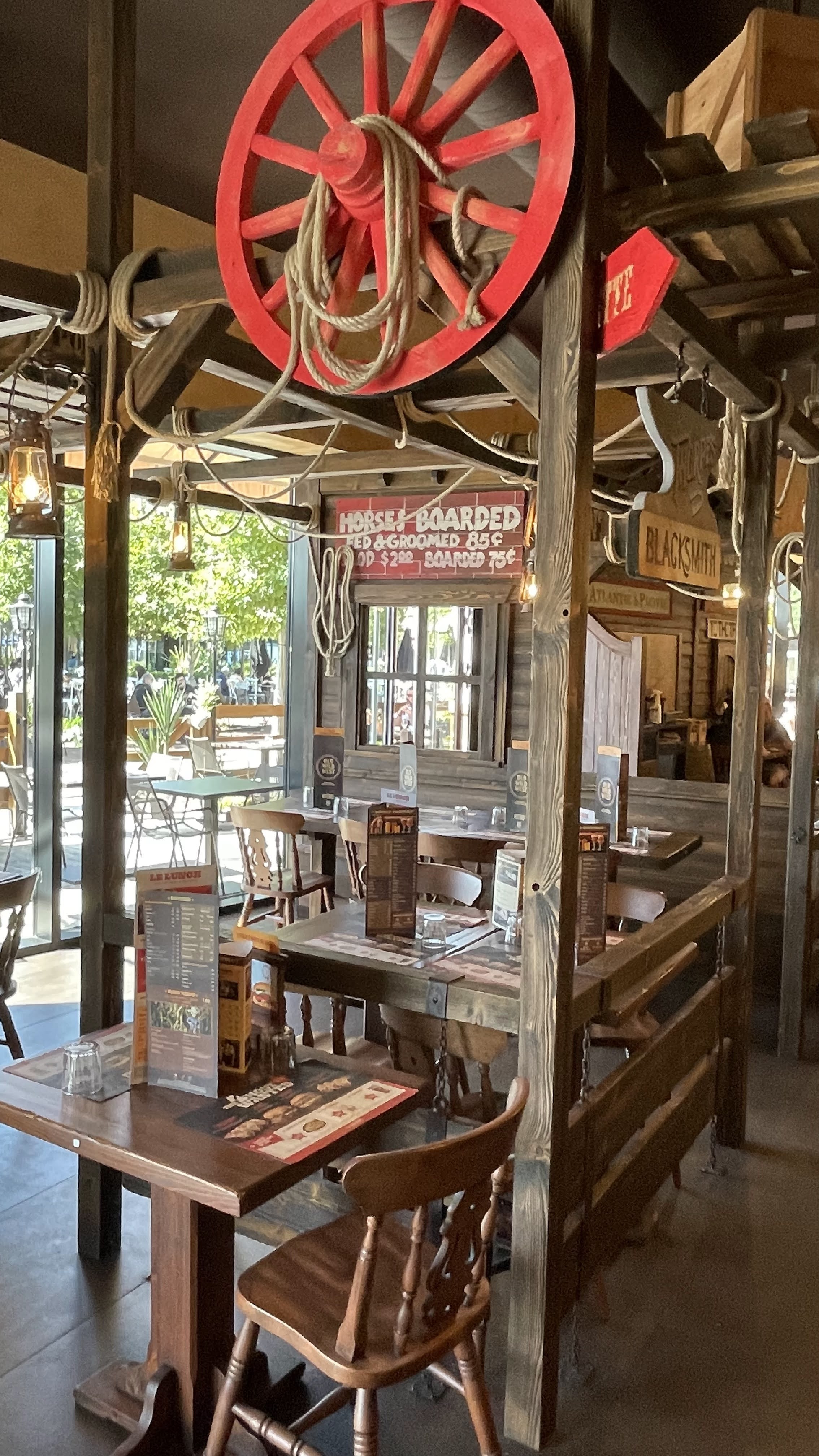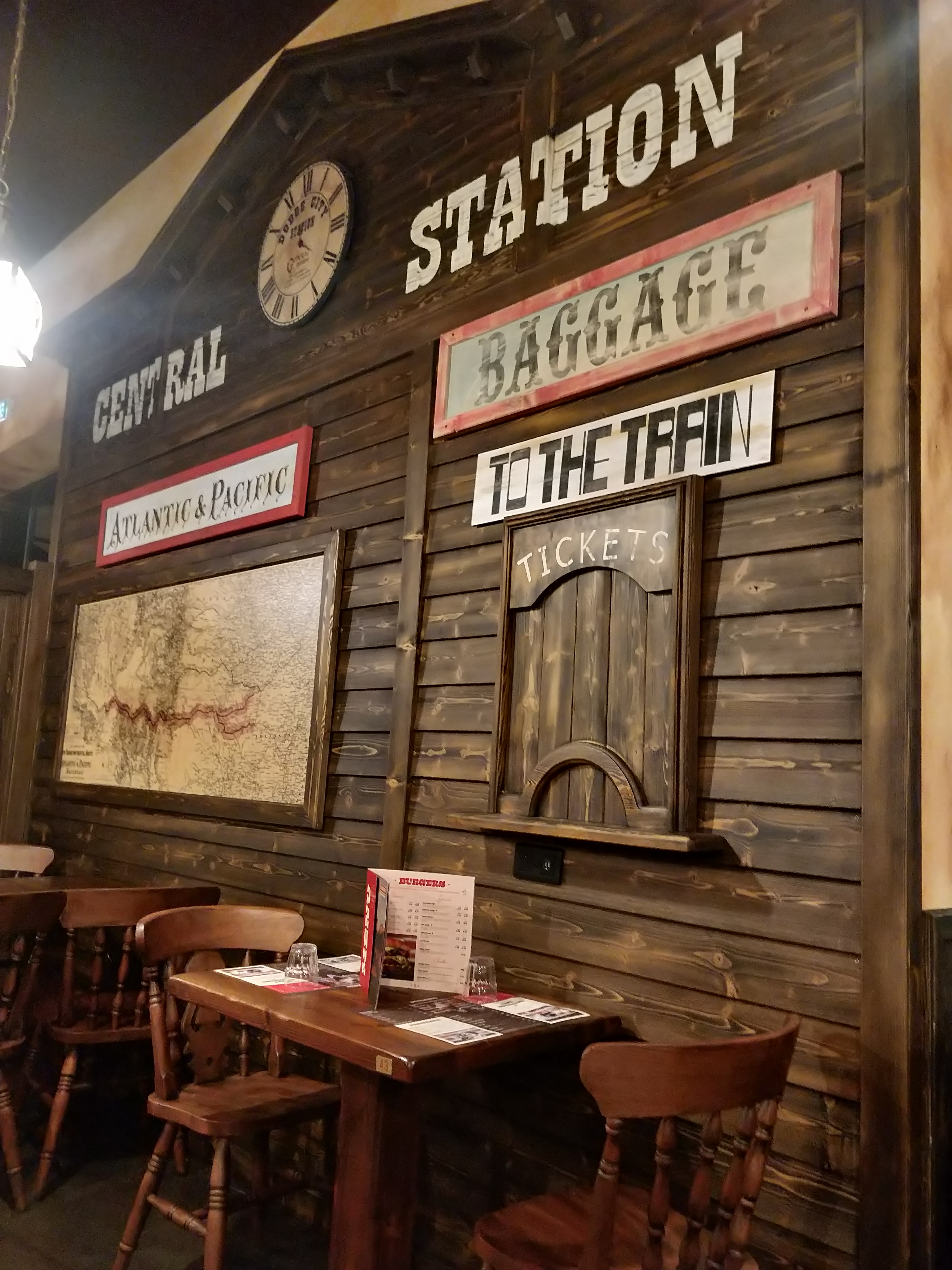 On s'attend à de la musique western on a le droit a un mix entre fun radio et chérie FM ont peut faire mieux. Les télés diffusent du foot d'il y a 5 mois un petit western ne ferait pas de mal. Restaurant presque vide et malheureusement collés les uns aux autres. Sinon la restauration burgers sont bons et le service est correct.