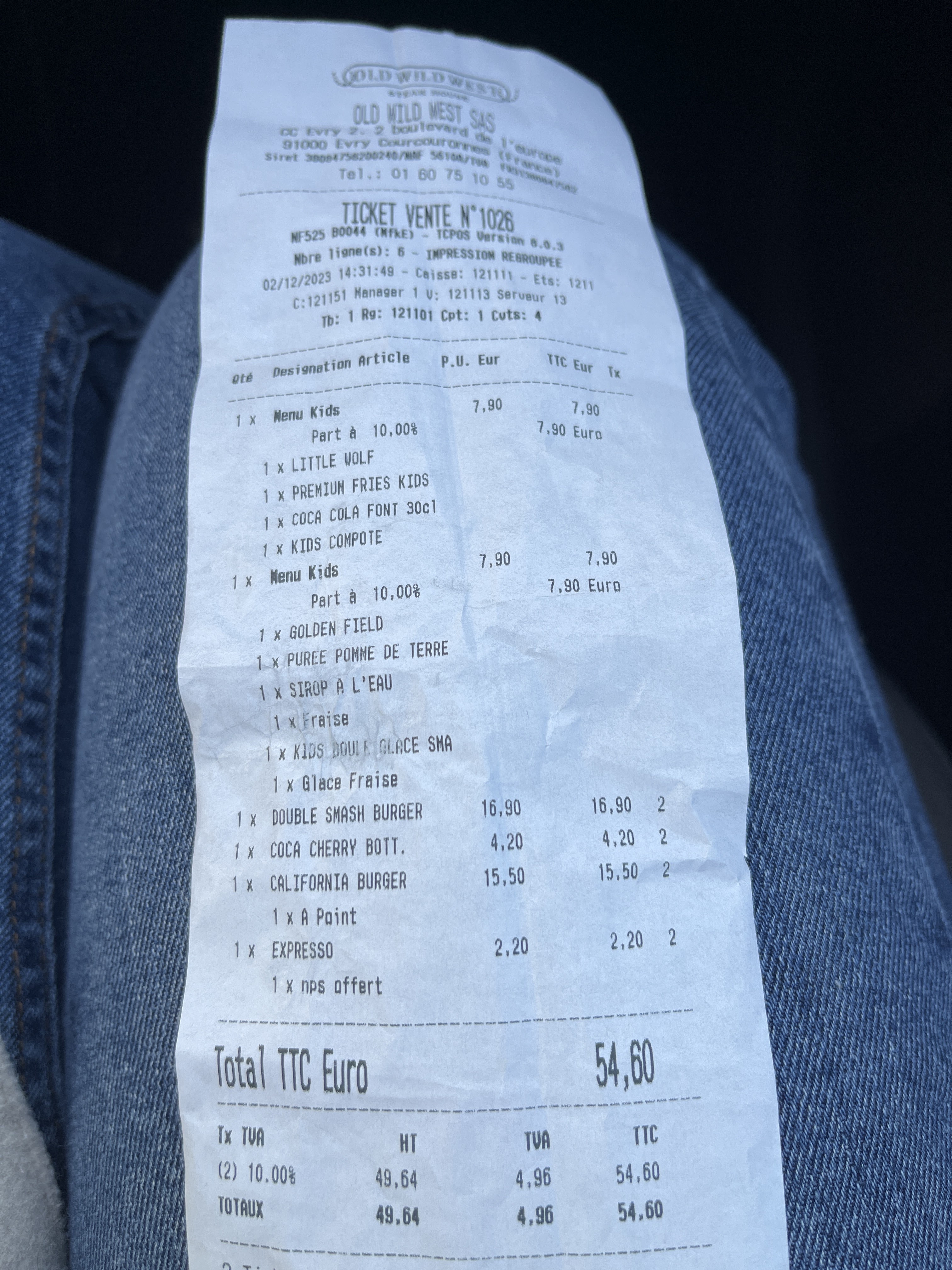 Restaurant plutôt sympa à première vue avec une déco typique. Serveur et serveuses aimable par contre service très LONG. Le filet de poulet et la purée de pomme de terre dans le menu kids est à fuir, réchauffée au micro onde car arrivé gelé. Nos autres plats qui étaient des burgers étaient très bons ! Le plus gros problème fut le petit post sur la table qui vous dis qu’un café vous est offert si vous prenez le temps de répondre à un questionnaire. Chose faite, mon café est en commande mais je l’attends toujours.. Nous sommes partis tellement l’attente était longue , mon mari règle l’addition et nous partons ET c’est à ce moment la en regardant le ticket qu’on se rends compte que le café offert ( noté sur le ticket ) est finalement totalisé dans la globalité du ticket . J’y suis retournée et me suis faite rembourser. Faites donc attention parce que je pense que la plupart des gens se font avoir. Je vous joins la photo du ticket et vous pourrez constater par vous même.