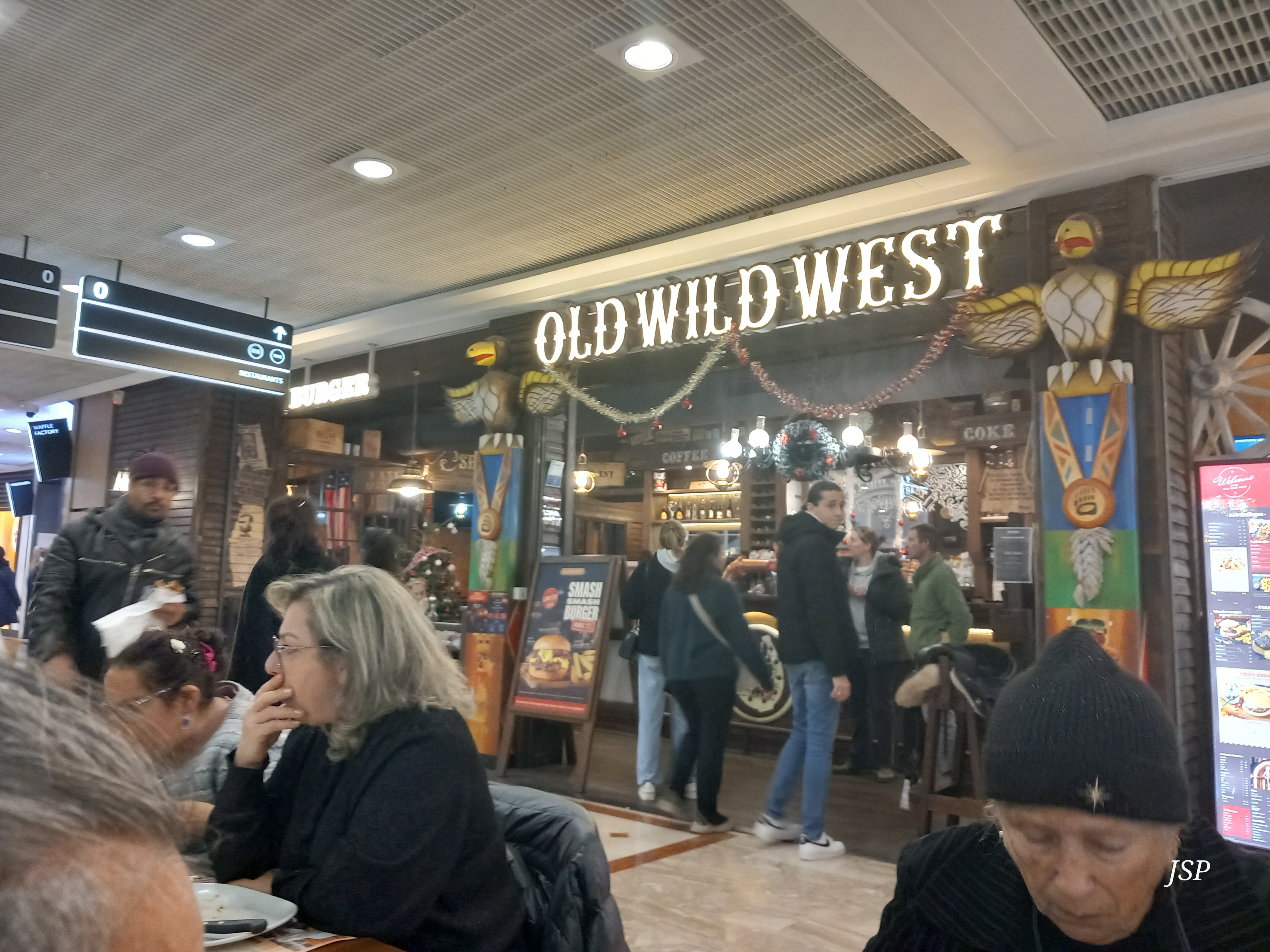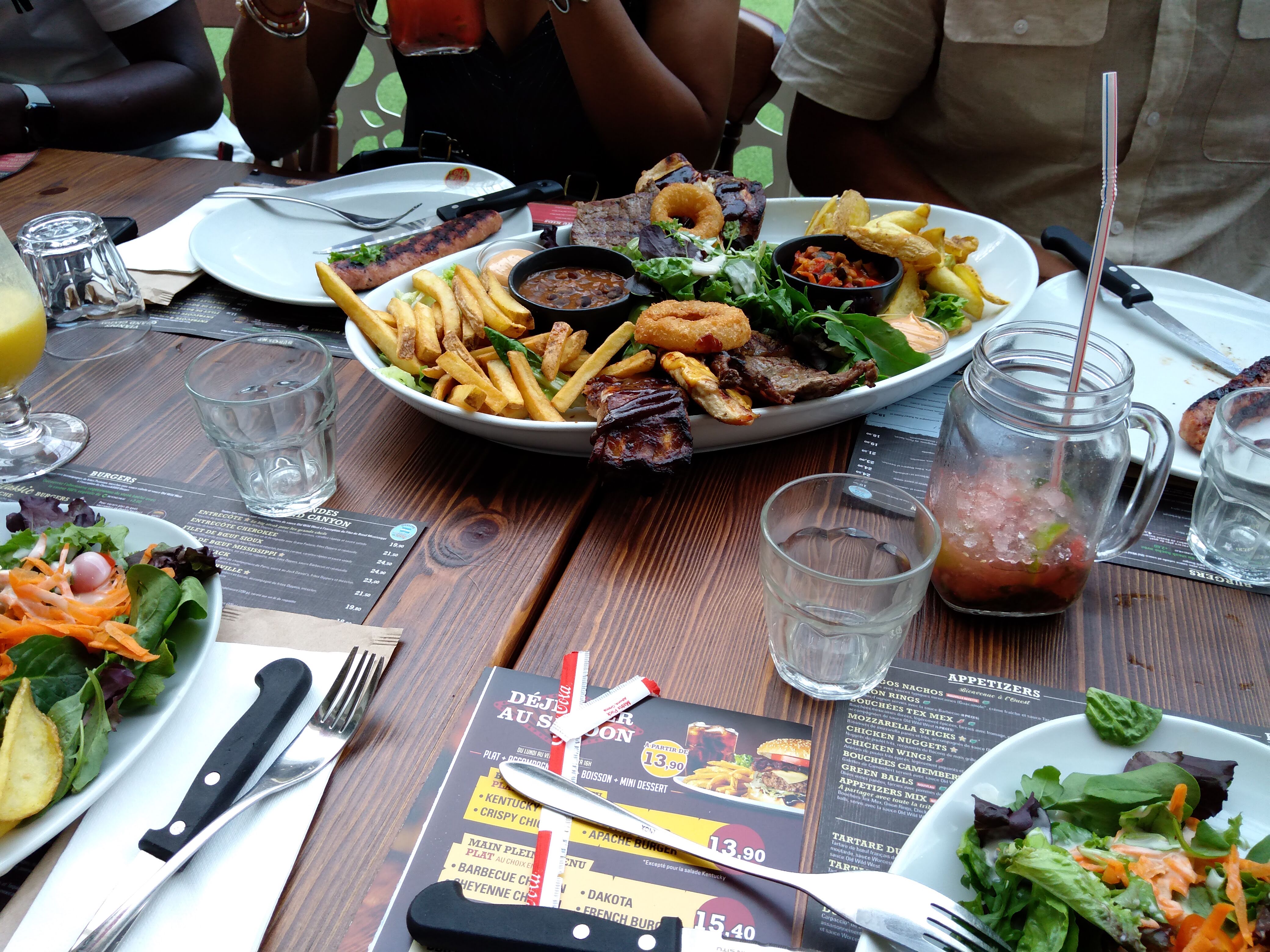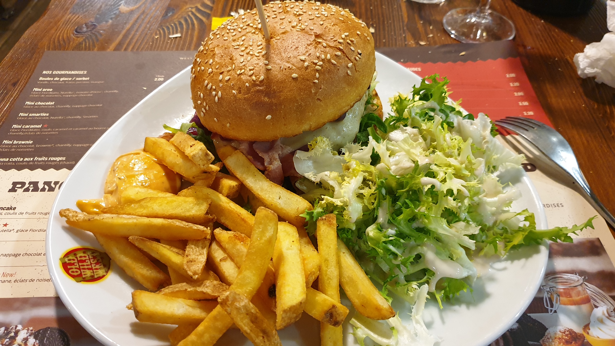 Ce restaurant est très bien situé. Proche de l'entrée de la porte principale où il y a tous les restaurants. Dès la devanture on est mis dans l'ambiance de l'ouest américain. Malgré le monde nous avons eu une place pour deux isolée. Pour nous faire patienter, un petit sceau de cacahuètes en coque est servi sans oublier le sceau pour jeter la coque. Côté plat, leur burgers sont copieux, la viande est tendre et bien cuite comme demandé. Le tout servi avec une salade et des frites. Parfait pour les gros mangeurs. Gros plus pour la sauce américaine faite maison. Côté desserts le choix est varié. Coupe brownies et crêpe au Nutella. Nos papilles étaient ravies et la quantité était là. Le prix est très abordable. Franchement à refaire pour explorer la carte.