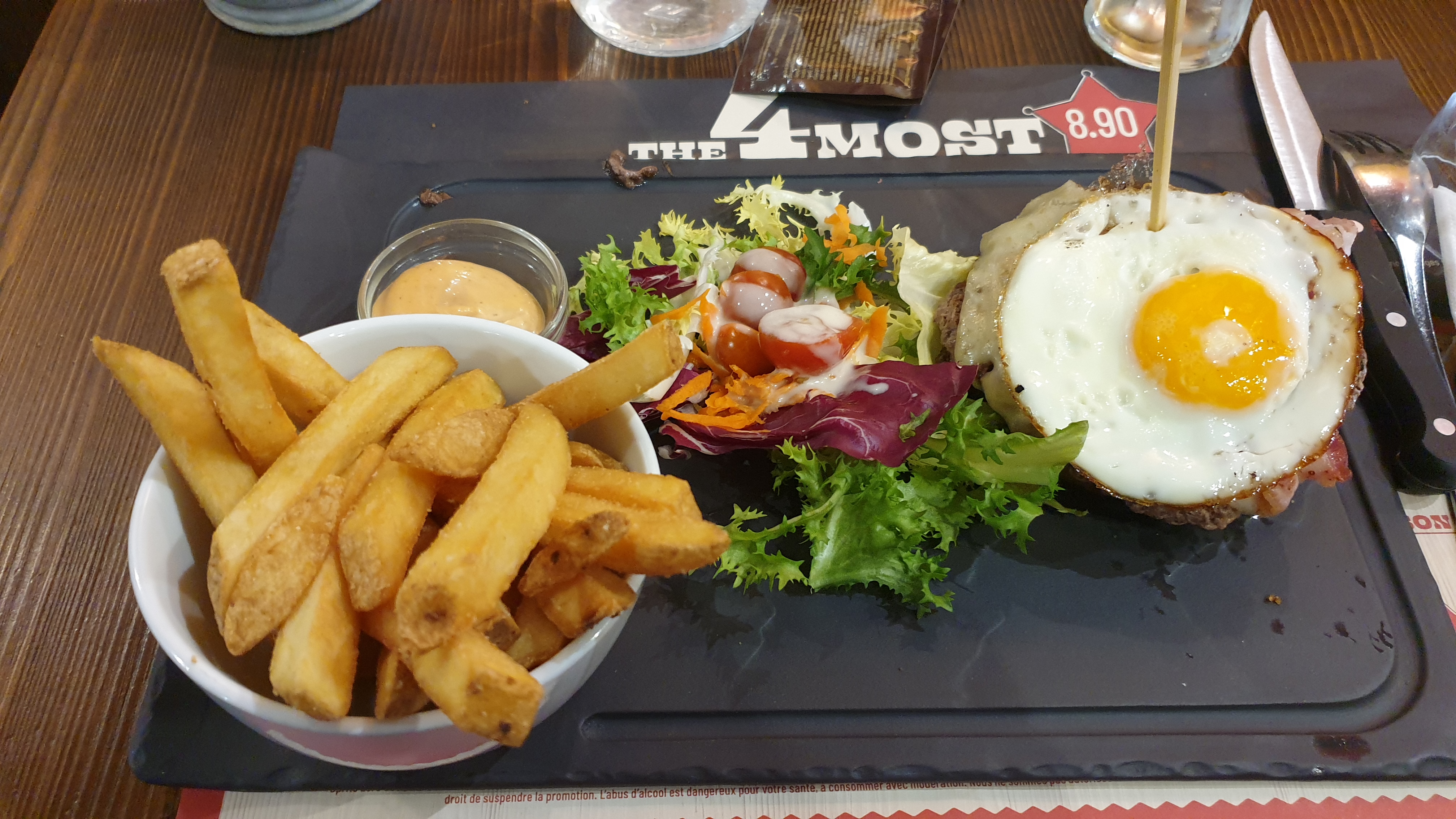 Nous avons pris 2 Burgers : Fajitas (15,80€) et EggBacon (15,90€). Beacoup trop cher pour ce que c’est. Moyen
