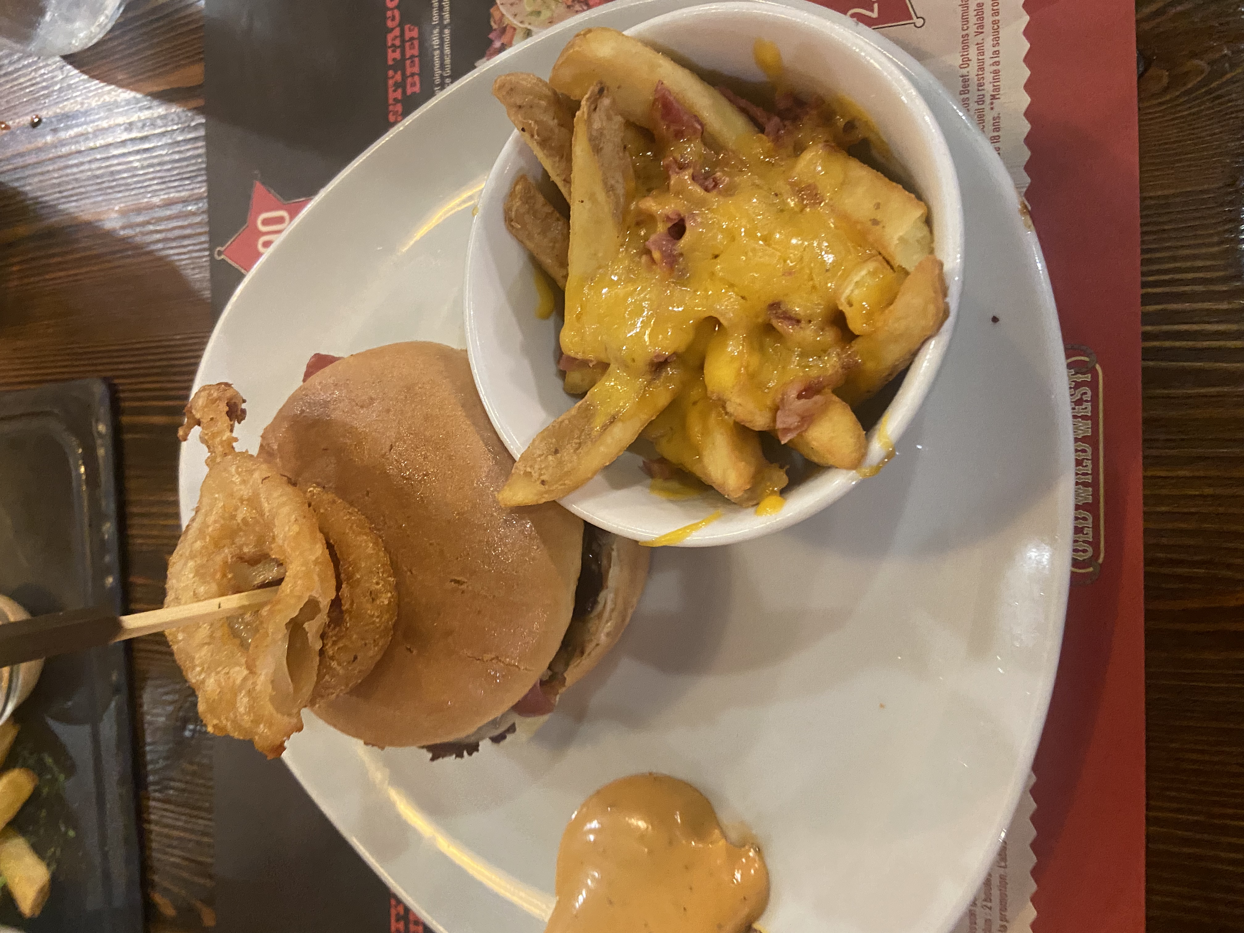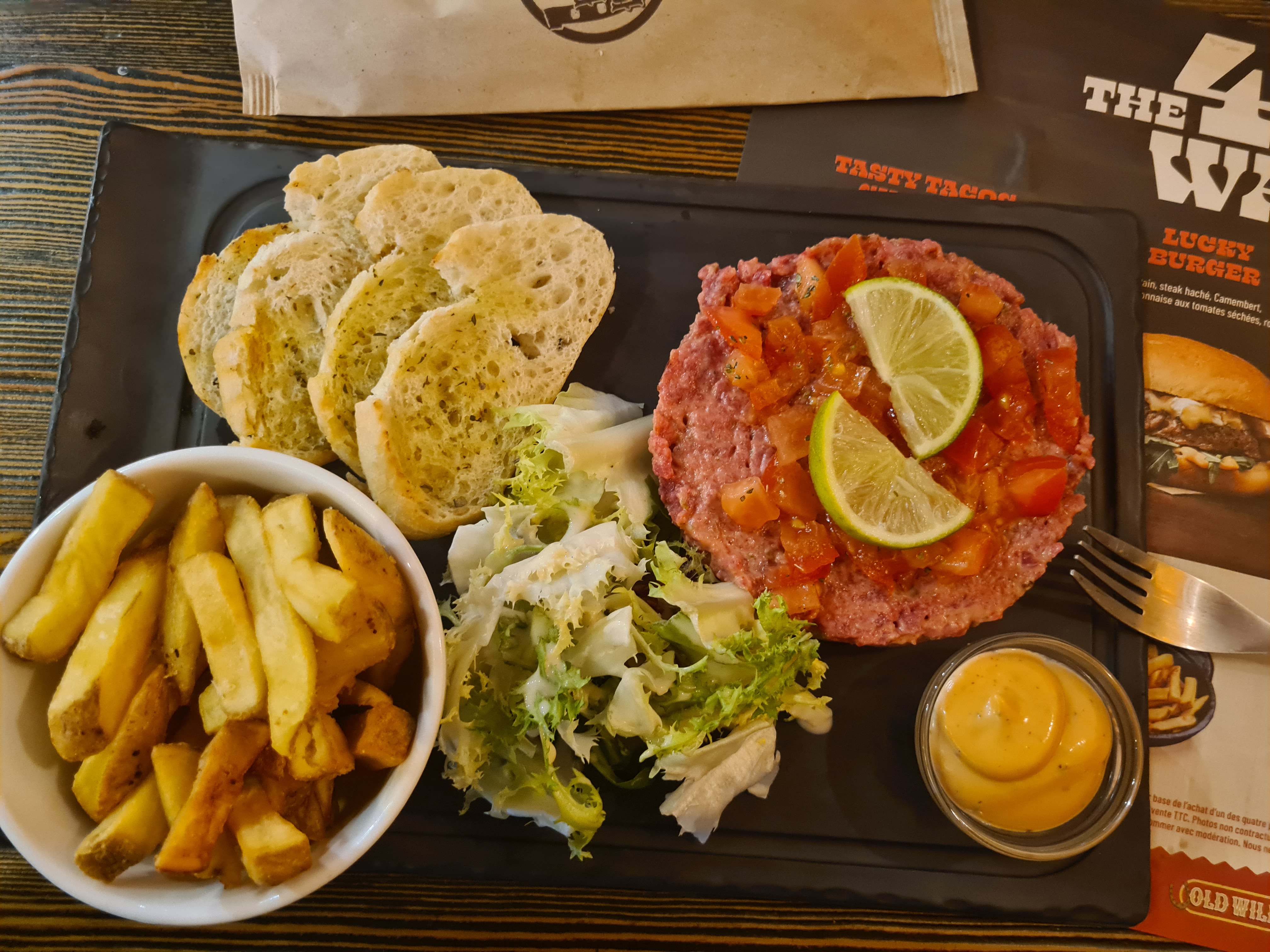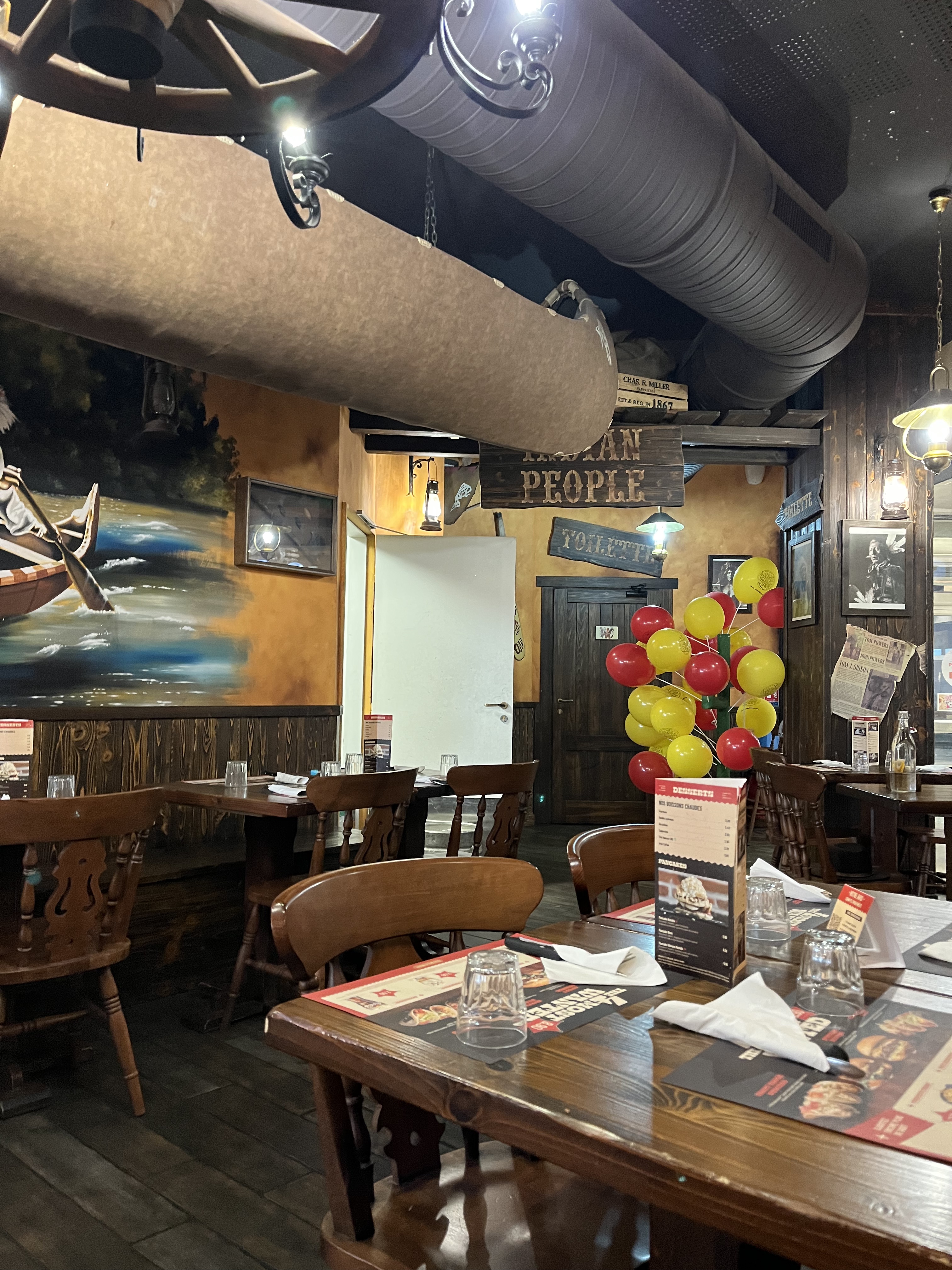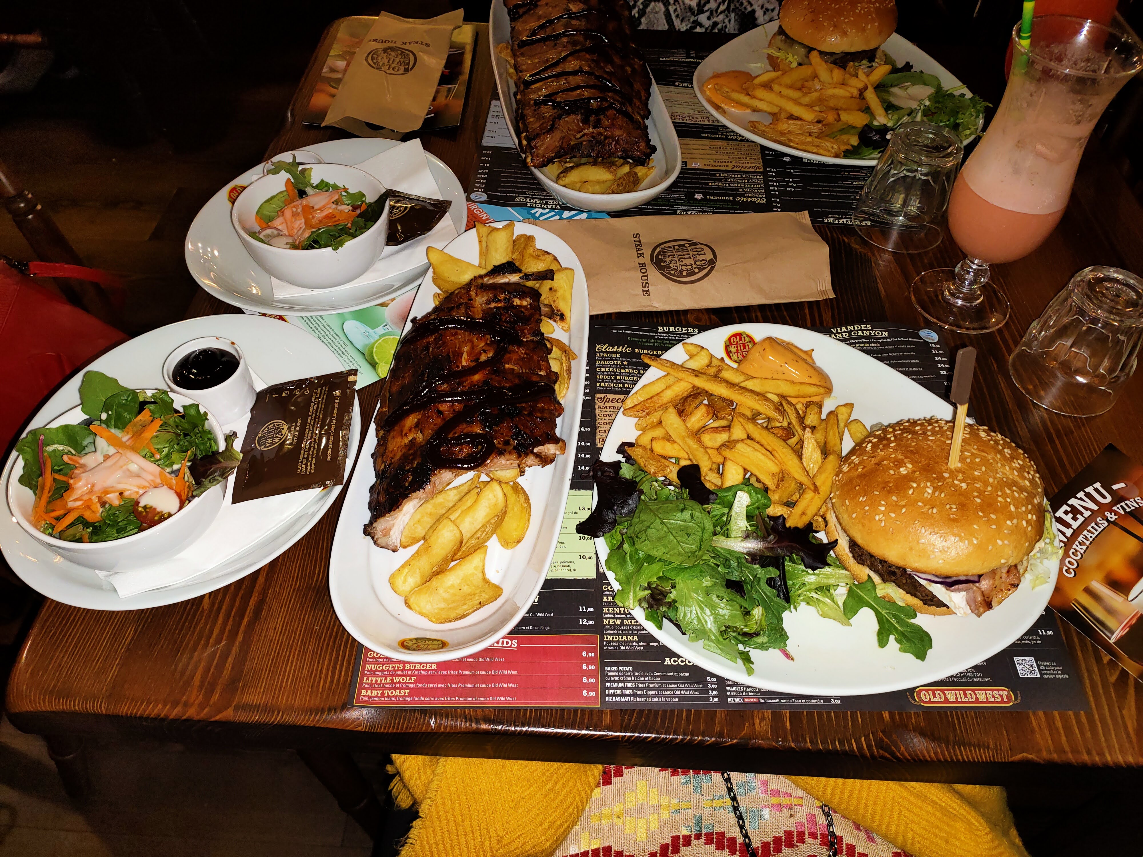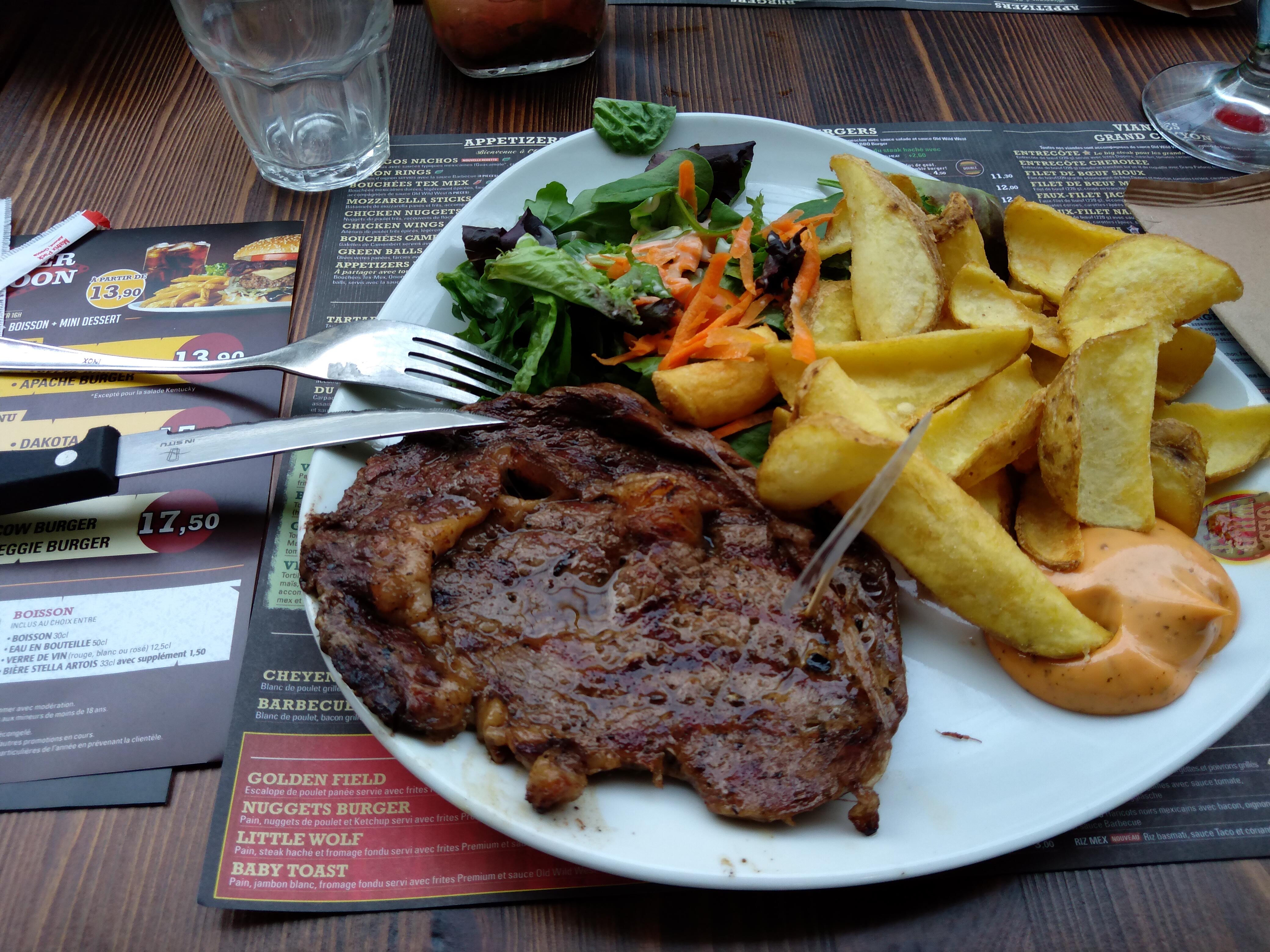 Le repas était très bon et le rapport qualité/prix correct ! En revanche, le personnel n’est pas du tout professionnel ! En arrivant je demande s’il est possible d’avoir une table dans le thème western (imitation tipi ou chariot de cow-boy) mais la serveuse me répond qu’étant samedi elle ne peut pas se permettre de mettre 4 personnes à une table de 6, or plus tard je remarque qu’elle a placé des groupes de 3 et 4 personnes à ces mêmes places… De plus, j’avais demandé un burger avec un steak végétarien, mais on m’a servi un tout autre burger avec de la vraie viande (a la suite de quoi on m’a fait un geste commercial)