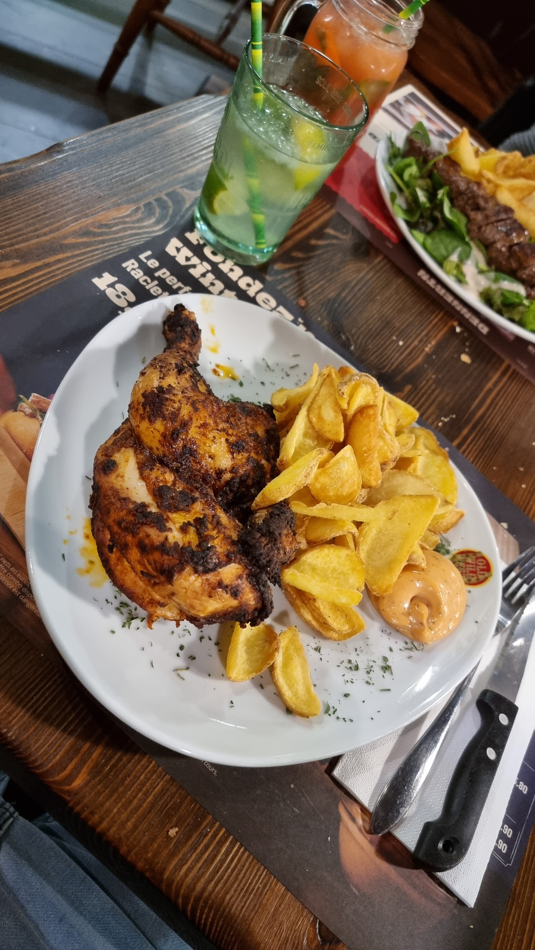 Mon 1er passage fut une mauvaise expérience la seconde un peu mieux le petit starter a partager est pas mal du tout le demi poulet a 15e pas trop mal mais il ne vaut pas le gout du poulet starter en revanche assez étonner par les tarif vraiment élevé 63e a 2 personne avec starter a partager 2 plat 2 boisson 2 dessert