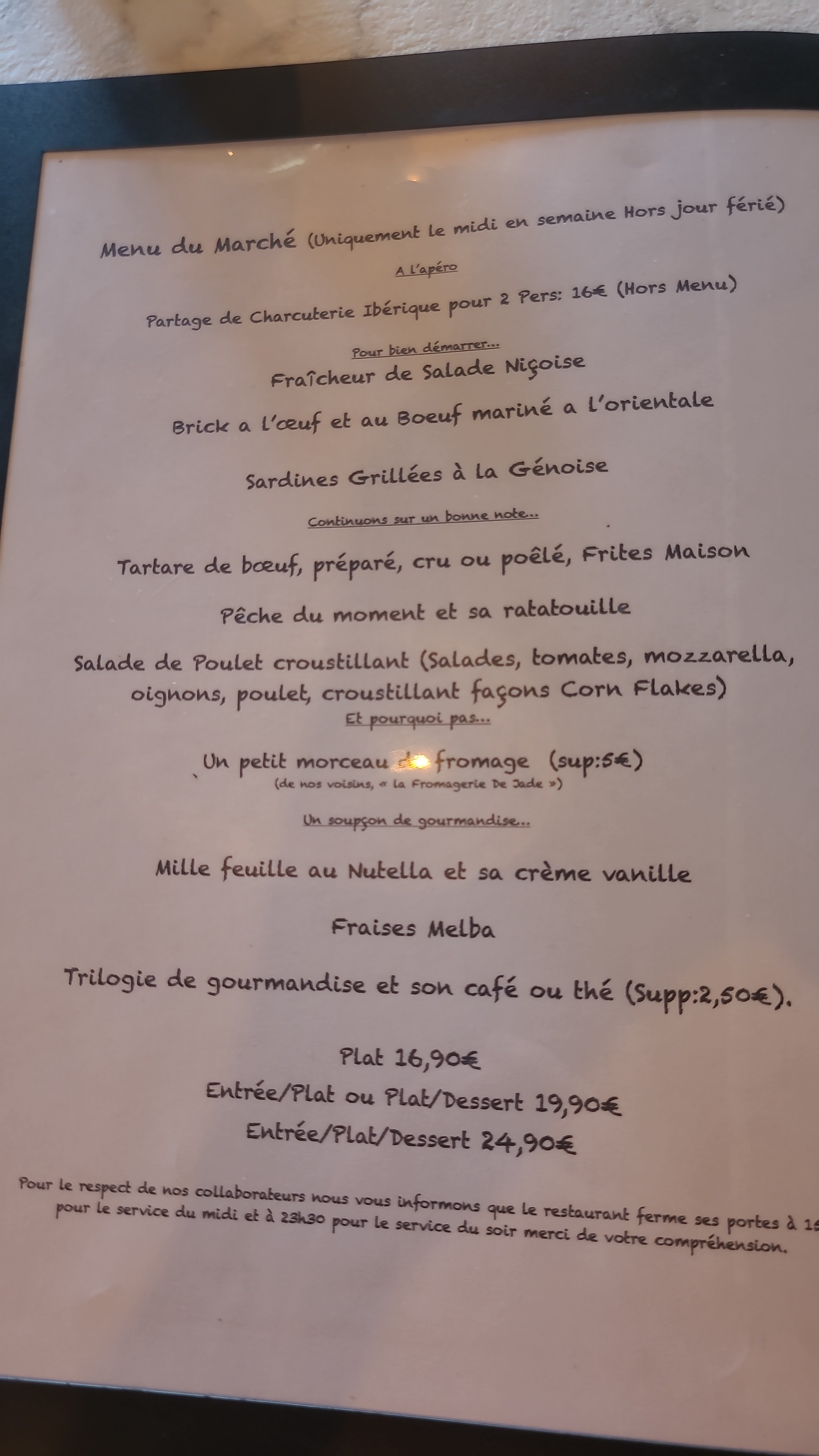 Alors kir vin blanc framboise peu aromatisé (et servi dans une coupe à Champagne), charcuterie bonne (mais beurre doux avec un arrière goût de plastique/frigo), entrée passable, gratin et viande très sec. Peu de choix de fromage sur le plateau proposé mais au moins ils sont pris chez un commerçant local. Brioche perdue bonne. Le problème étant qu'il y avait de la mâche dans chaque plat (sauf le dessert), je n'ai rien contre le mâche mais en avoir dans la planche de charcuterie, l'entrée, le plat, le fromage, c'est très redondant, il faudrait trouver autre chose pour agrémenter/décorer les assiettes... Surtout quand la mâche croque sous la dent car mal lavée... Je sais que c'est compliqué et fastidieux de laver de la mâche mais dans ce cas, ne vaut-il pas mieux mettre de la feuille de chêne ou de la laitue ? Le cadre est sympa, la déco aussi. Des serviettes en tissu seraient les bienvenues. Le serveur était agréable et souriant. En résumé, expérience assez mitigée, je ne suis pas sûr de revenir... il a y a de bien meilleures adresses à Mennecy…