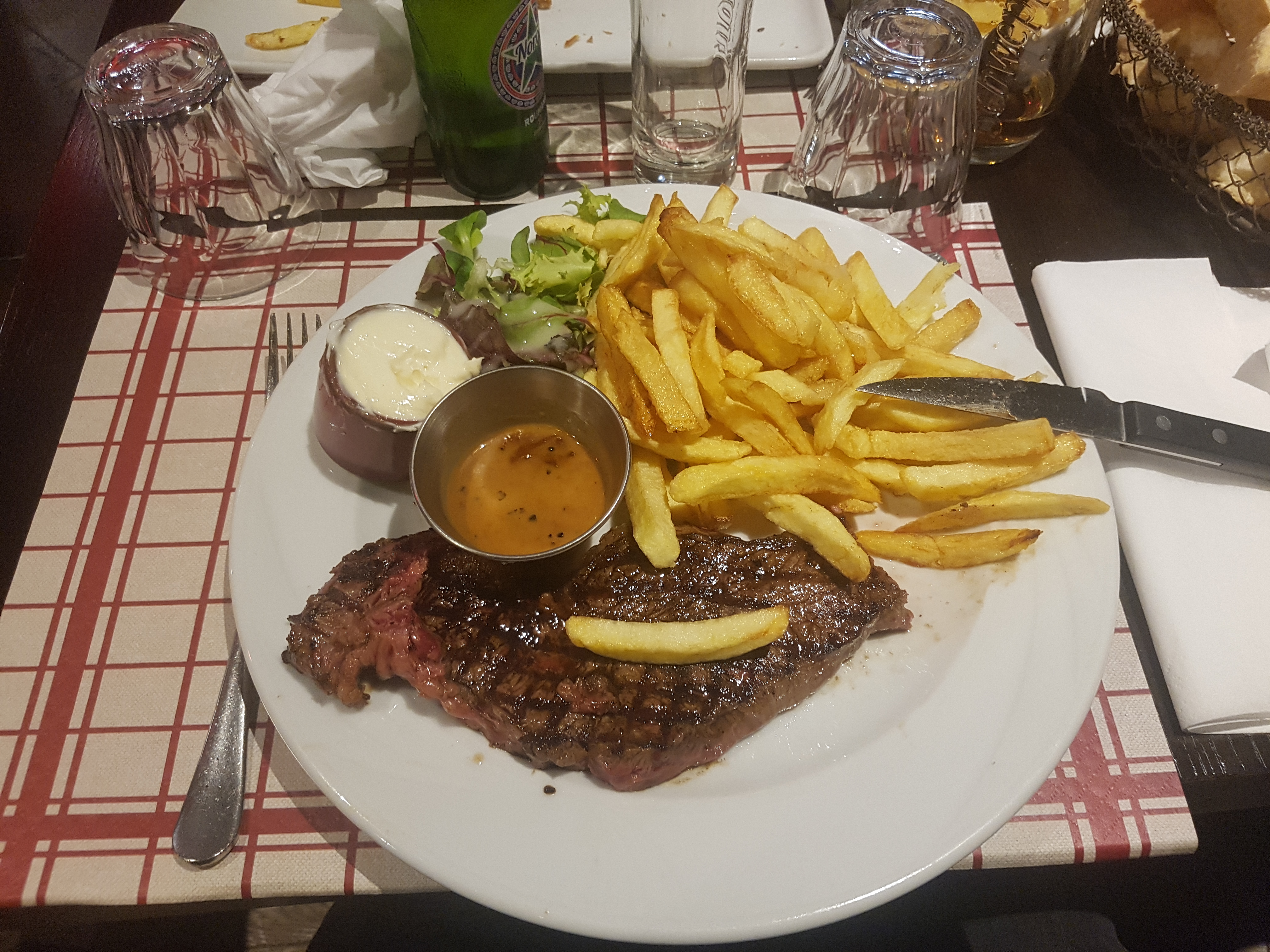 Viande correcte, frite un peu grasse, pain mou, cuillère en plastique dans la sauce au poivre, le dessert est correct. Sans plus