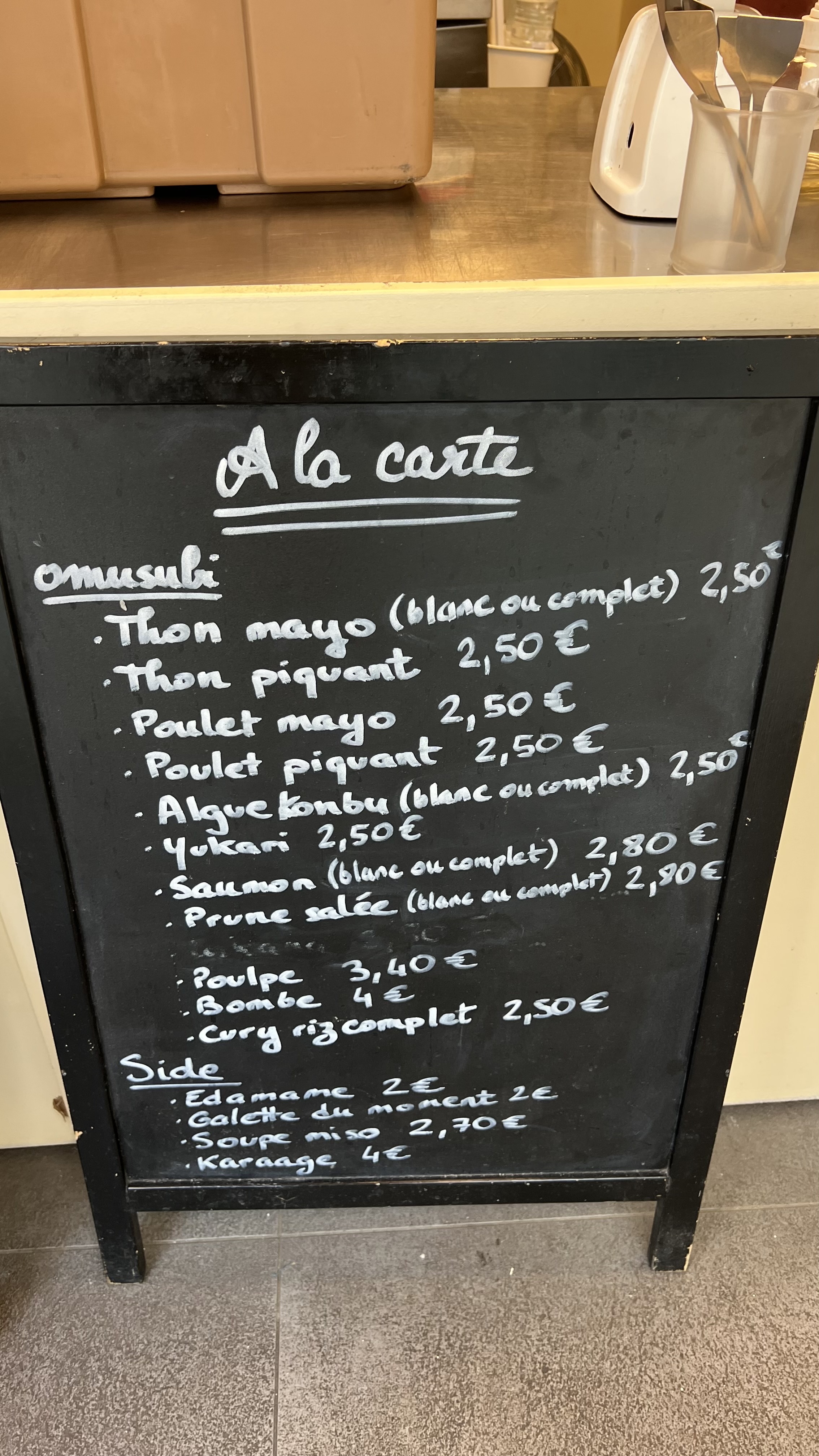 Prix des onigiri 🍙 tres correcte. 2,50 €/unite sauf celui au saumon est à 2,80€ et tempura à 3,50€. Très généreux en riz. Le goût est là, 2-3 onigiri rempli le ventre ;)