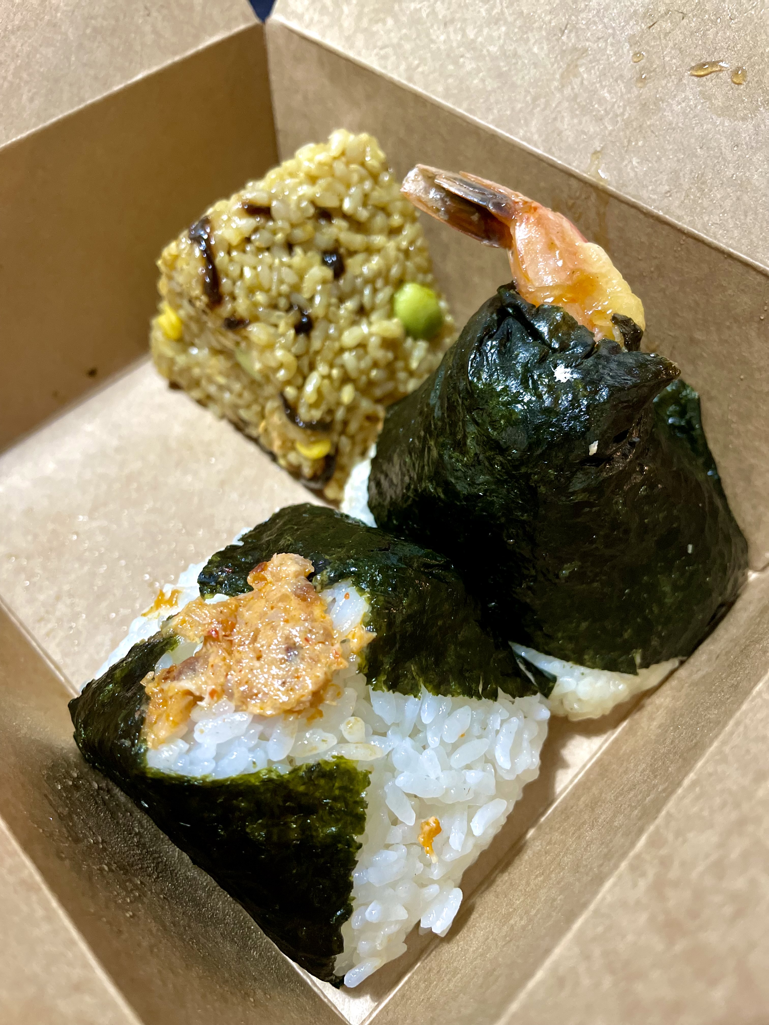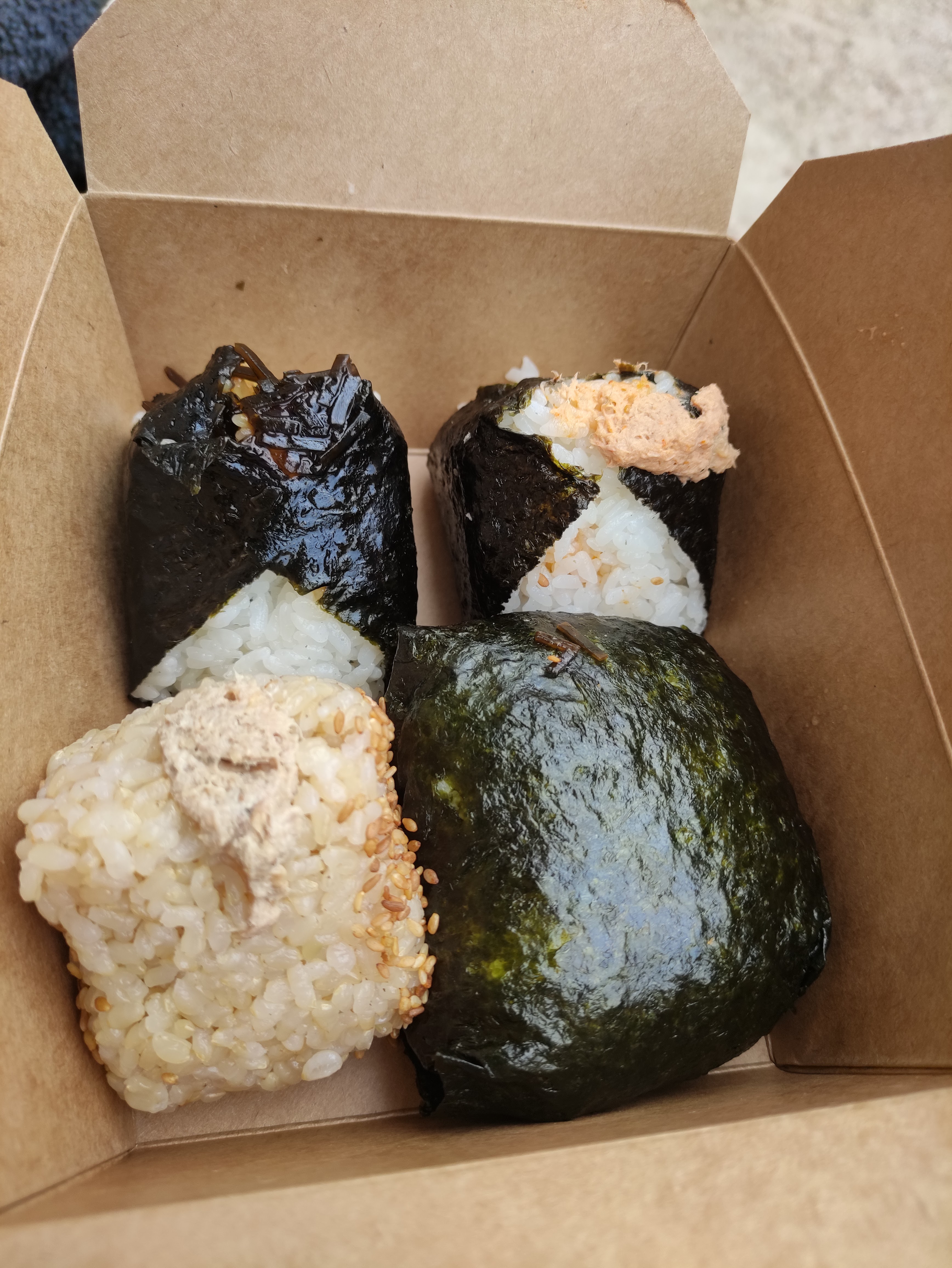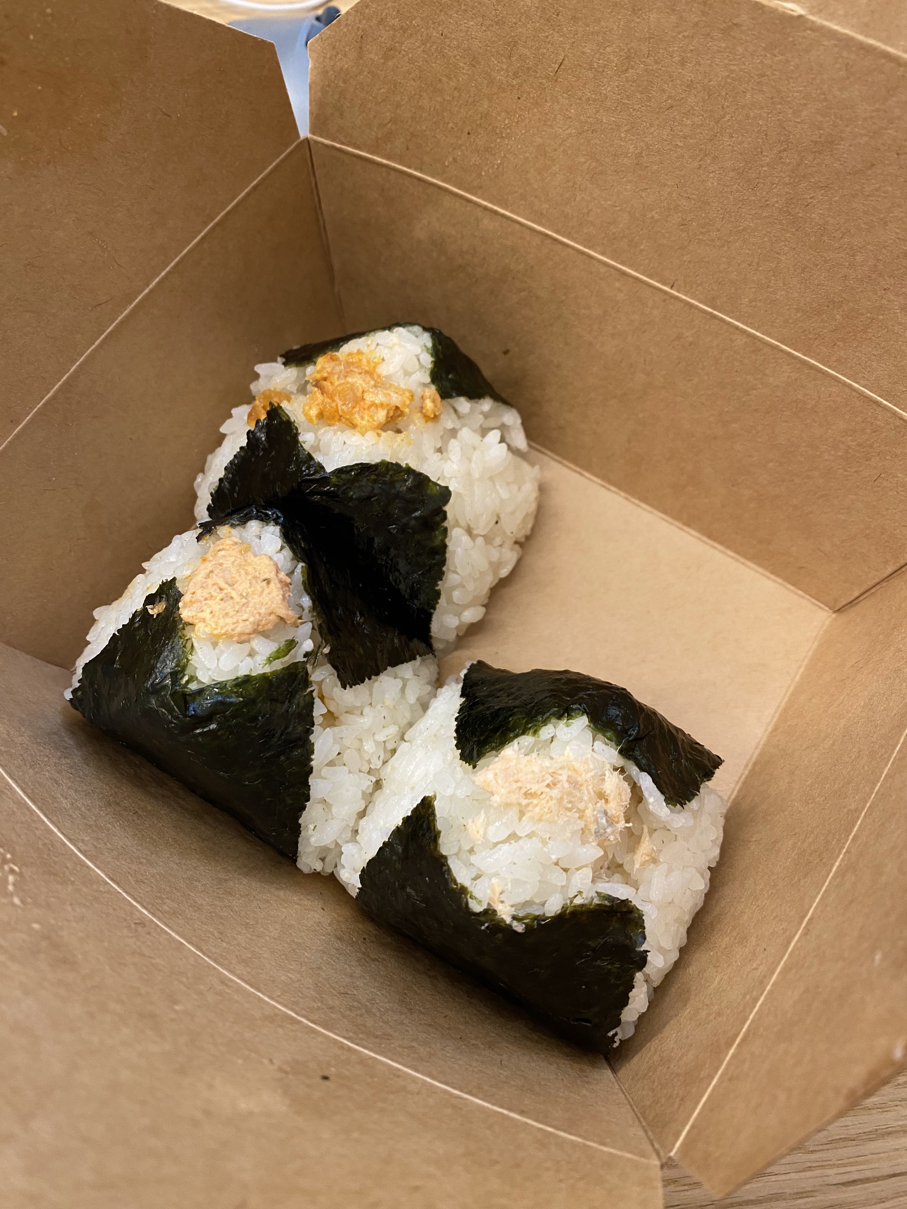 Onigiri copieux. Celui a l'algue est très bon. Le thon mayo manquait un peu de garniture mais restait excellent tout de même
