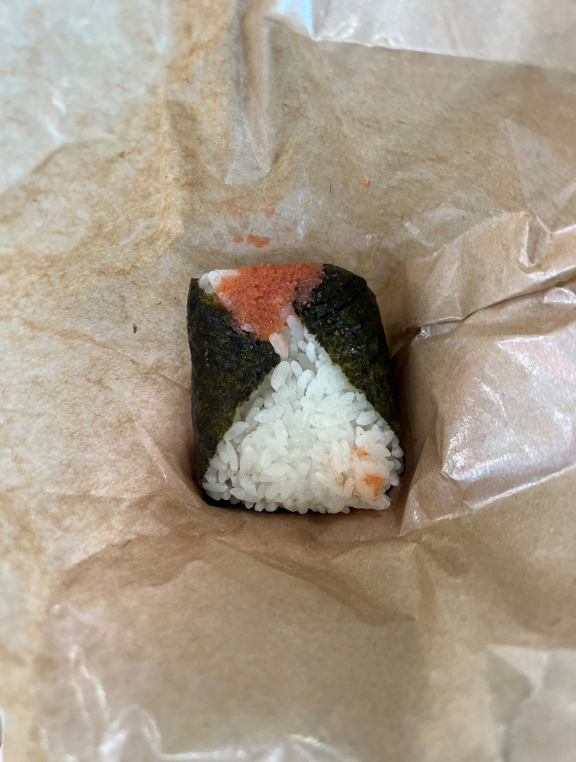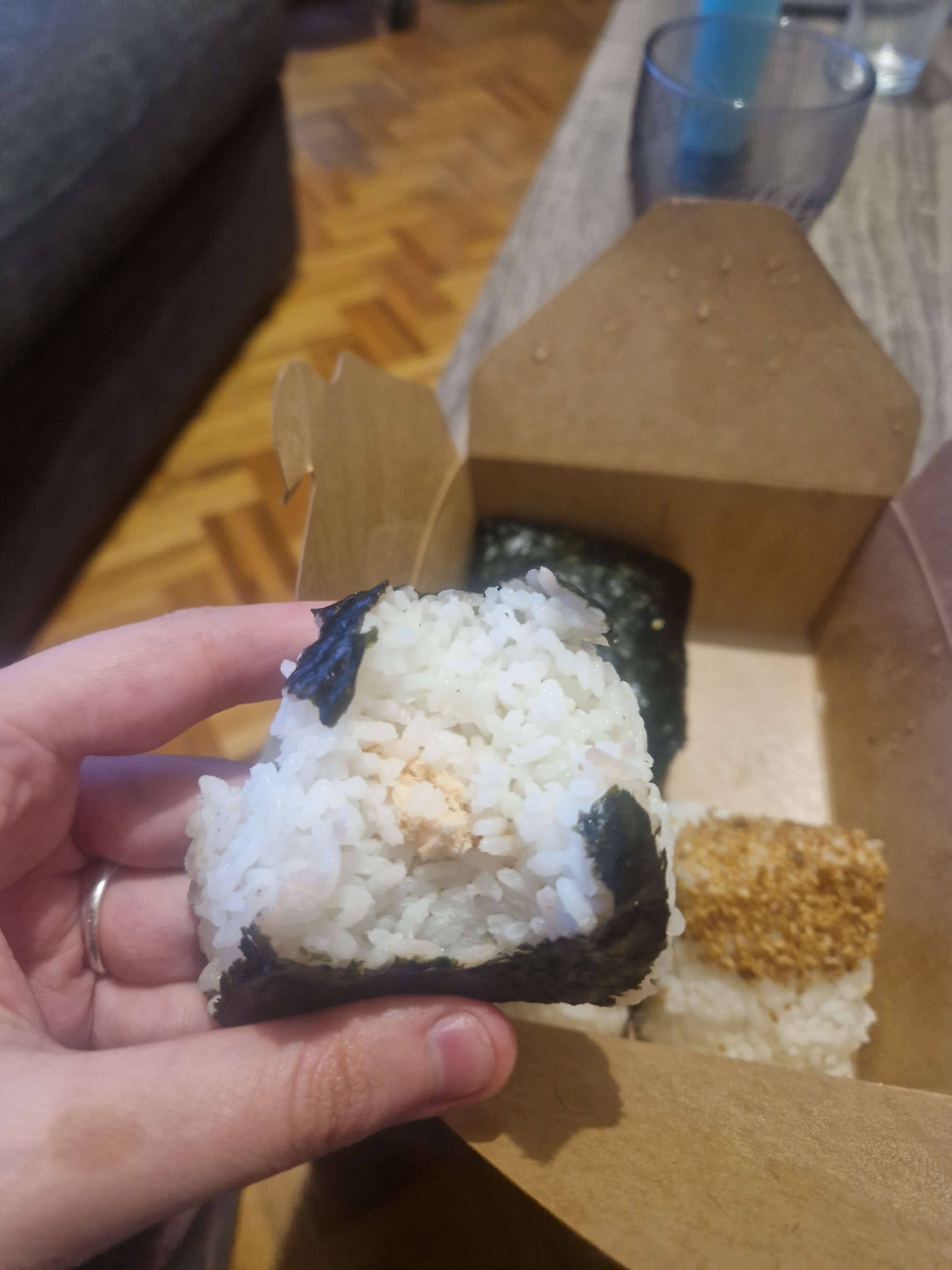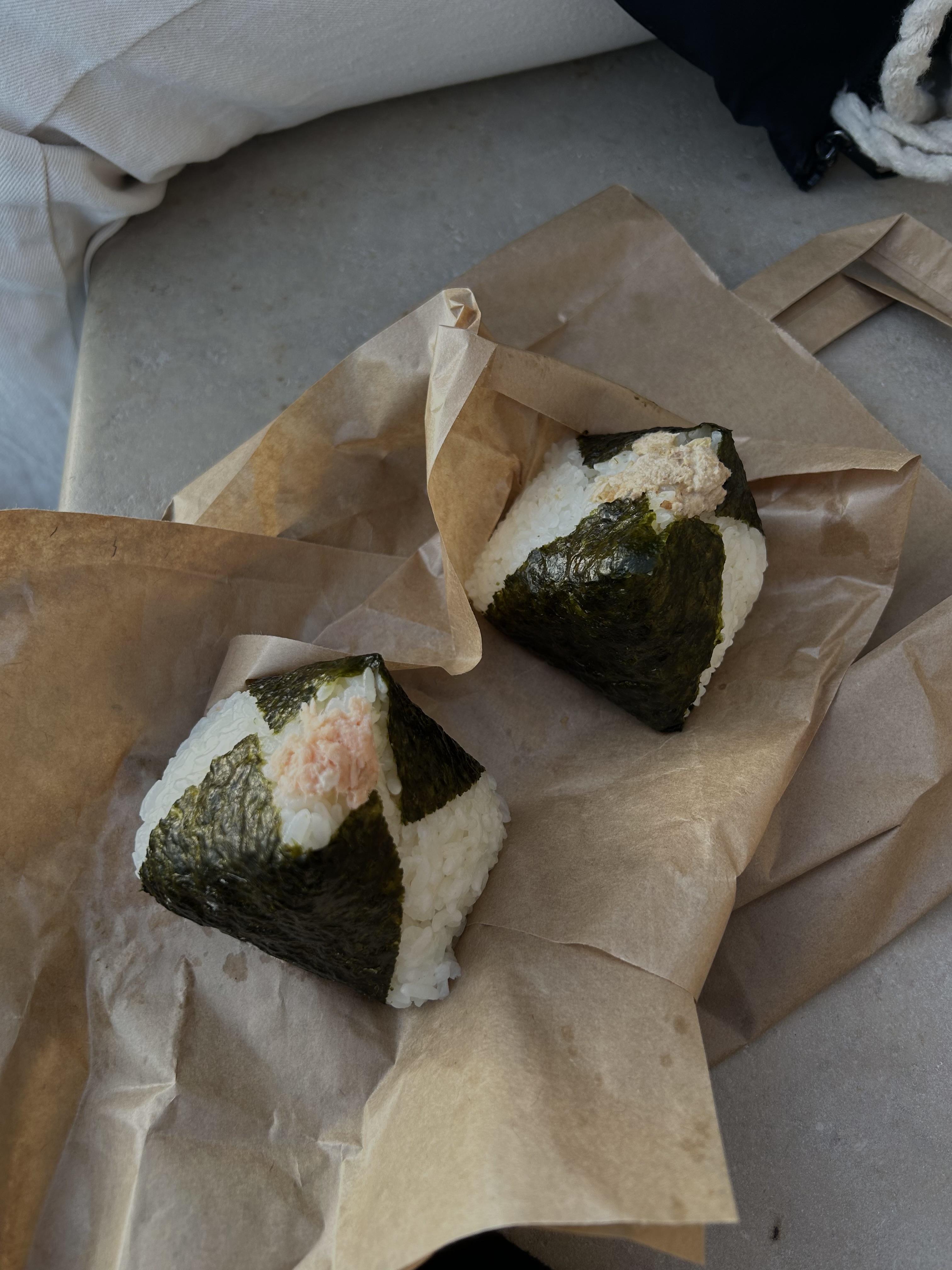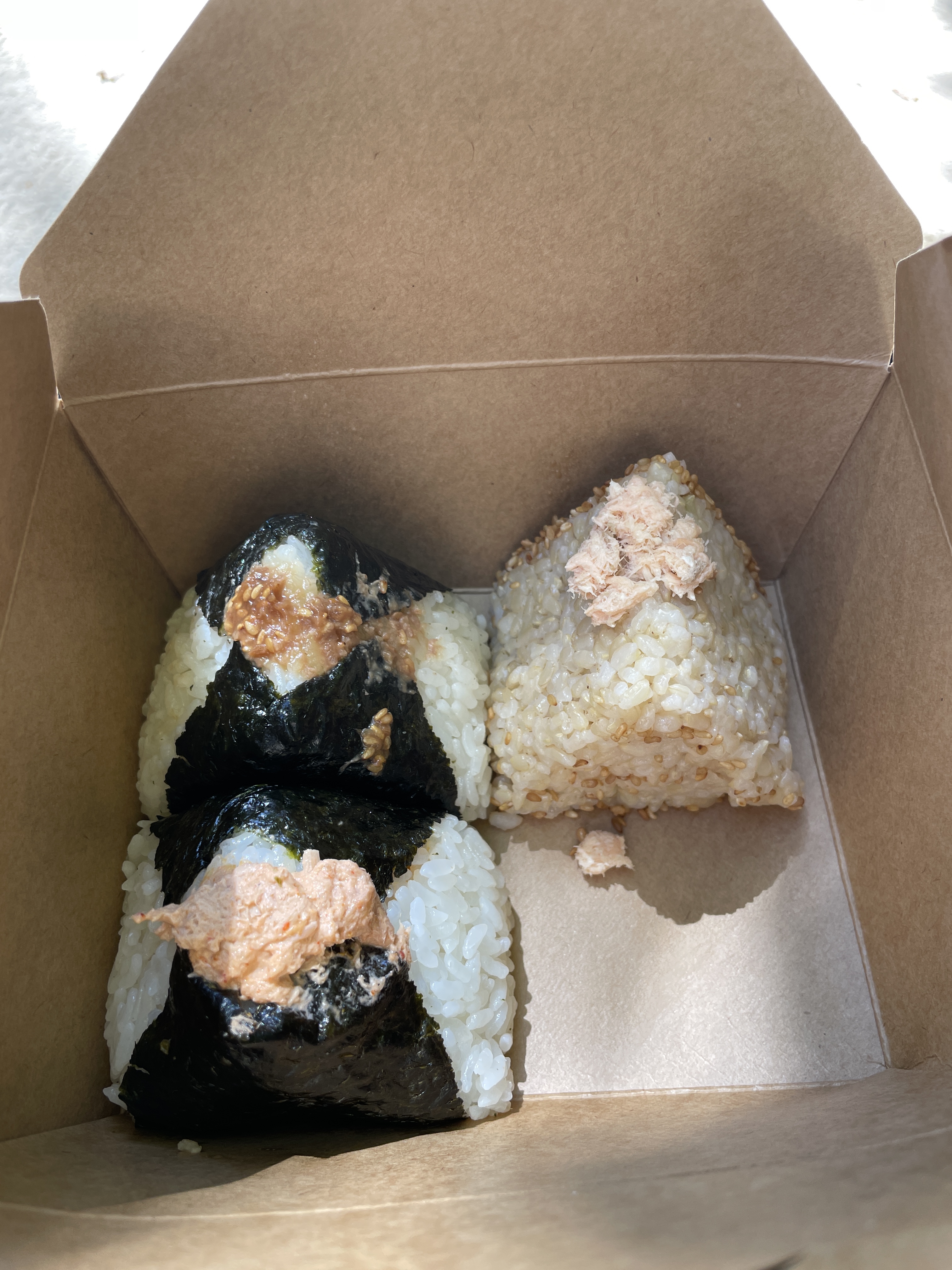Onigiri copieux. Celui a l'algue est très bon. Le thon mayo manquait un peu de garniture mais restait excellent tout de même