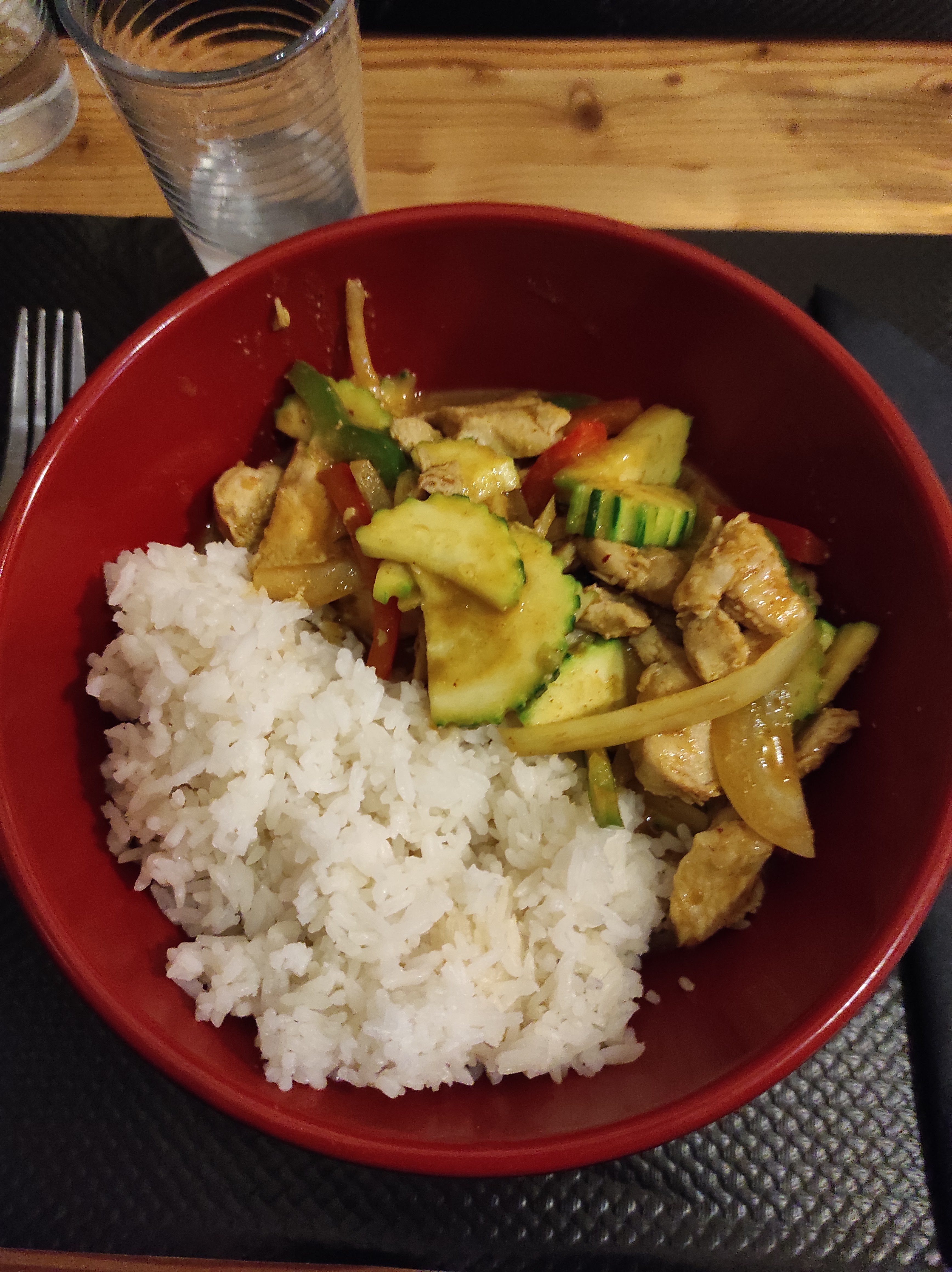 Malheureusement déçue par ma commande. La seule chose positive aura été les brochettes de poulet satay avec son excellente sauce. Le reste n’est que déception : -bœuf sauté du jour : sous entend, 3 pauvres morceaux de bœuf (la photo en témoignera) entourés de poivrons, courgettes (crus) et oignons, sauce sucrée - tiramisu ???? Si on ose l’appeler tel quel. De la crème liquide et du chocolat, rien de plus.