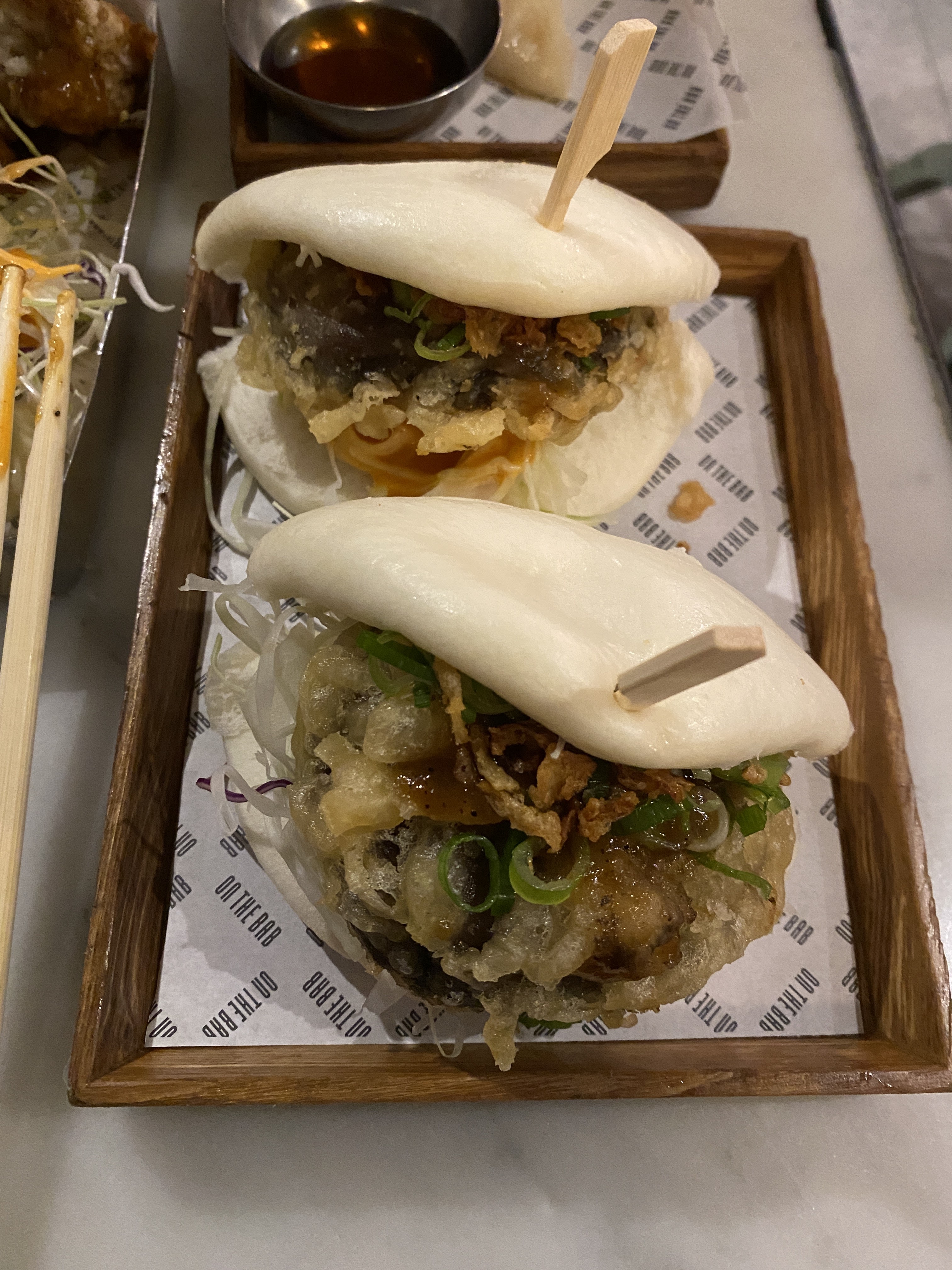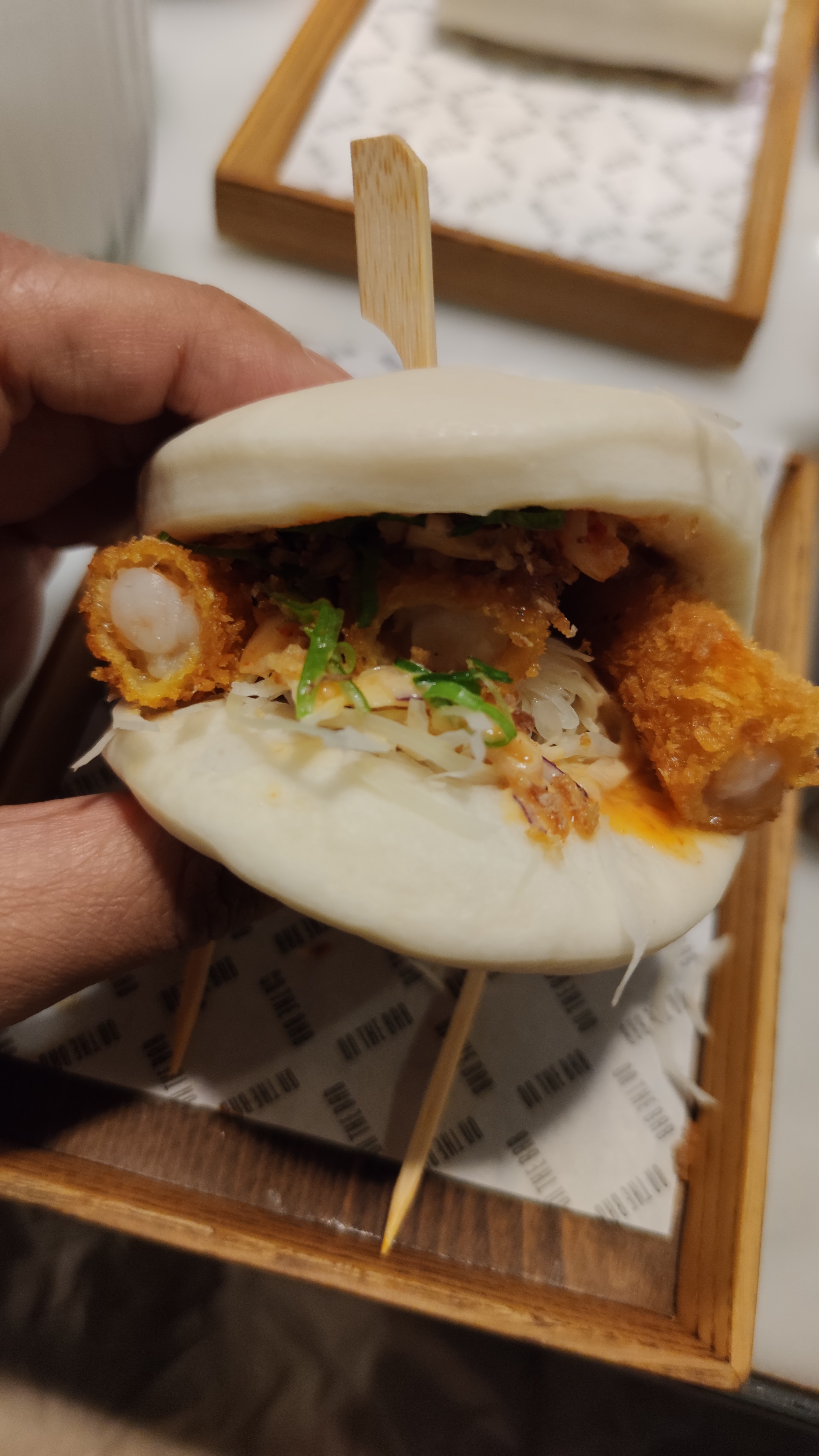 2 buns (une spécialitée de la maison) pour 14€ avec garniture crevettes fries 😍 un pur délice ! Moi qui croyais rester sur ma faim...c'était raté ! Bien copieux et généreux dans les portions. Je recommande ! J'ai aussi pris des raviolis aux crevettes : aussi fondant que croustillant à l'extérieur. Merci!