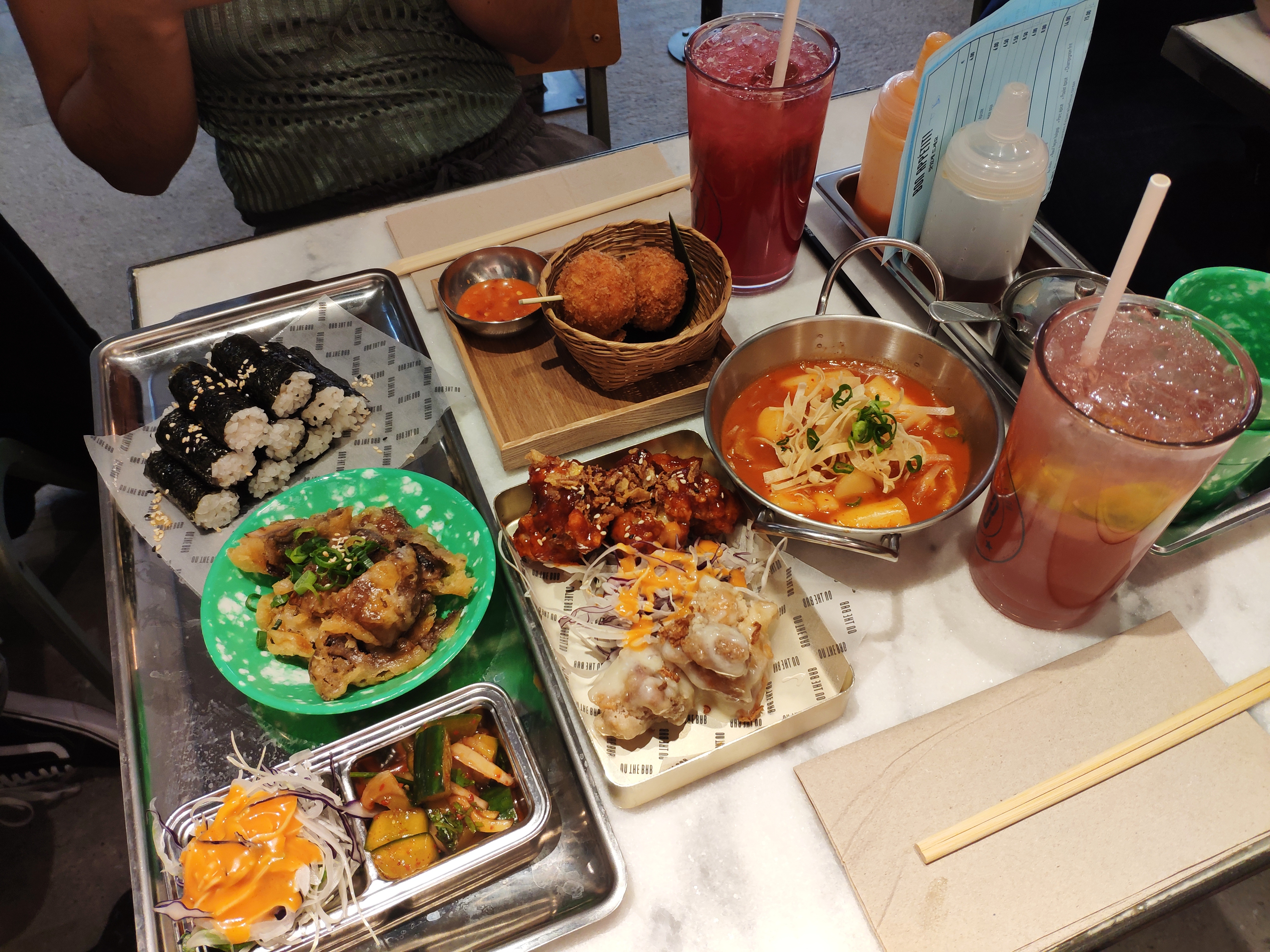 Ne fuyez pas face à la file d'attente ! Le service est rapide dans cette cantine, où le menu succint rassemble les classiques de la cuisine coréenne. Nous avons pris le parti de partager à nous deux un plat de topokki, du poulet frit (une texture parfaite et des sauces savoureuses !!), buns au boeuf bulgogi et on the Rolls, makis de riz accompagnés de porc épicé. Un vrai délice ! Les épices et le kimchi sont au rendez-vous, néanmoins c'est plus qu'attendu/apprécié quand on va manger coréen ;) Il est vrai que d'autres restaurants coréens peuvent proposer des assiettes plus garnies, mais nous avons trouvé notre compte en terme de saveurs et de satiété :) le plum punch est original et désaltérant, la liste des cocktails est bien fournie, à explorer une prochaine fois :)