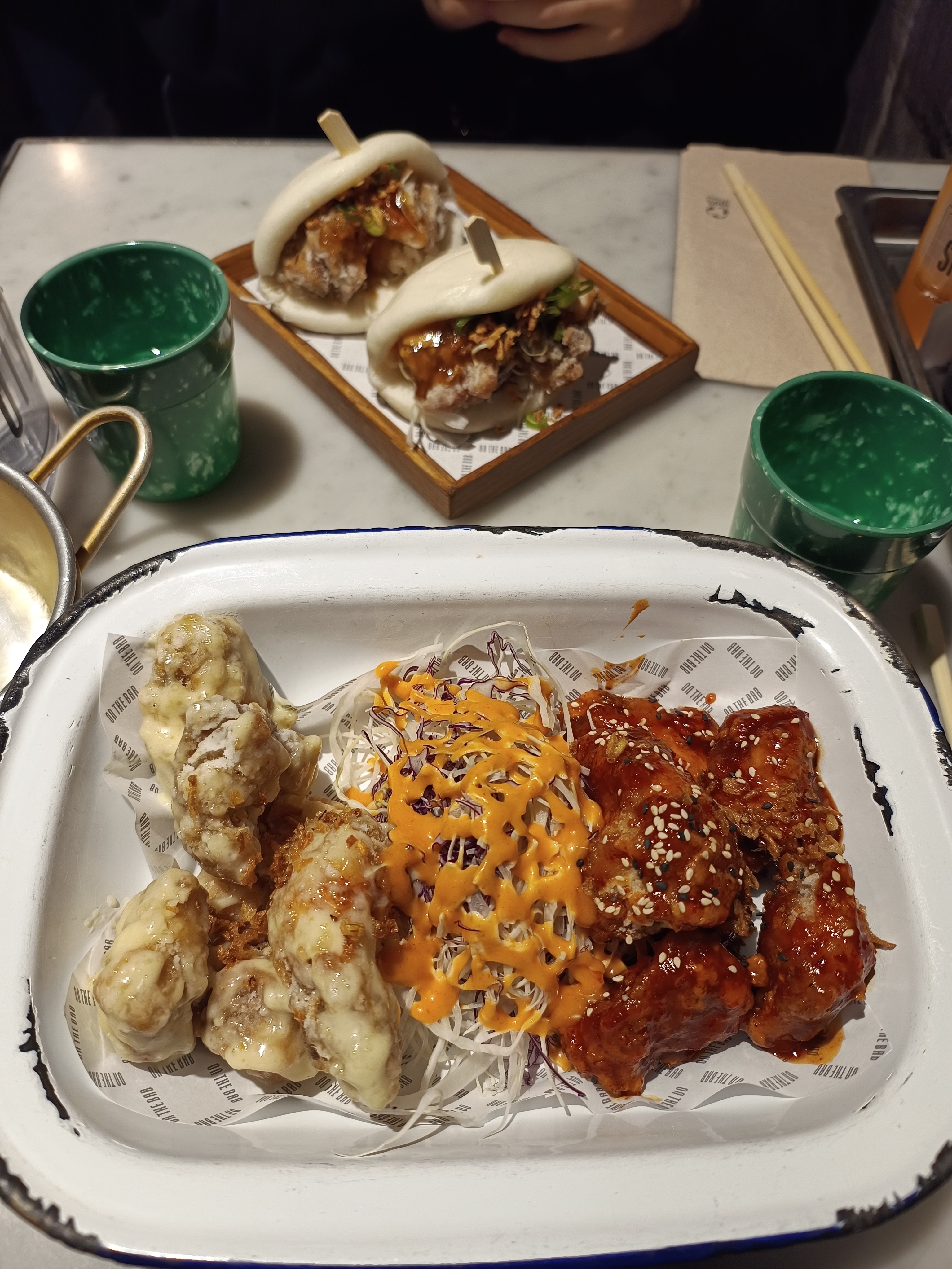 Une adresse très connue dans le quartier et donc la queue devant l'établissement pour rentrer. Heureusement cependant le service est rapide. Au niveau de la nourriture nous avons pris l'incontournable poulet frit coréen qui est excellent. Pour le reste des plats les baos sont bons et les tteokbokki pas trop mal mais rien d'extraordinaire. Bref une bonne adresse pour le poulet frit et si vous n'avez pas peur de faire la queue.