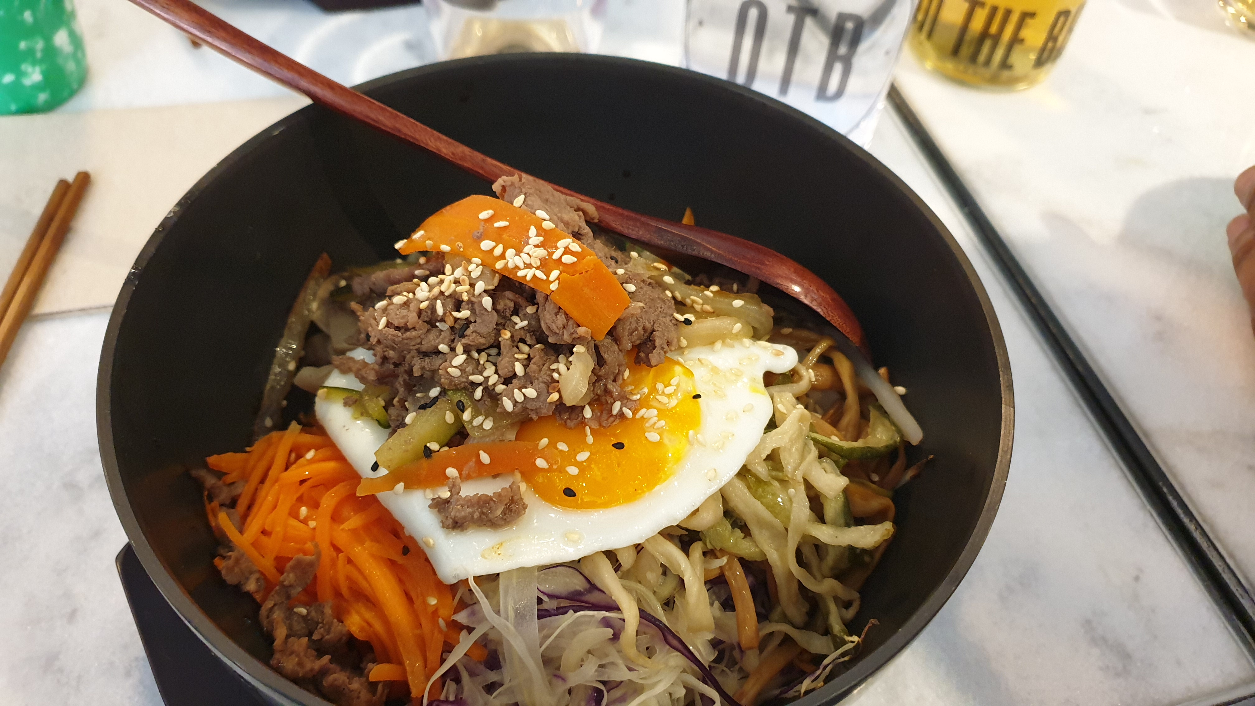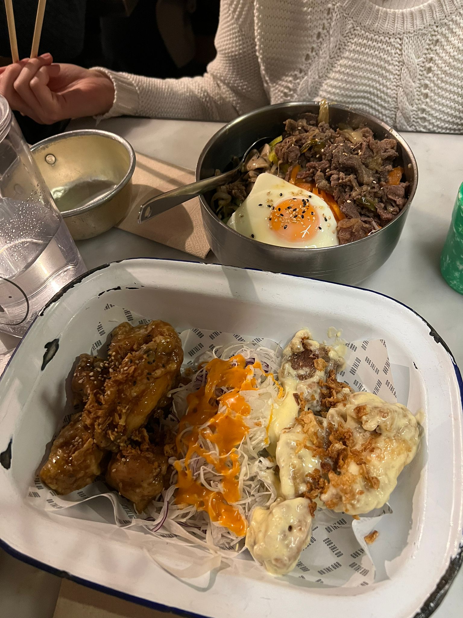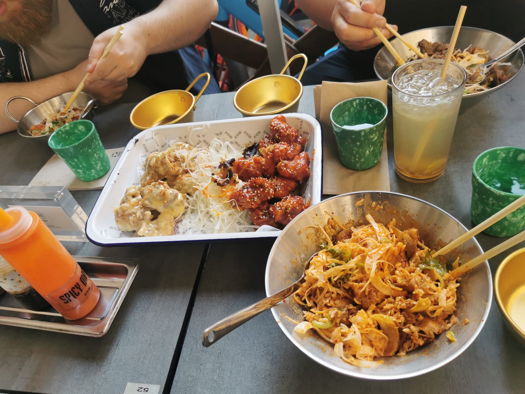Une super adresse ! La preuve à notre arrivée jusqu'à la fin de notre repas il y avait la queue ! Je vous rassure nous avons eu à attendre seulement 10min pour manger, il n'y a pas trop d'attente non plus ! Nous avions pris deux bibimbap avec du poulet frit qui étaient délicieux ! Nous avions également pris deux mini corns dogs, ils étaient bons et du concombre au kimchi, un vrai délice ! Il y a même une petite terrasse pour manger dehors, ce que nous avons fait.