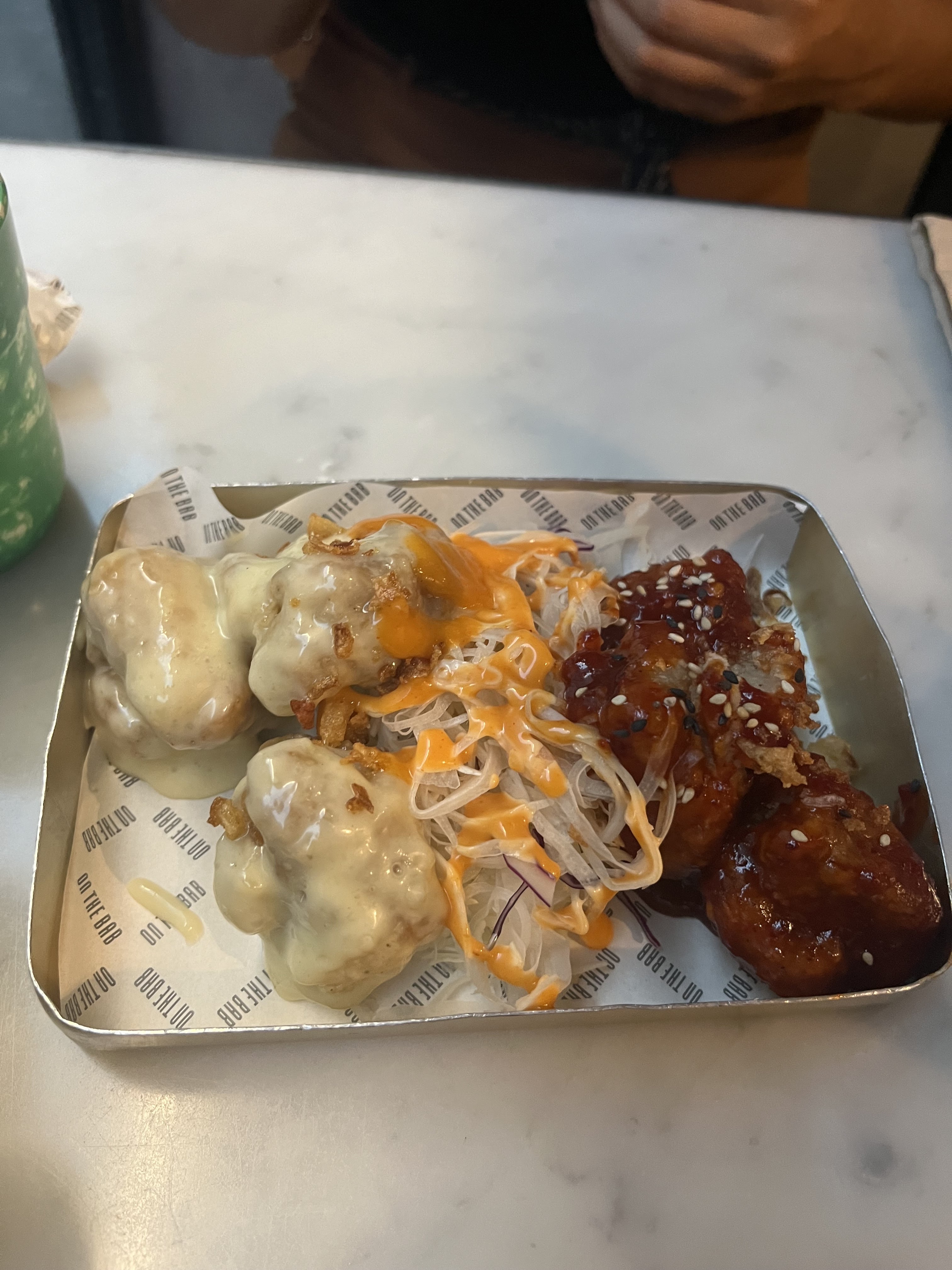 Commande à emporter. Plats vraiment bons, très savoureux. (Poulet avec deux sauces au choix - mayo ail/ piquant, et des tteokbokki). On est à Paris et dans un restaurant coréen.. mais c'est assez cher pour les portions proposées : 26€(ou alors je mange trop 😂). Je ne regrette pas d'y avoir mangé, je recommande. Désolée pour les photos j'ai détruis la présentation !