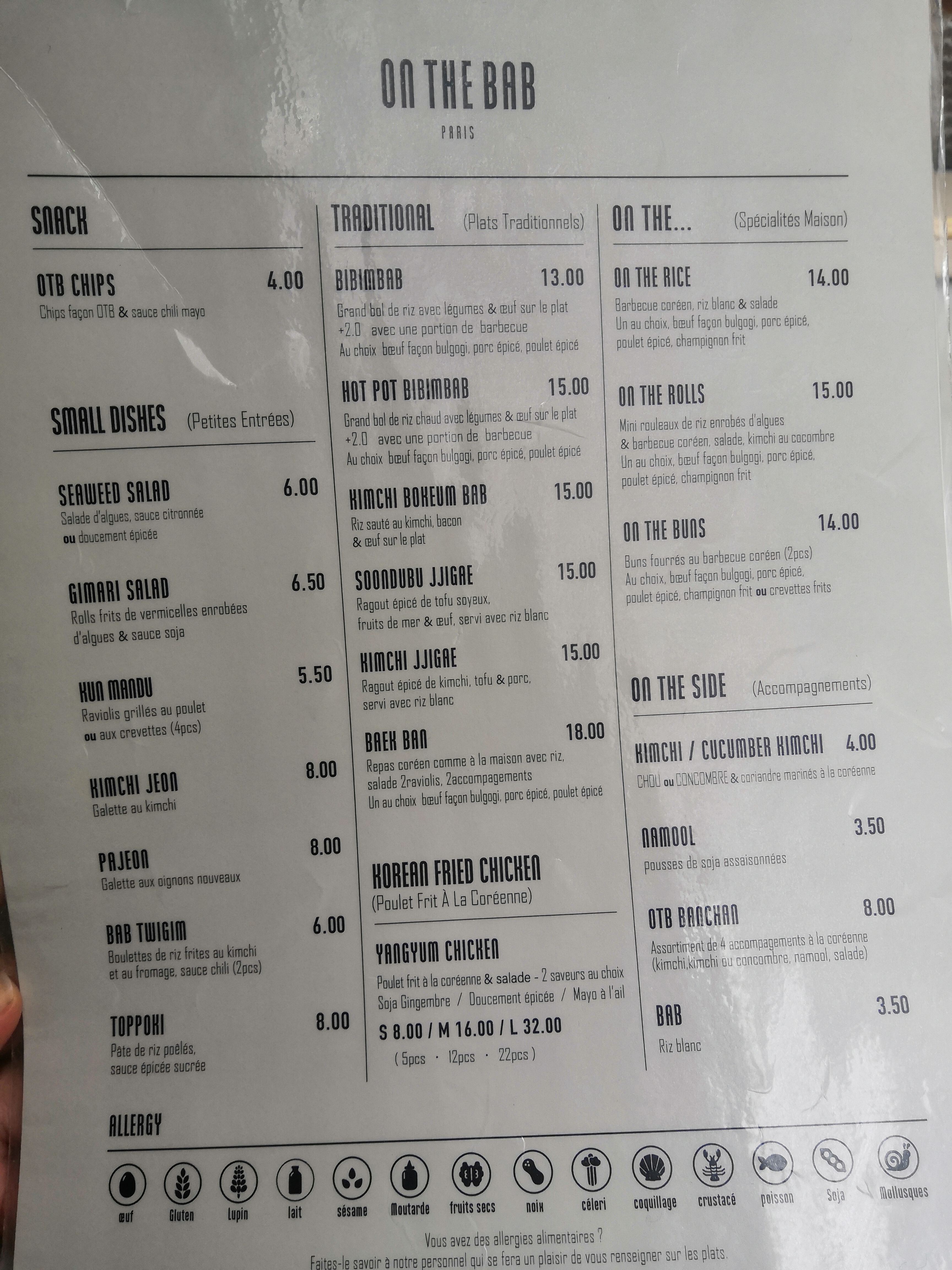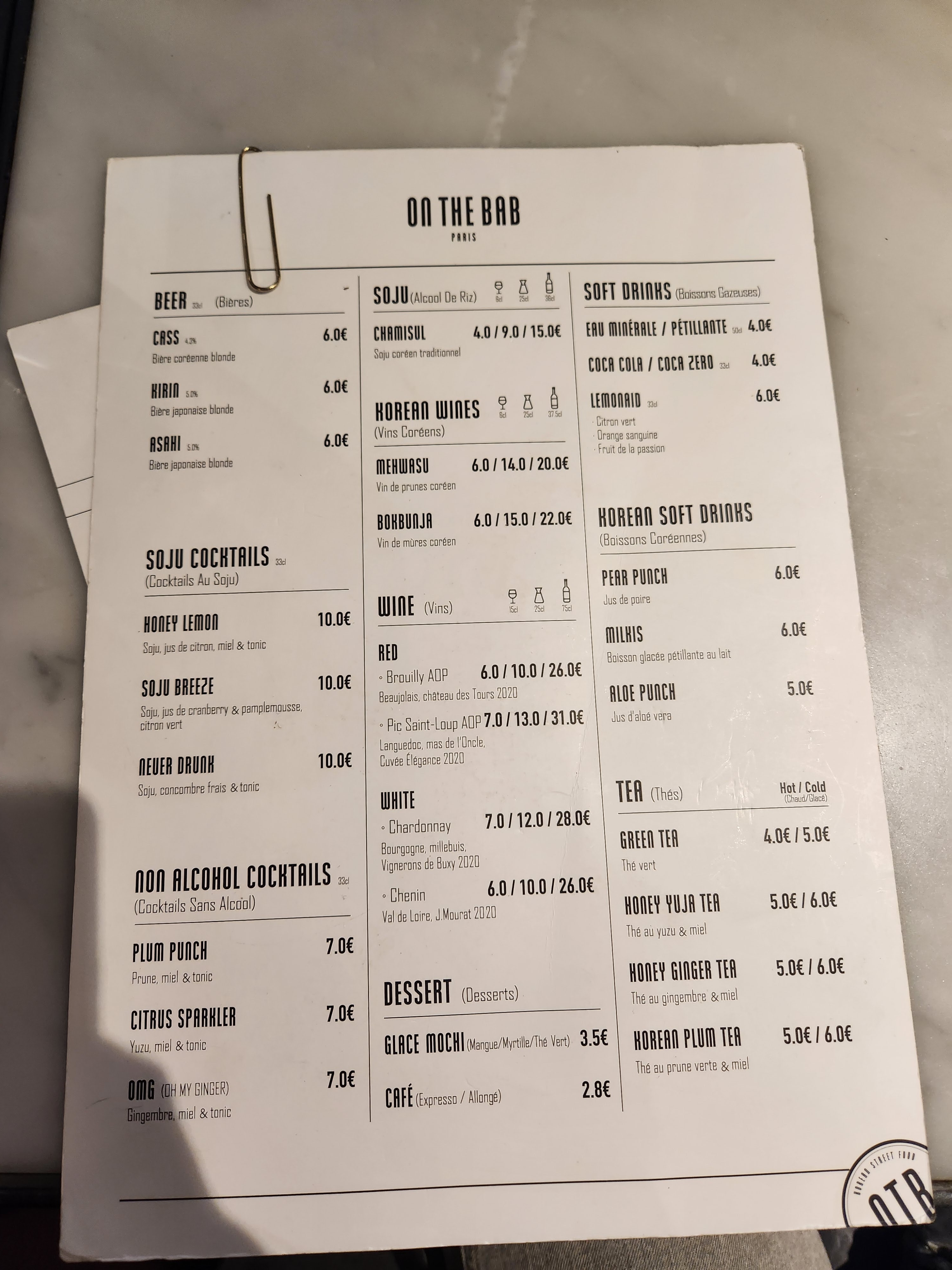Lieu accueillant et personnel charmant, on the bab est un restaurant coréen incontournable de Paris. On y mange bien, pour des prix raisonnables (menu midi entrée + plat 17€) Je recommande fortement.
