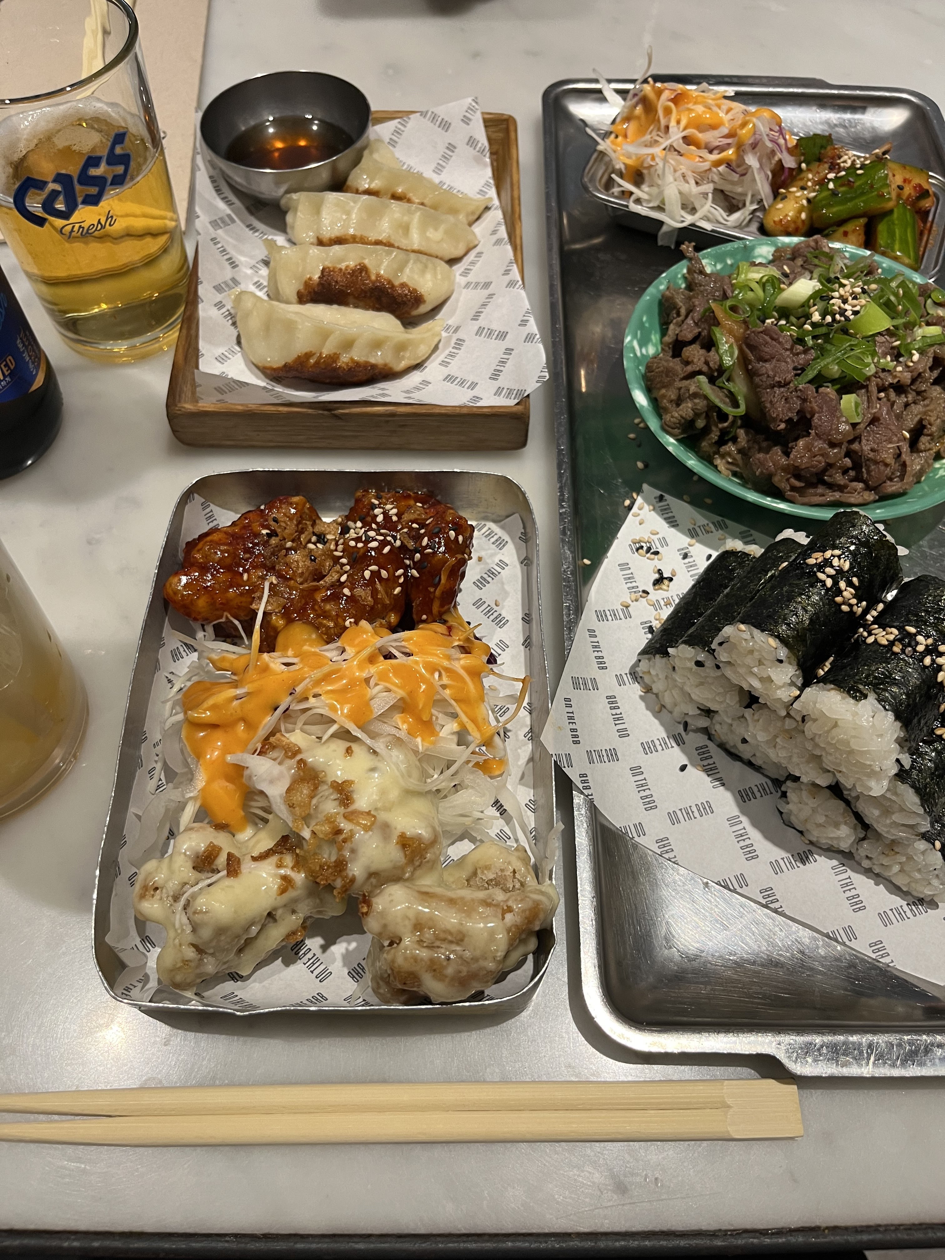 Des plats savoureux, j'ai beaucoup aimé, le bémol est sur le prix, c'est too much. Le plat sur ma photo ; bulgogi et rouleaux riz/algues est a 17euros. Sinon leur kimchi est très bon, on peut choisir 2 goûts pour le poulet frit (excellent) et ils ont des cocktails sympa au soju.