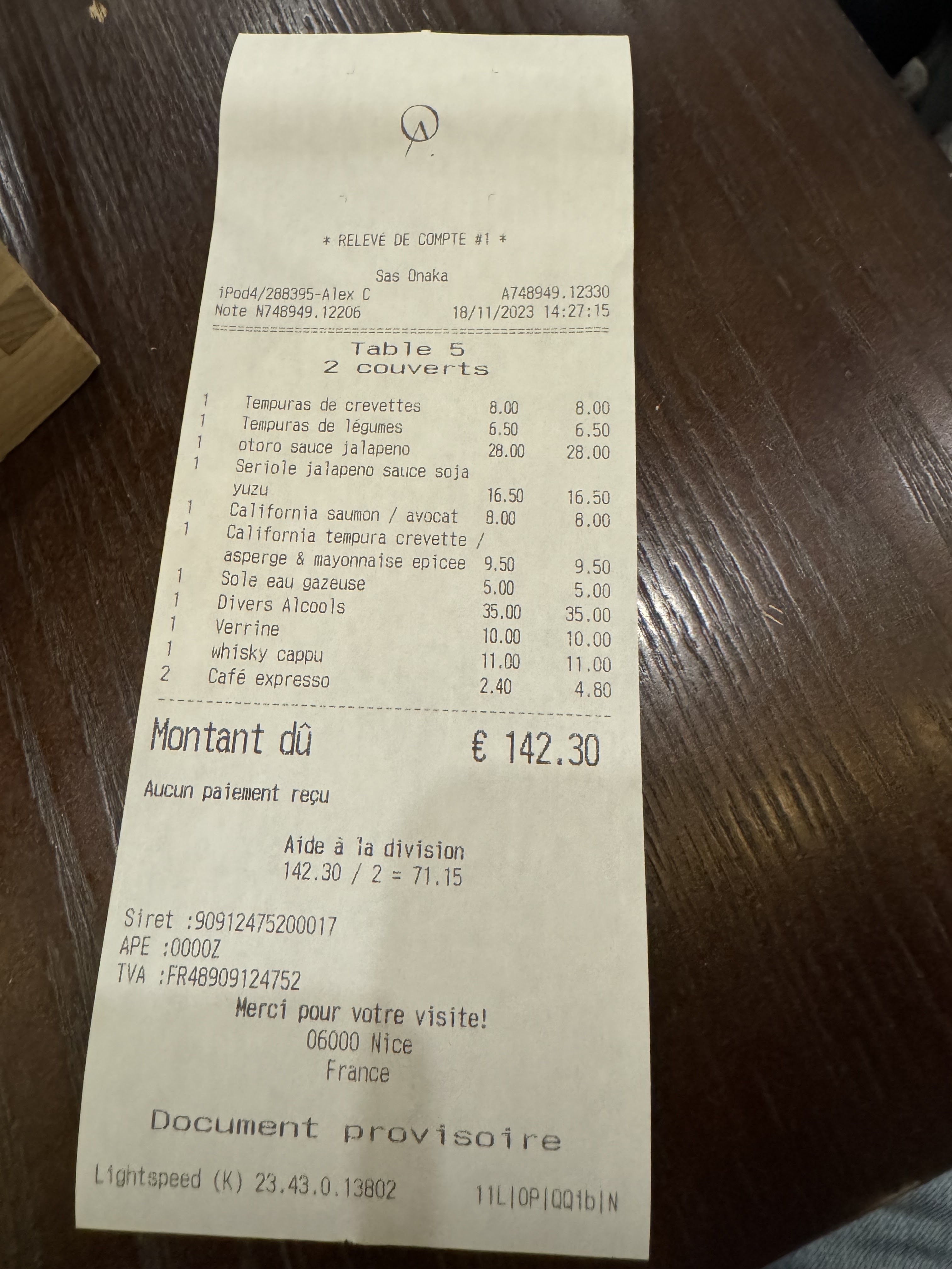 Fraîchement ouvert depuis 3 semaines à Nice. Nourriture : je peux dire que pour mon expérience, c'est assez impressionnant, j'ai commandé divers articles et ils étaient tous bons, l'Otoro n'était pas au menu et a été recommandé par la serveuse et c'était 25 € pour 2 nighiri (la valeur ou non dépend de toi, mais je ne regrette pas) Service : le gars qui nous a accueillis était le seul sympa (les chefs ne comptent pas), tandis que la dame était très désagréable et grossière. Pas de sourire du tout, j'ai amené ma petite fille (8 mois et demi) je lui ai juste demandé s'il était possible d'avoir des légumes bouillis et sa réponse a été non, ils ne sont que 3 dans la cuisine et déjà trop occupés pour fais quelque chose de plus pour toi smdh... Je veux dire, je peux comprendre qu'ils sont occupés et tout, mais elle aurait au moins pu essayer de demander et ensuite me dire ça, depuis quand la serveuse décide quoi faire et ne pas faire dans la cuisine?? Prix : c'est en fait assez bon marché pour l'endroit où vous êtes (juste derrière la rue principale de Nice) j'ai dépensé 171€ pour 3 adultes et 2 bébés (donc ils ne comptent vraiment pas). Dans l'ensemble: je recommande à tous ceux qui n'ont pas d'enfants d'y aller, la nourriture est très bonne avec des améliorations à apporter, mais la dame de service doit être licenciée.