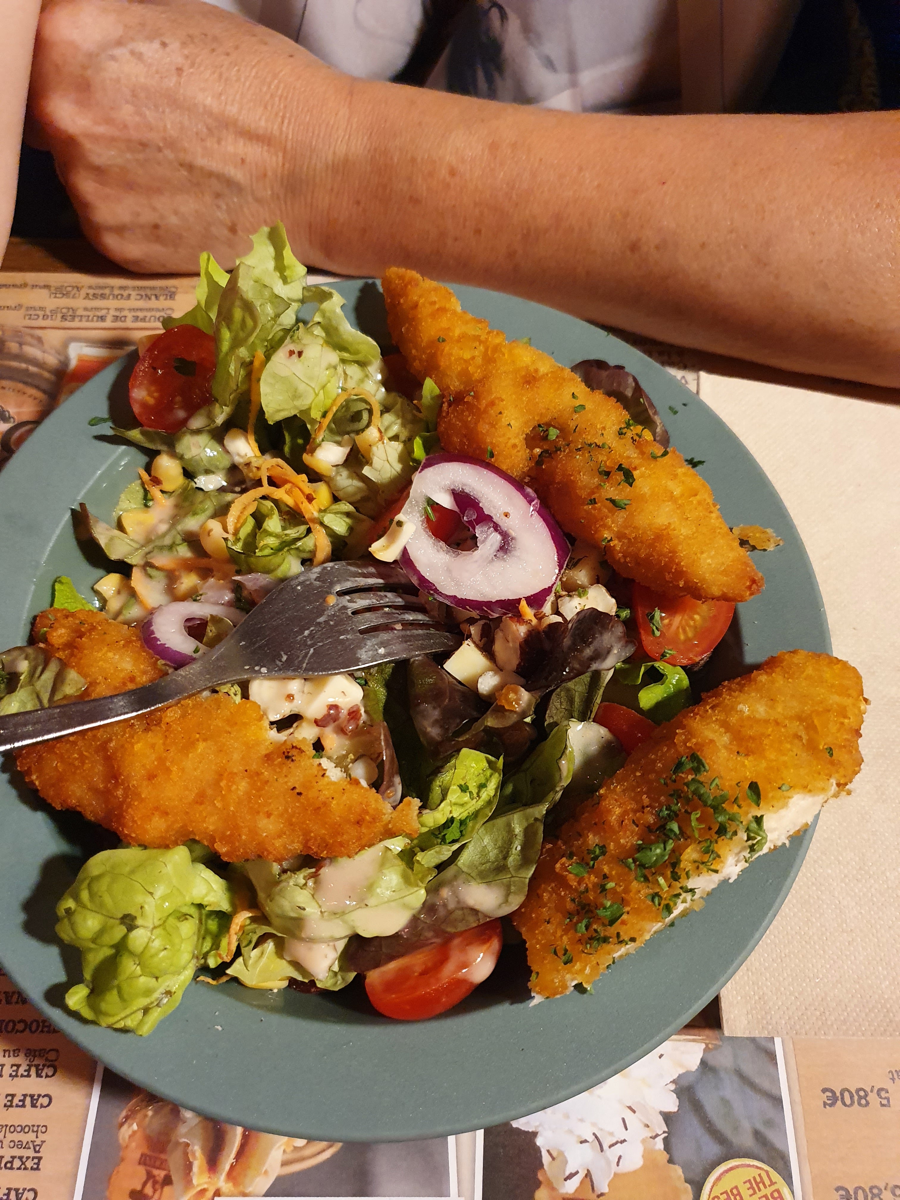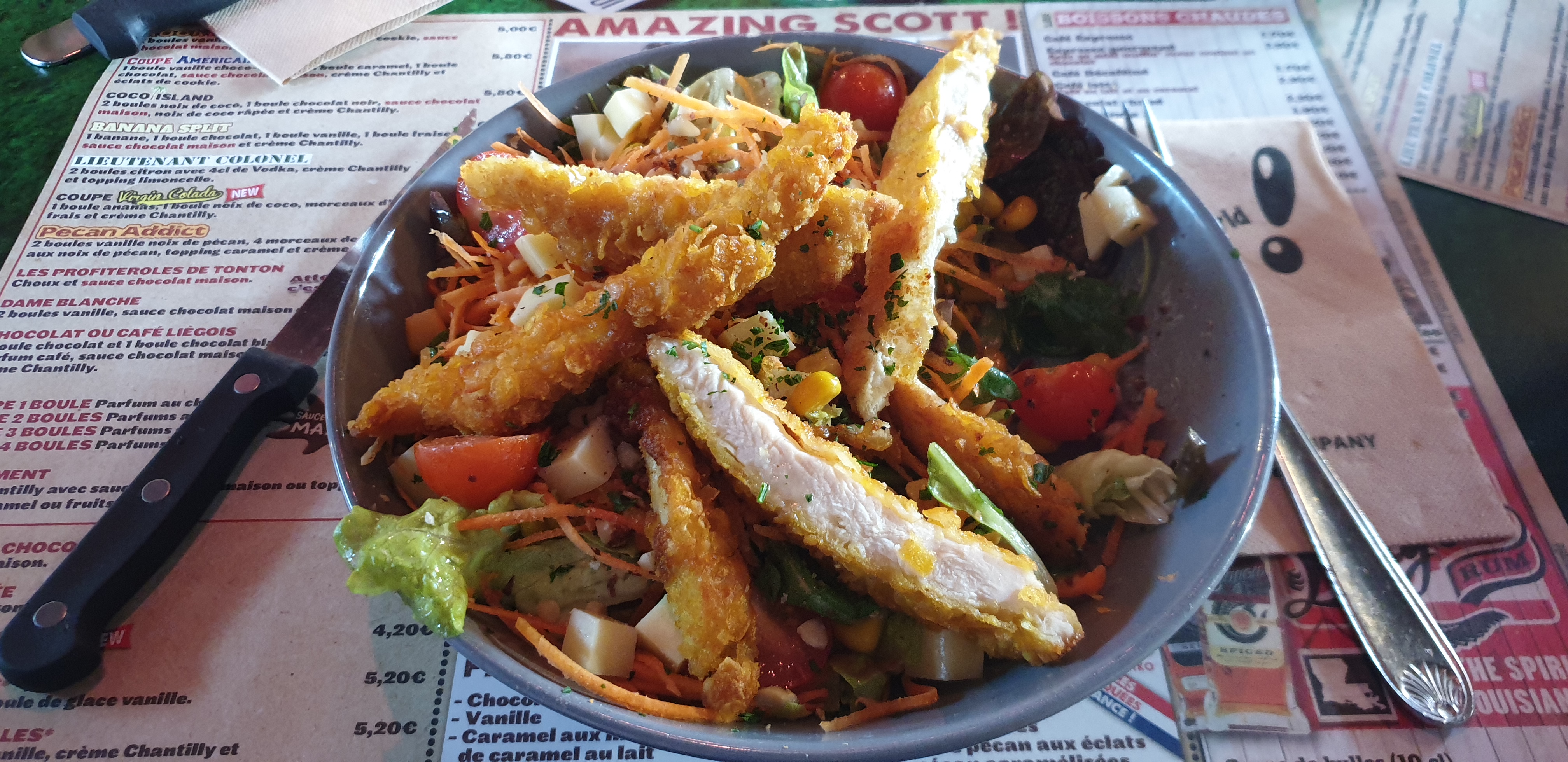 Salade et plat de viande bien garnis. C est classique et bon. Un petit moins pour le dessert.