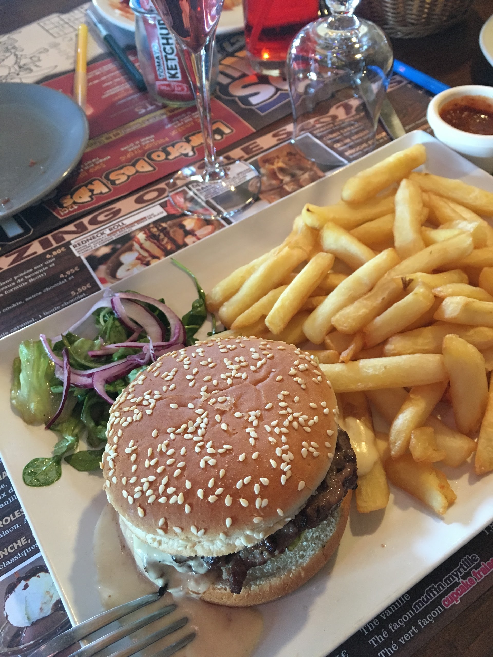 L'endroit veut vous emmener aux États-Unis mais y parvient en partie. Bonne mise en scène mais la carte est majoritairement composée de surgelés. Je pense qu'un peu de musique country américaine devrait être jouée en arrière-plan. L'endroit était assez chaud, peut-être pour pousser à commander des boissons. En effet, on nous demande si nous souhaitons commander des cocktails et des amuse-gueules. Les assiettes sont arrivées rapidement. Les serveuses (2 filles) sont très dynamiques. Cet endroit mérite 4* au maximum.
