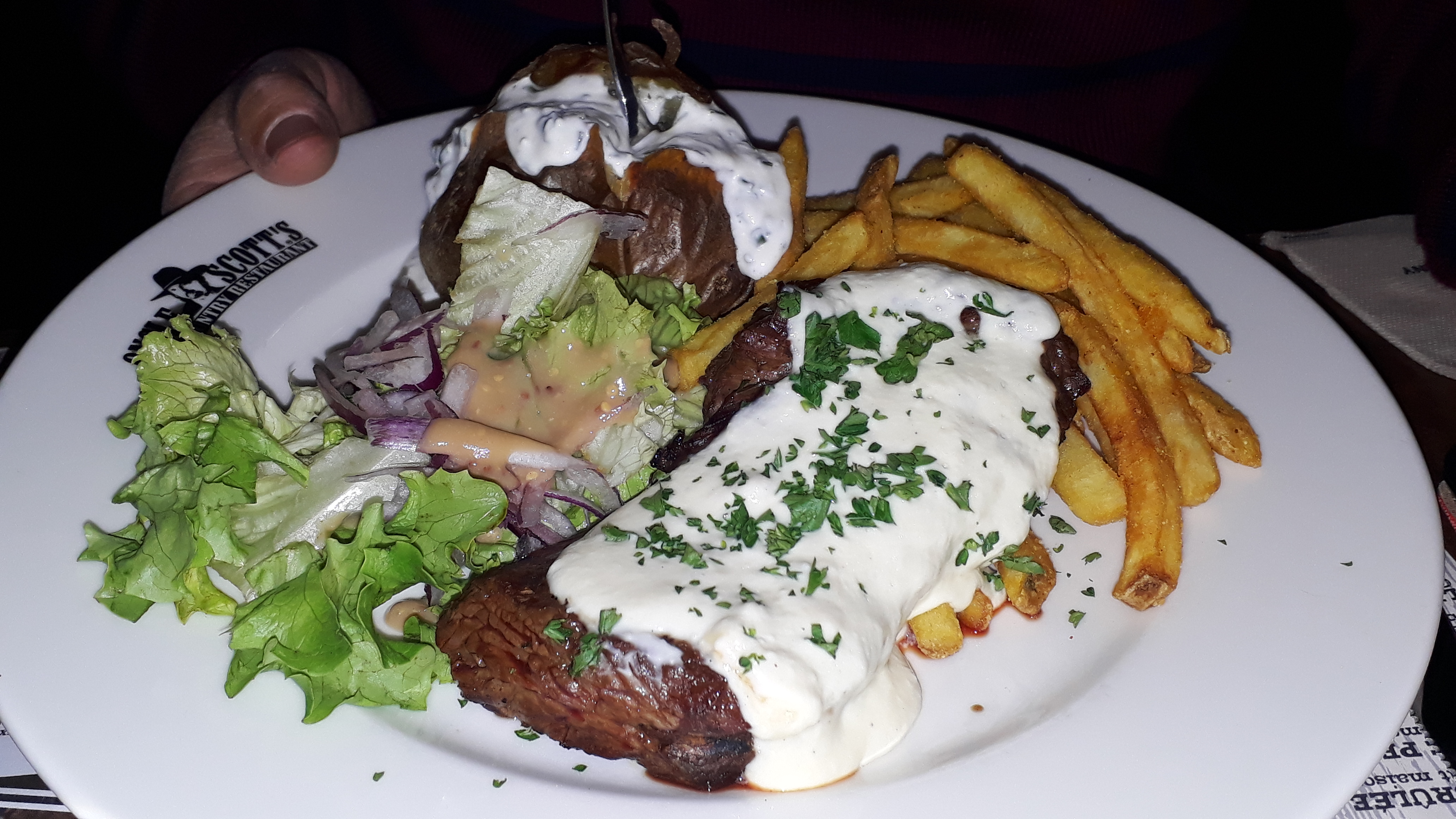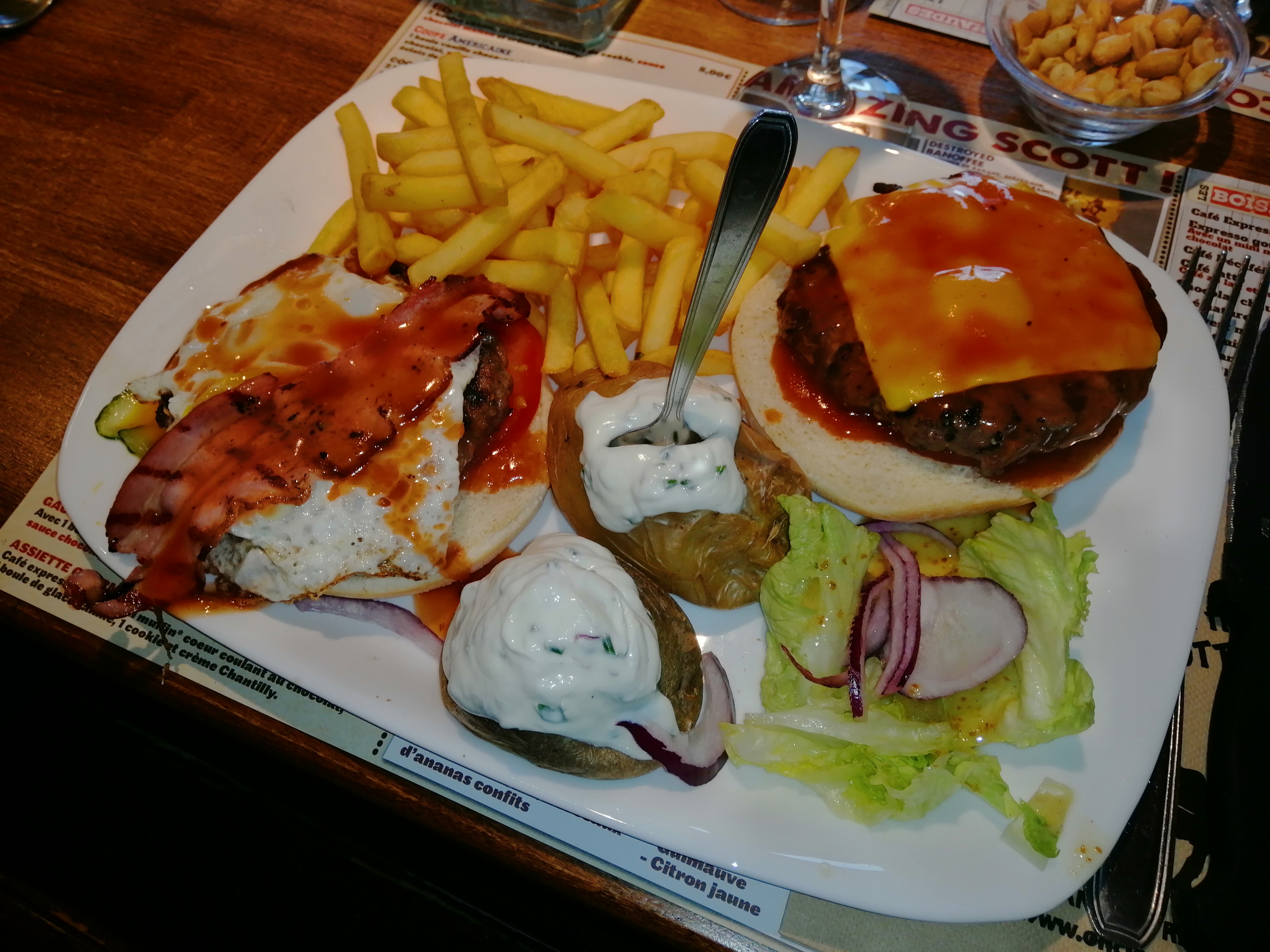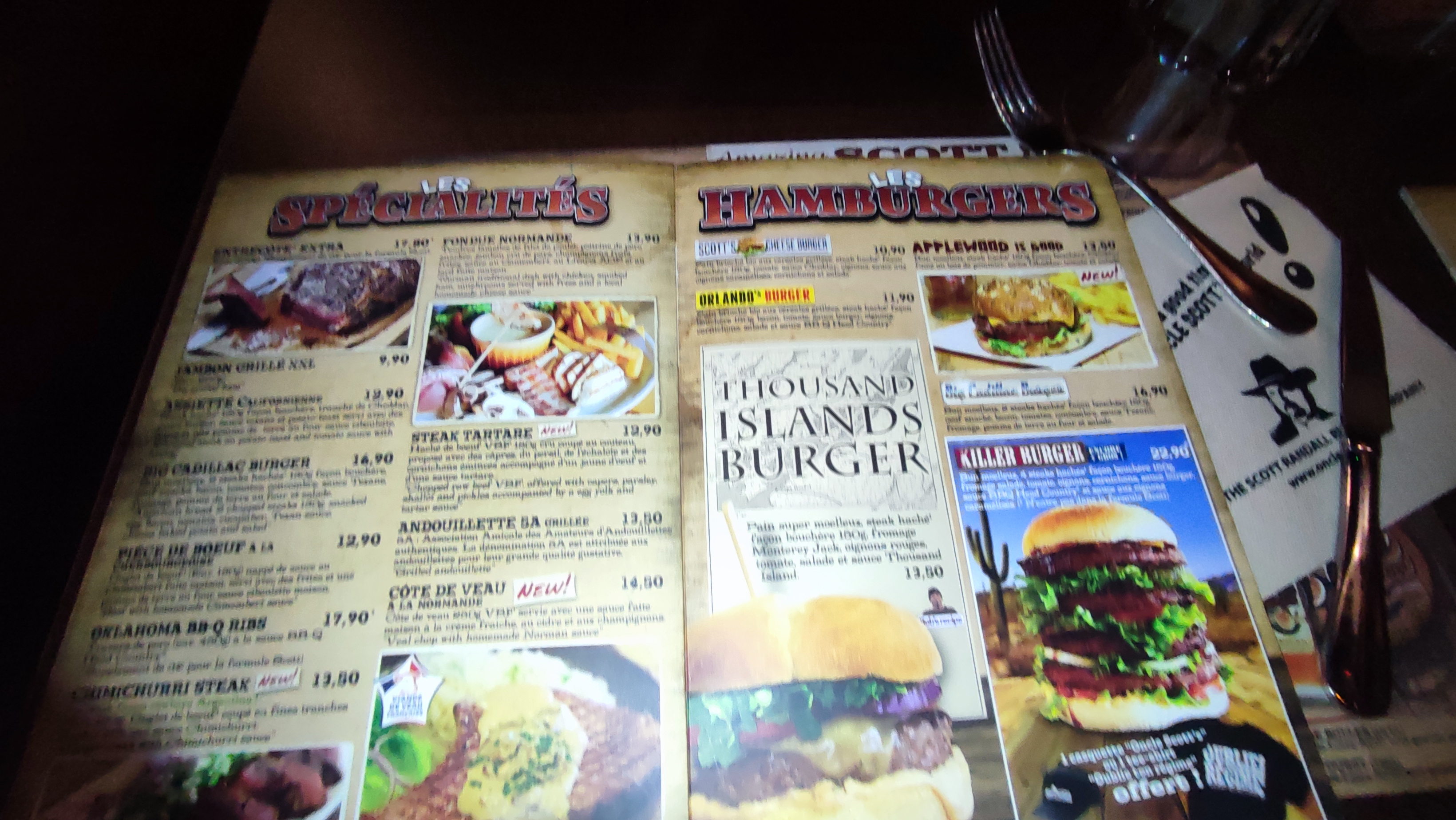 Obliger de s éclairer avec le portable pour voir ce qu'on a dans l'assiette De plus vous demandez une viande bien cuite elle arrive cramer d'un côté et rose de l'autre..les frites replonger dans l'huile.. goût infâme La salade qui vous es poser dans l assiette est très moche . Feuilles abîmés tout juste bon pour un lapin Oncles Scott n'est plus ce que c'était Vous perdez 4 clients
