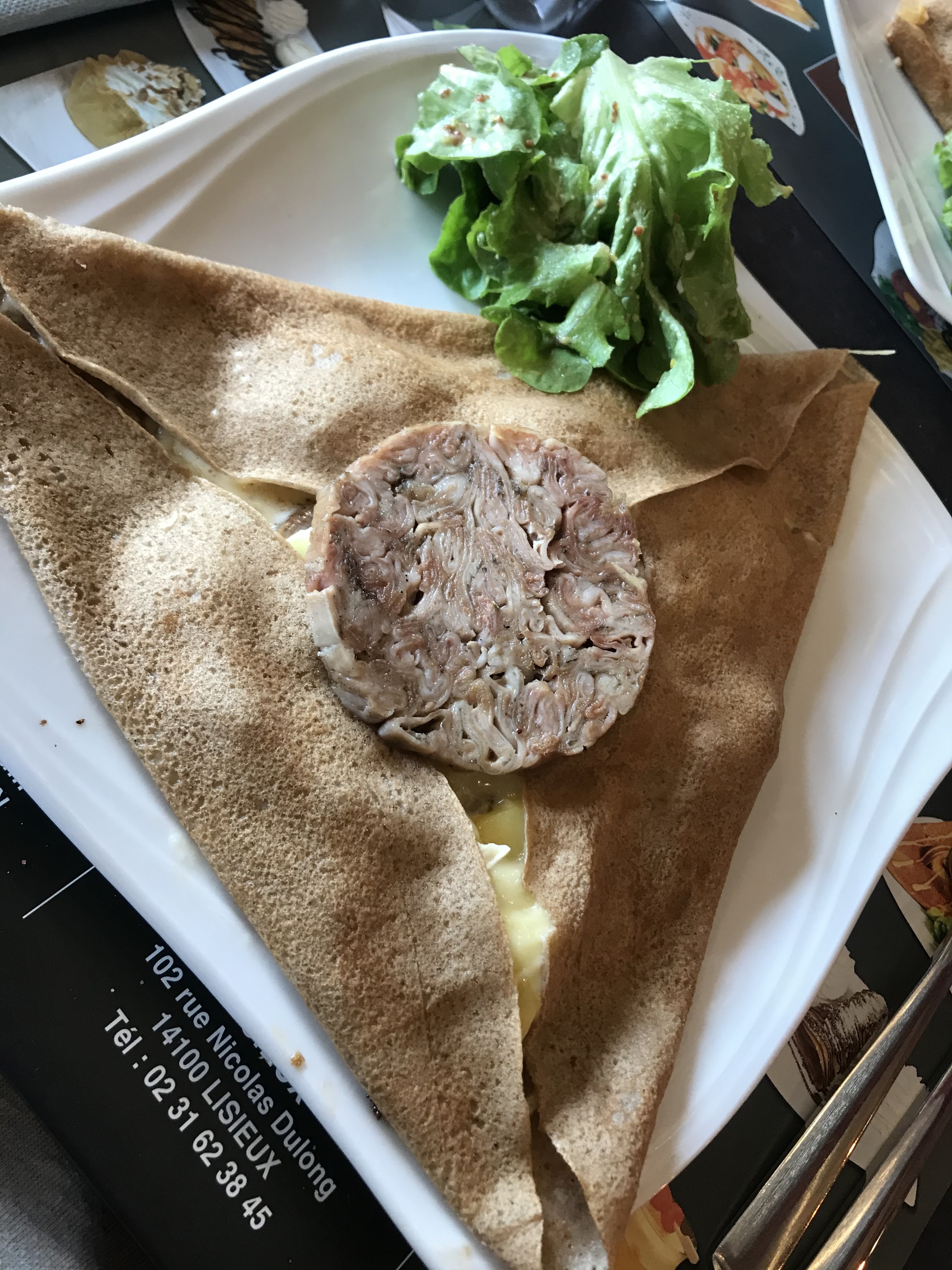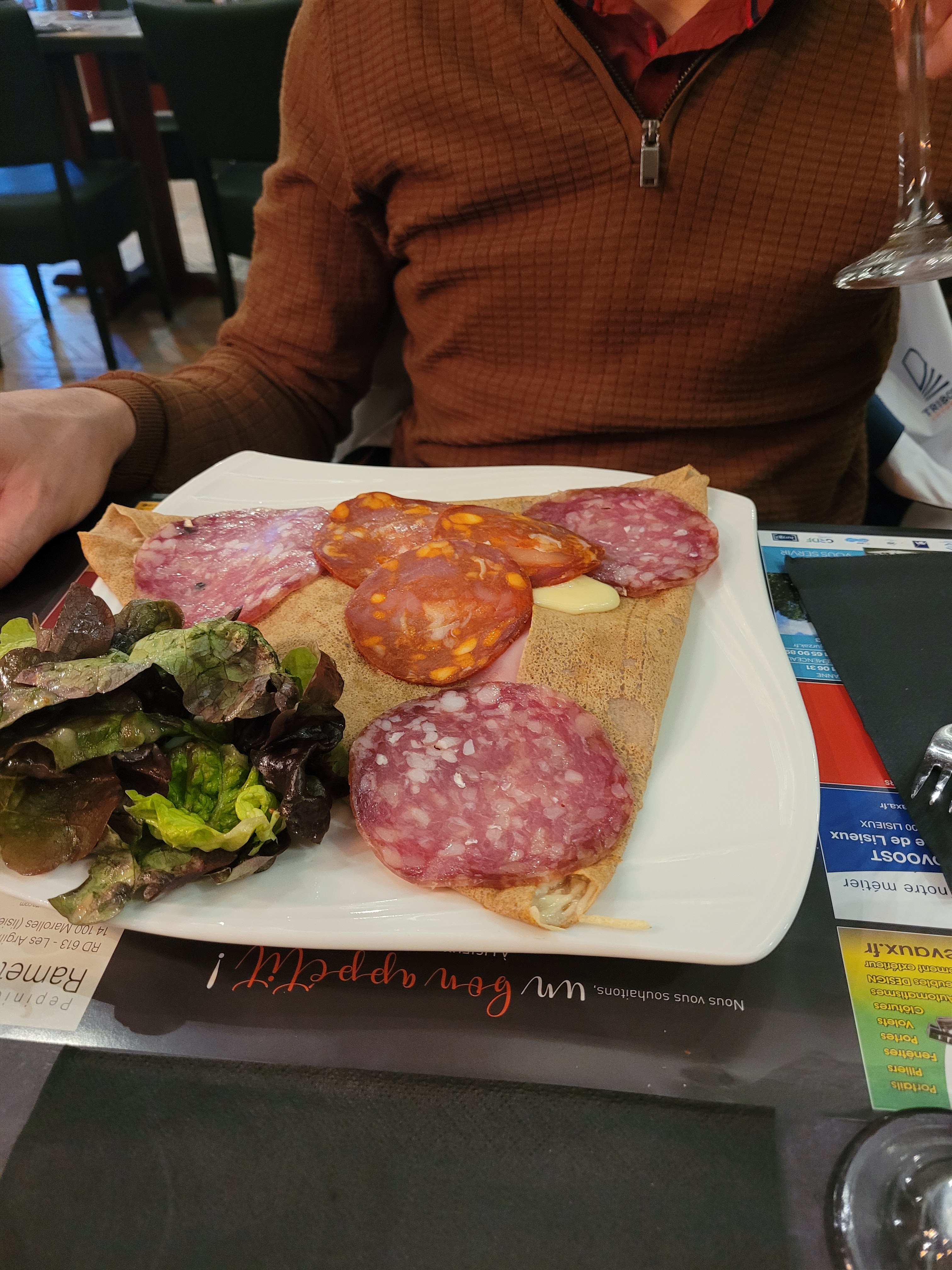Que ce soit lisieux ou bernay il faut arrêter de mettre du déjà tout fait quiche pas assez cuite j ai demandé de la salade à la place des frites 4 feuilles jambon grille limite sauce aux poivres sans goût et en plus crème brûlé liquide lieu quasi non chauffé on a du manger avec nos vestes bref ça s est lisieux Bernay plateau camembert non coulant charcuterie acheté en magasin et heureusement qu il y avait le pain car sérieux une demie tranche de jambon roulé 3 tranches de saucissons sec 1 tranche de pancetta et une fine tranche de jambon fumé on voyez à travers le chorizo j ai du réclamer car dans mon assiette manquant bref 2 déceptions fini pour moi ou alors qu ils ne fassent que des crêpes