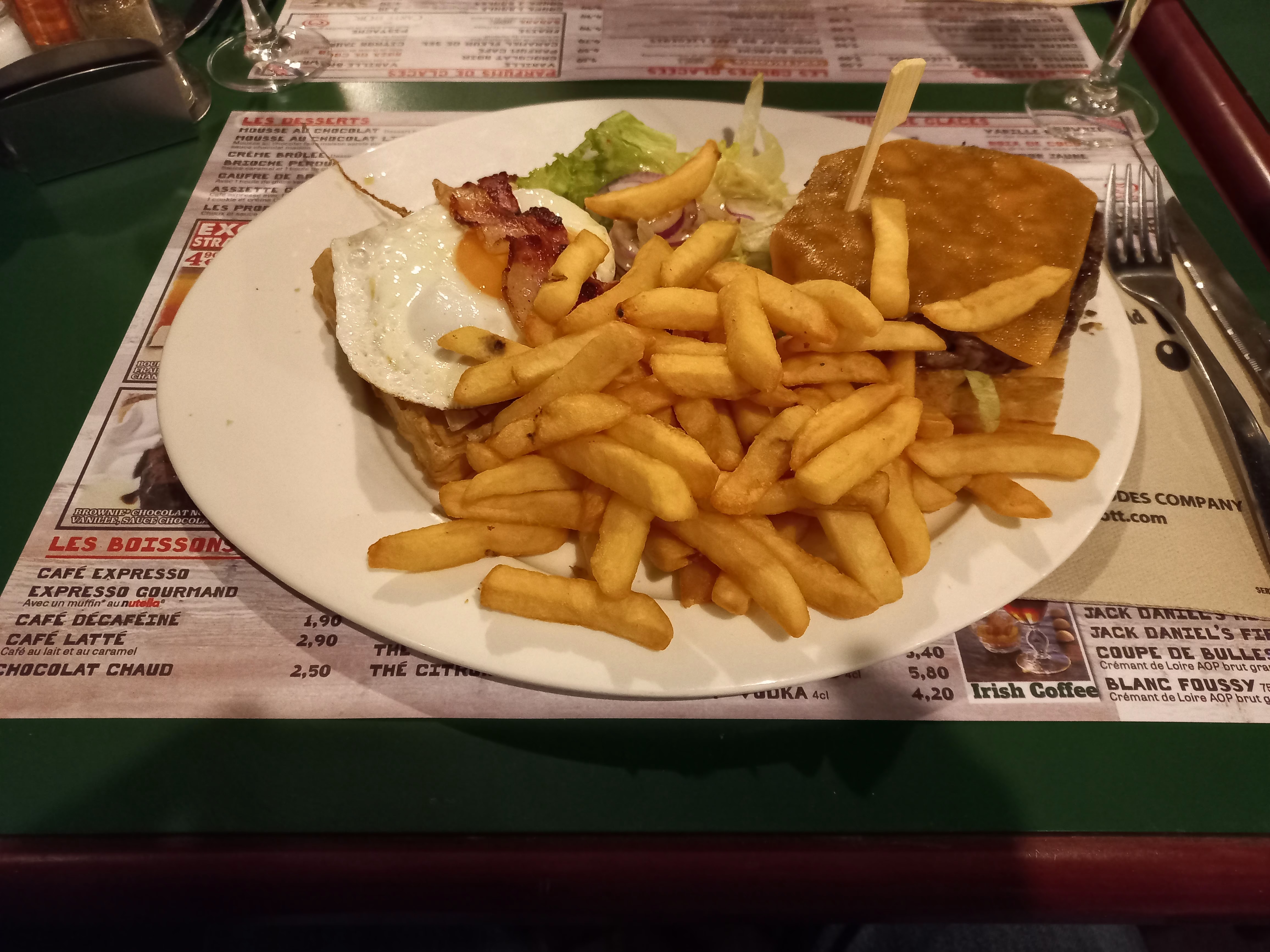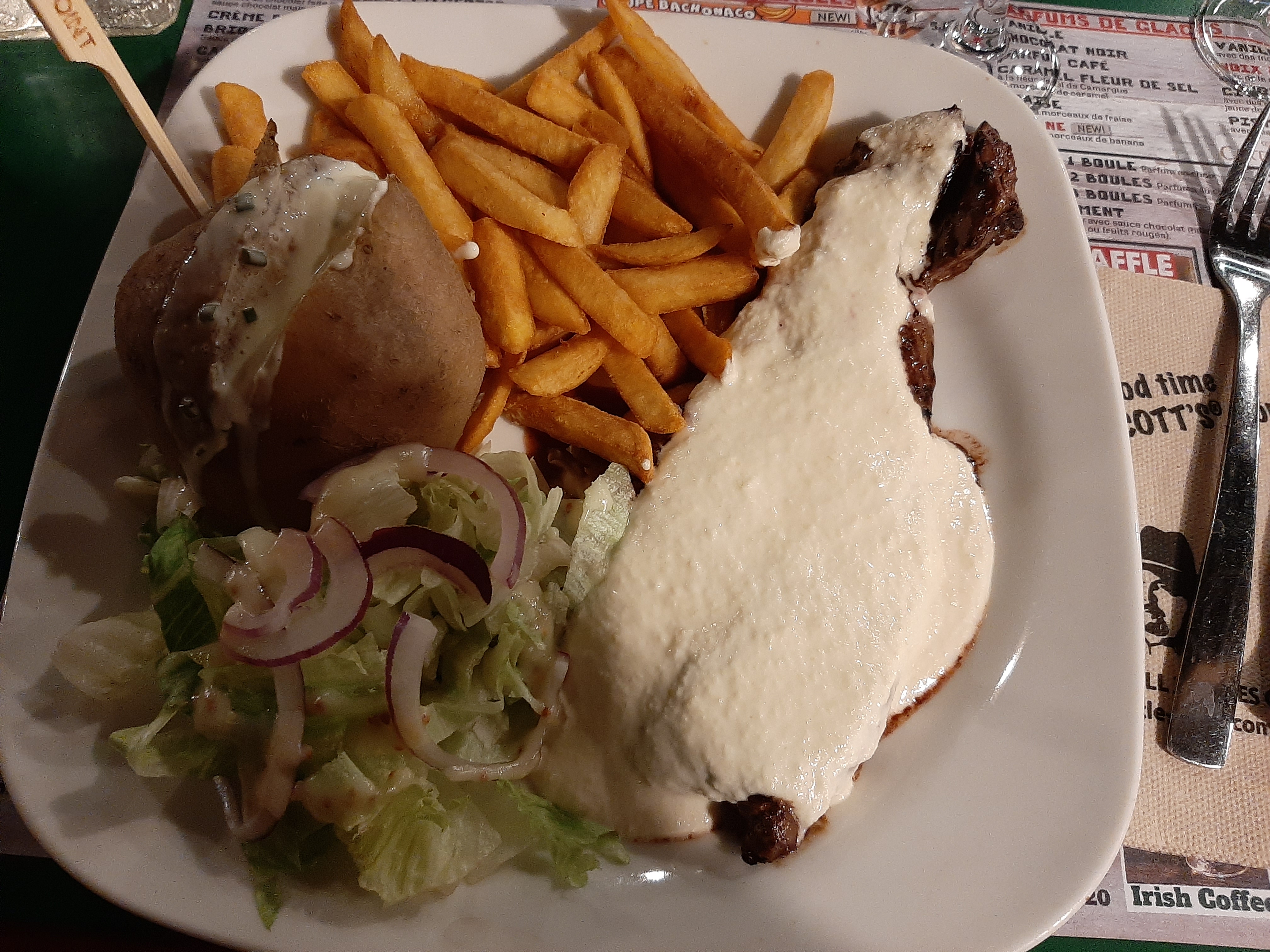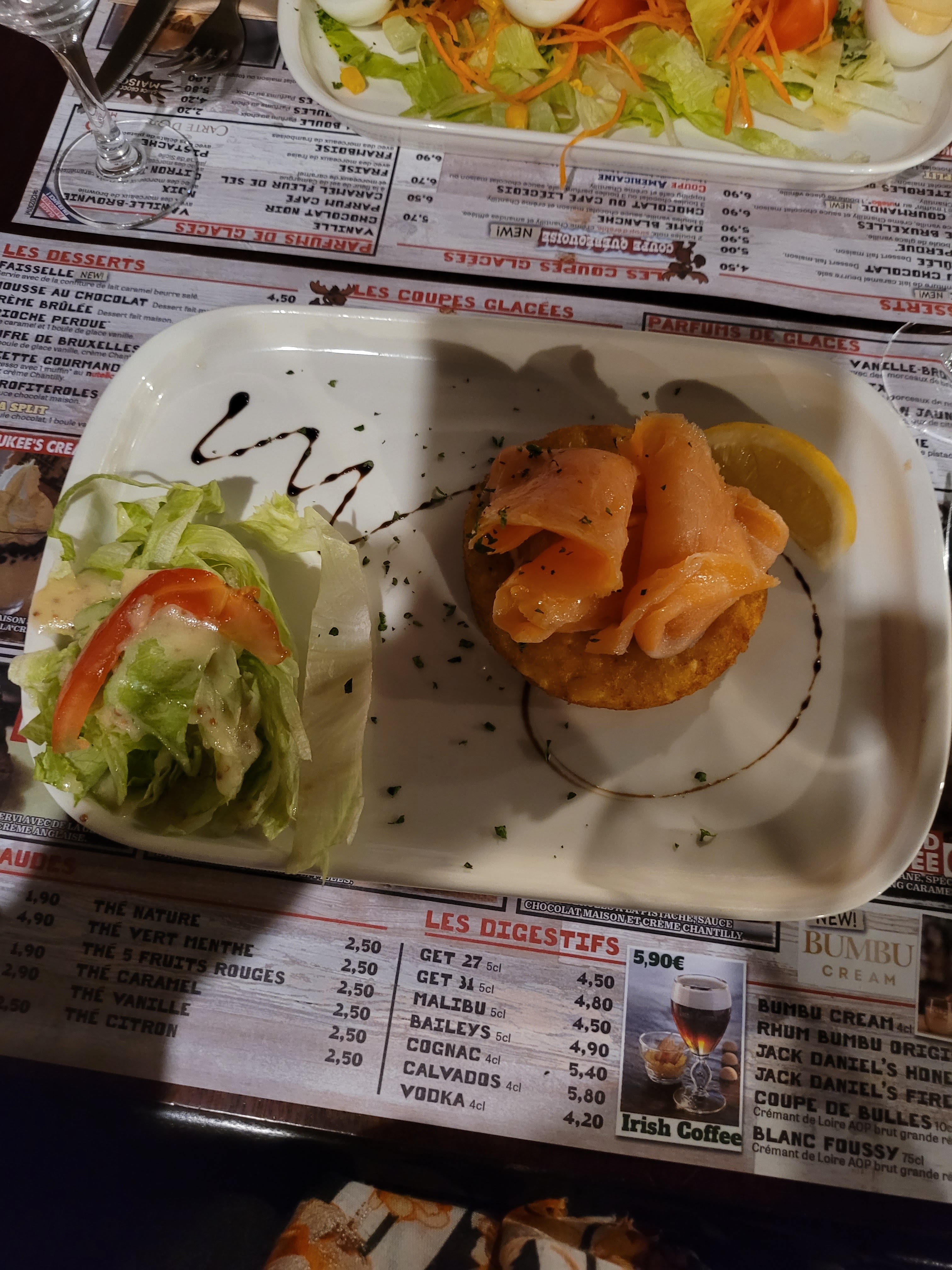 Repas de qualité et copieux. Je recommande le cocktail zombie L'assiette Californienne et le burger killer très bon. Dommage que pour la pomme de terre la crème ai été posé dessus et pas dedans donc elle a coulé dans l'assiette et non dans la pomme de terre .