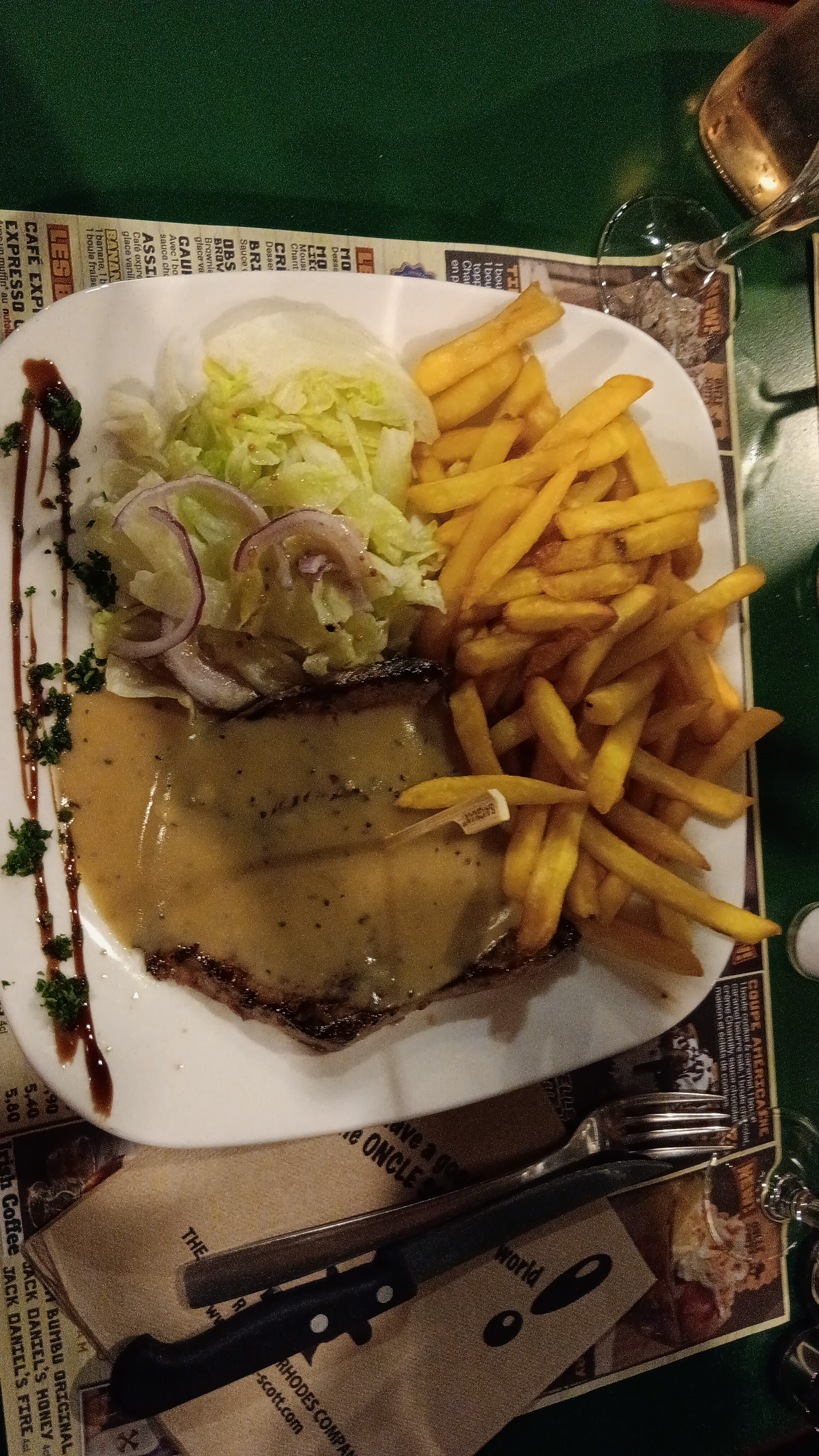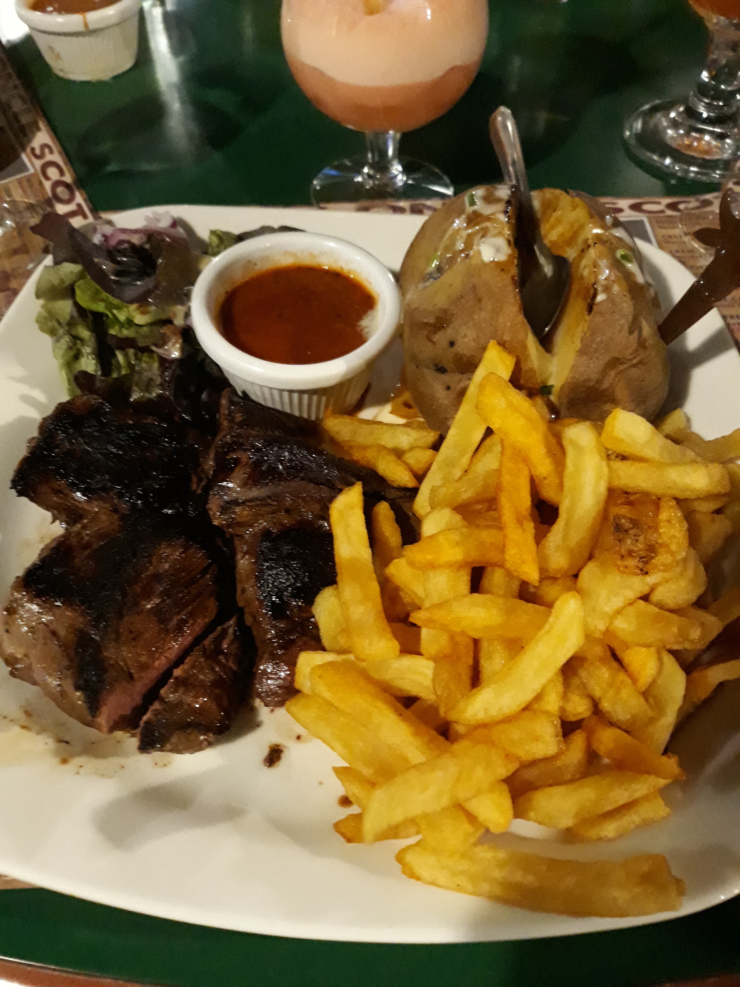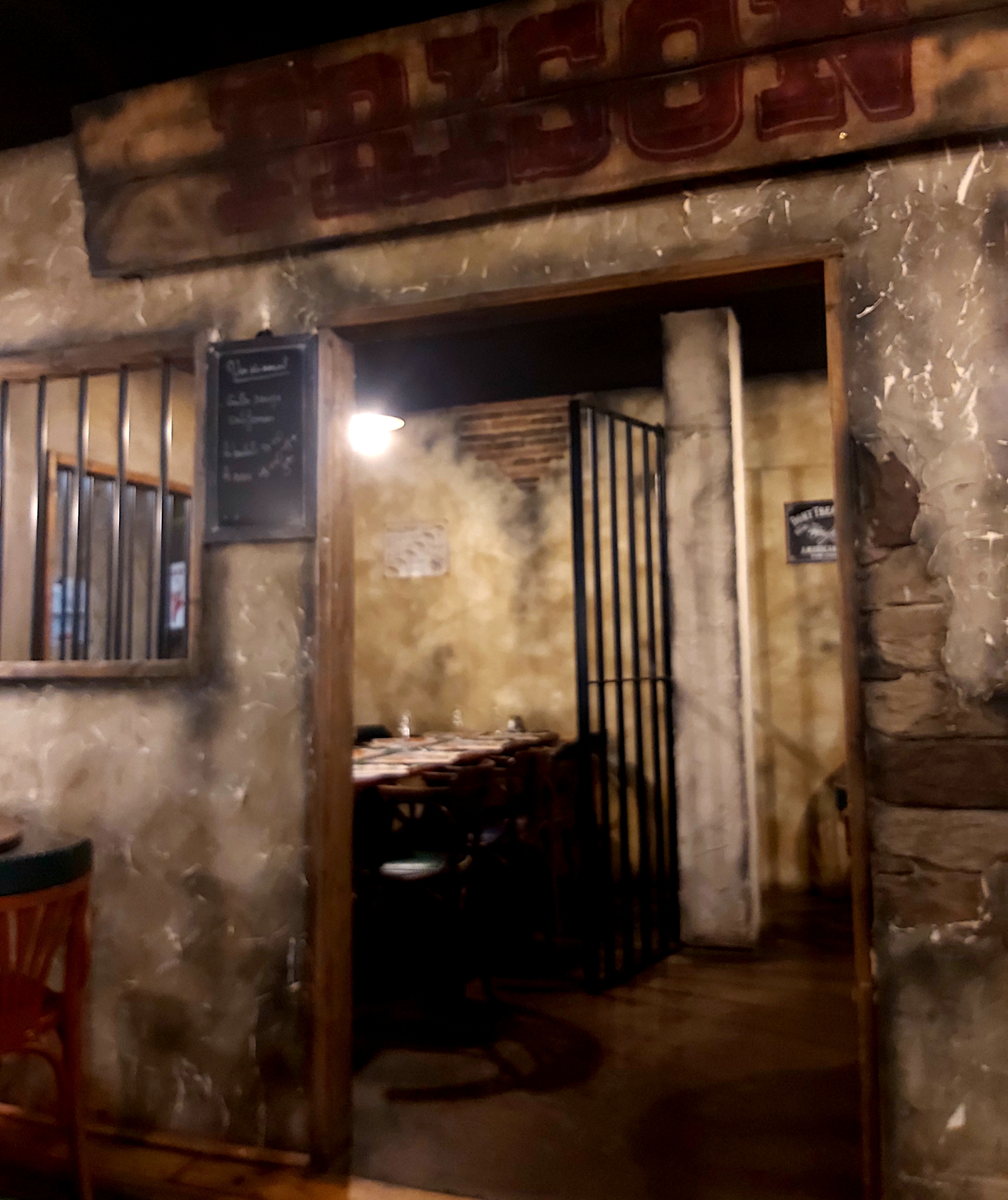 La déco est très sympa. Possibilité de manger dans un wagon, une roulotte, une prison… le service est efficace et cordial. L’entrecôte est une belle pièce de viande, cuite comme demandé. Il manque juste 2 choses à la carte : des wings de poulet et, pour les non amateurs de desserts, une assiette de fromage. Sinon c’est conforme à ce que nous nous attendions dans ce genre de restaurant.