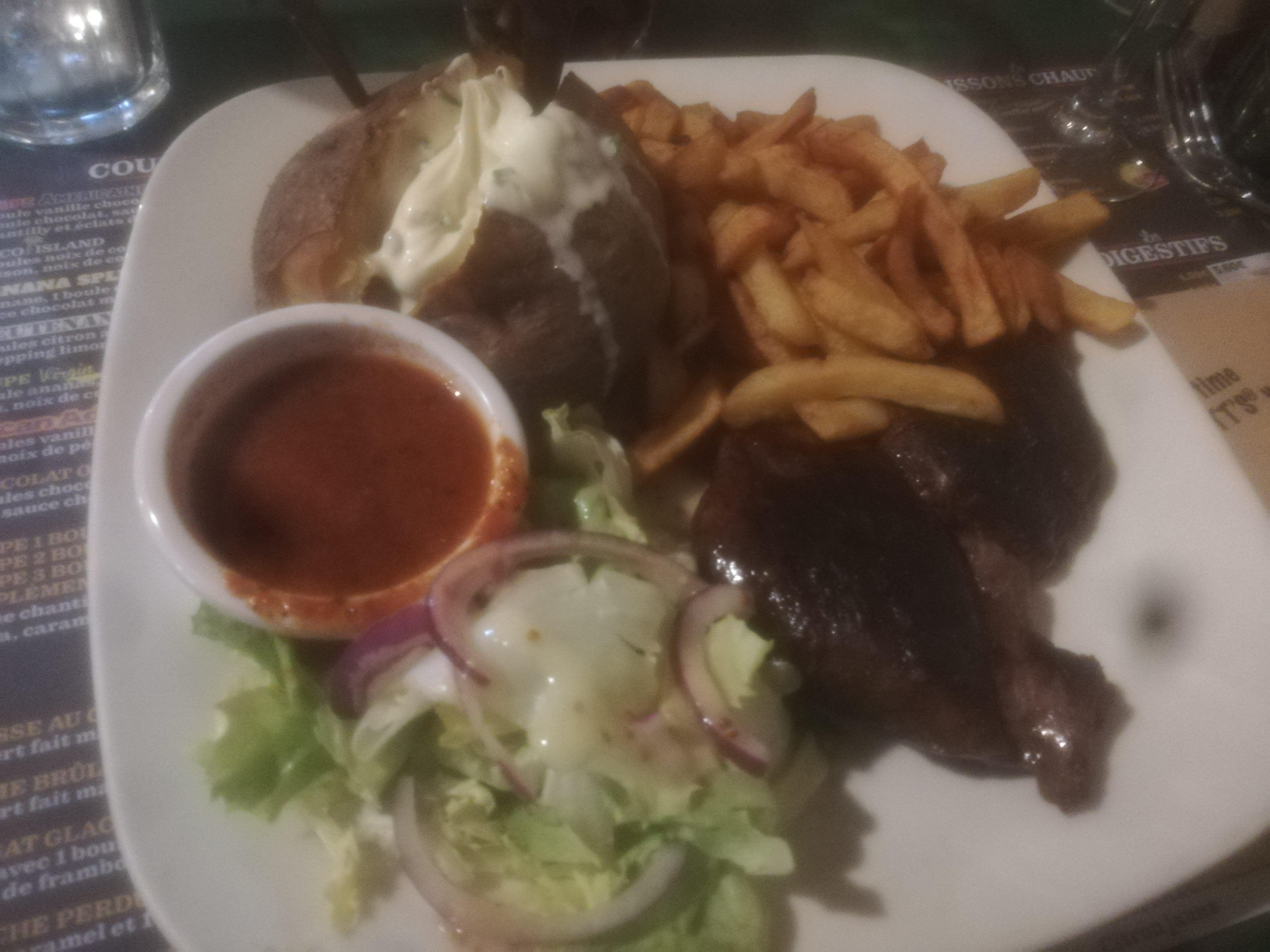 Plats servis en même temps que l'apéro, sympa pour une soirée d'anniversaire... La cuisine en a fortement perdu , frites congelées de piètre qualité, fondue de.tonton avec sauce fromagère tranchée et granuleuse. Aucun intérêt... Aucun geste commercial