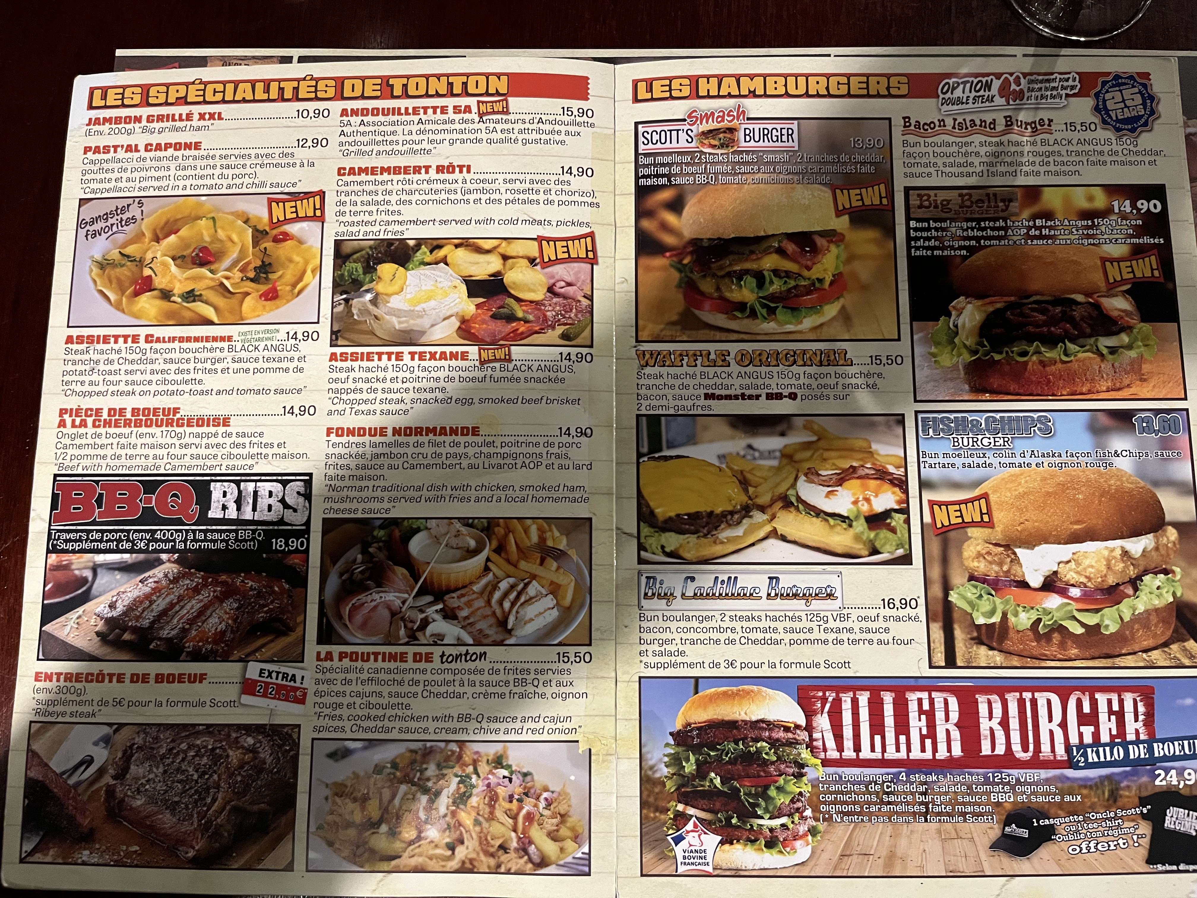 Ce restaurant est un lieu très riche en décoration et en bonne nourriture🍔🥓🥩🍟🌮 Le menu proposée est plutôt imposant avec une histoire du restaurant et de sa création 🗞📜 Les services proposées sont agréables et le bowling de la ville est rattaché au restaurant.🎳🎉 Même si je trouve le restaurant un peu cher, c'est un lieu que je vous conseille pour profiter entre amis et en famille ✌ N'hésitez pas a vous mettre au défi du burger killer ( de mon côté j'ai gagné le t-shirt ✅👕🕶🧢 )