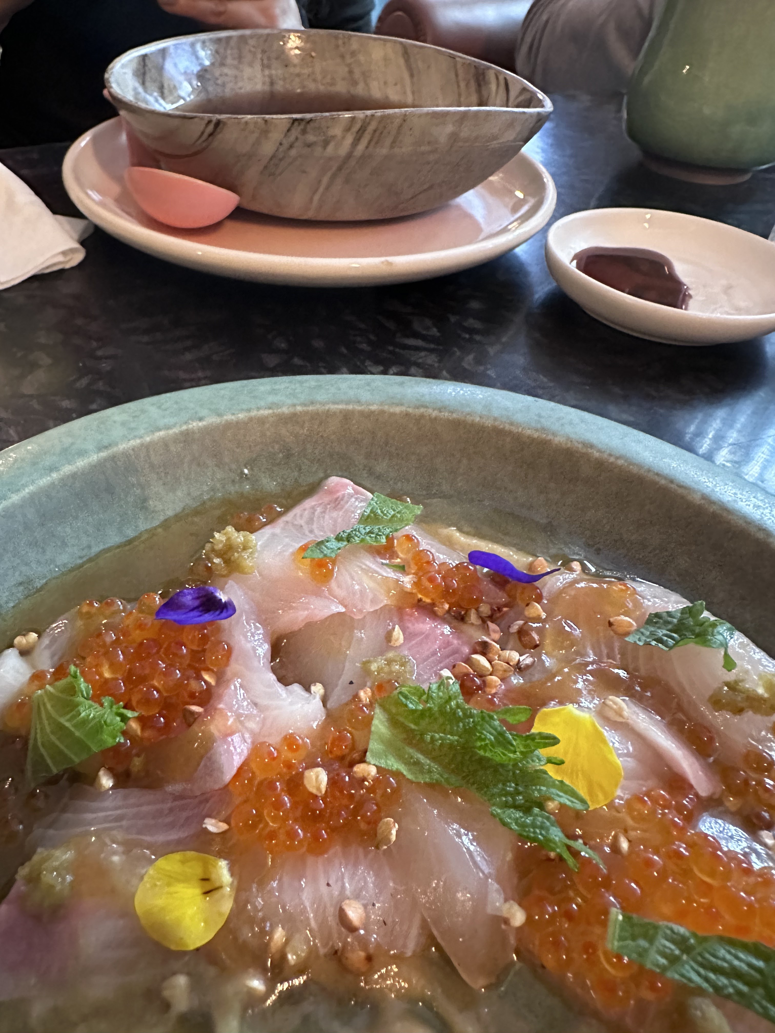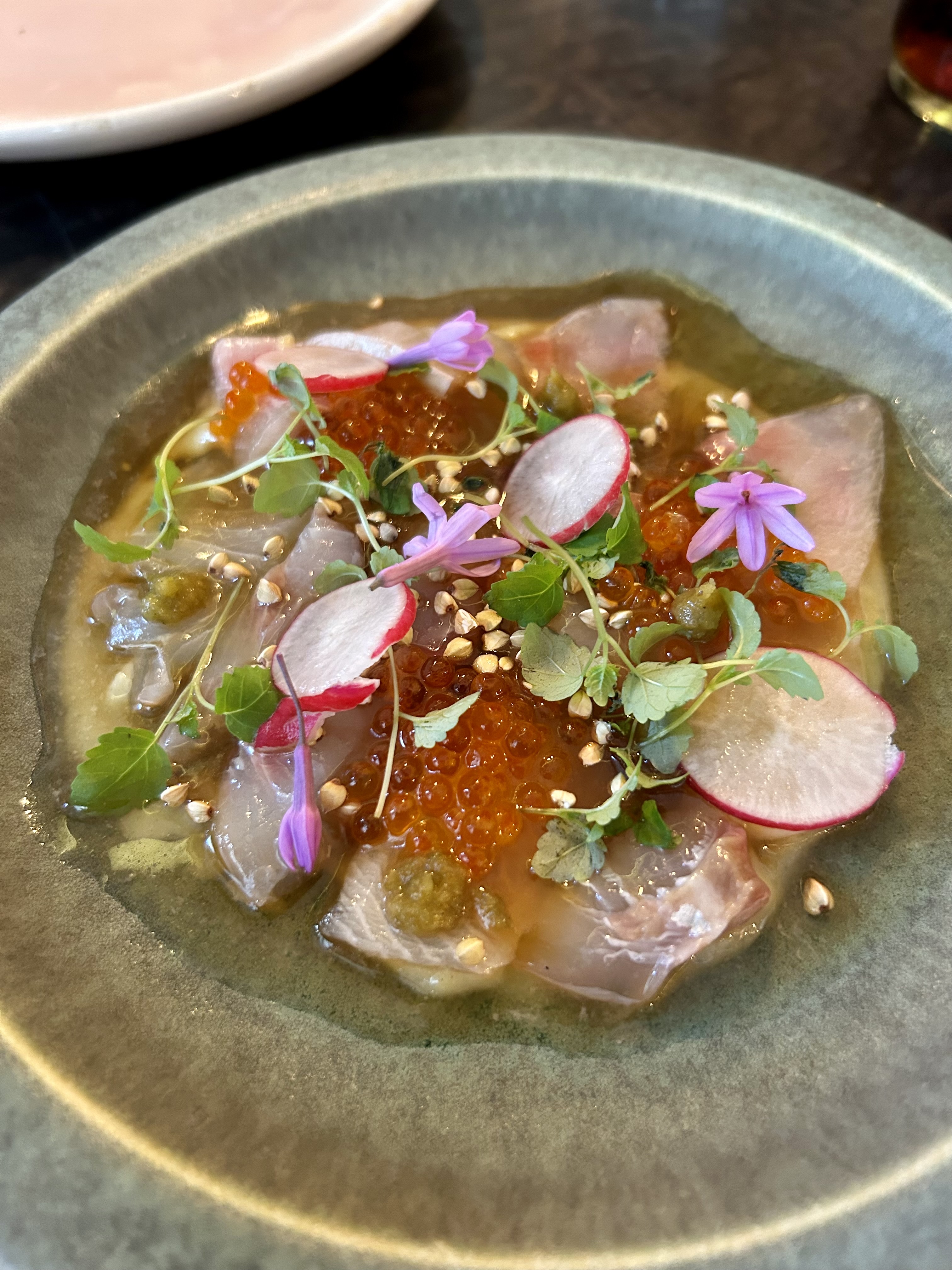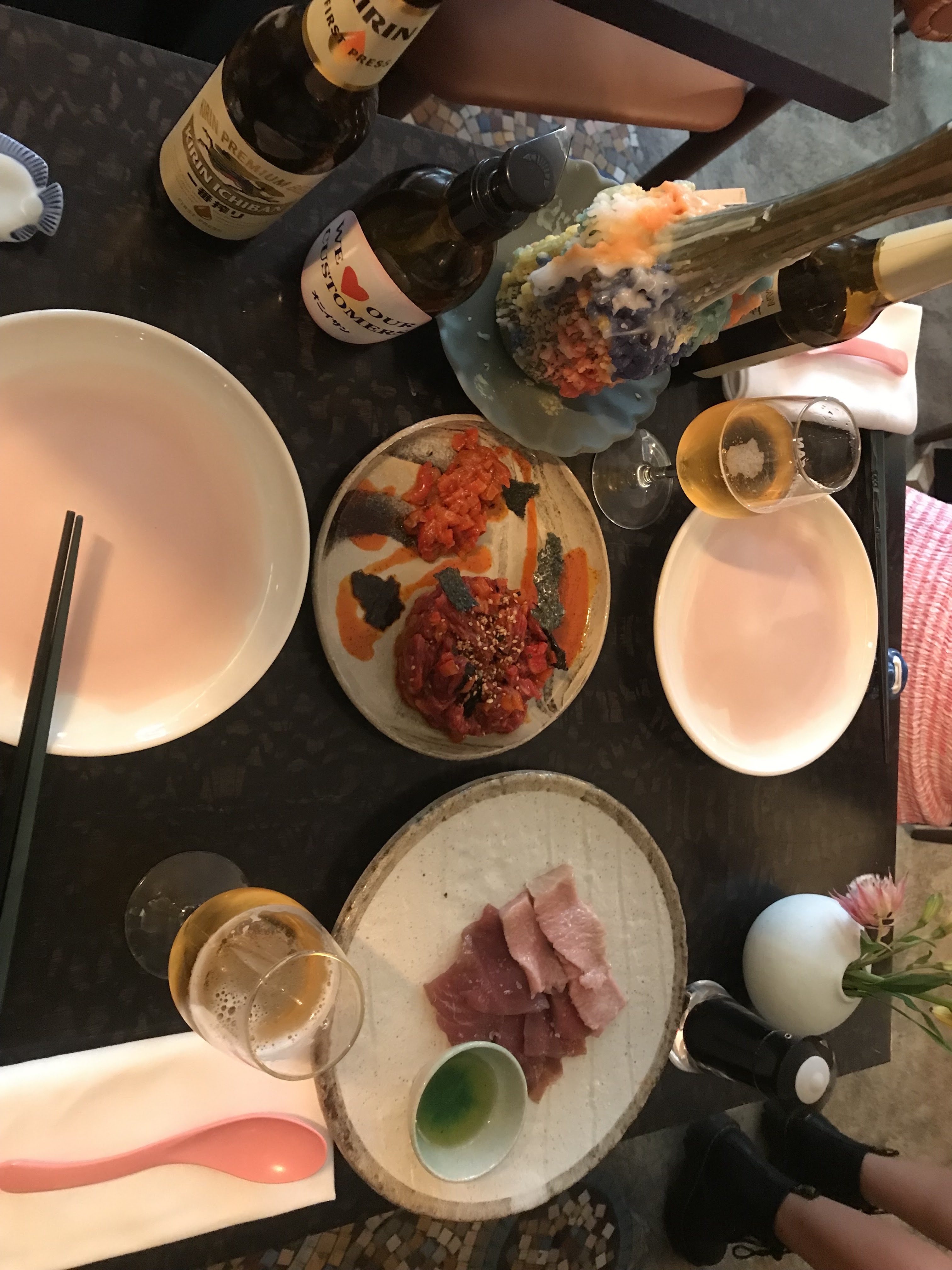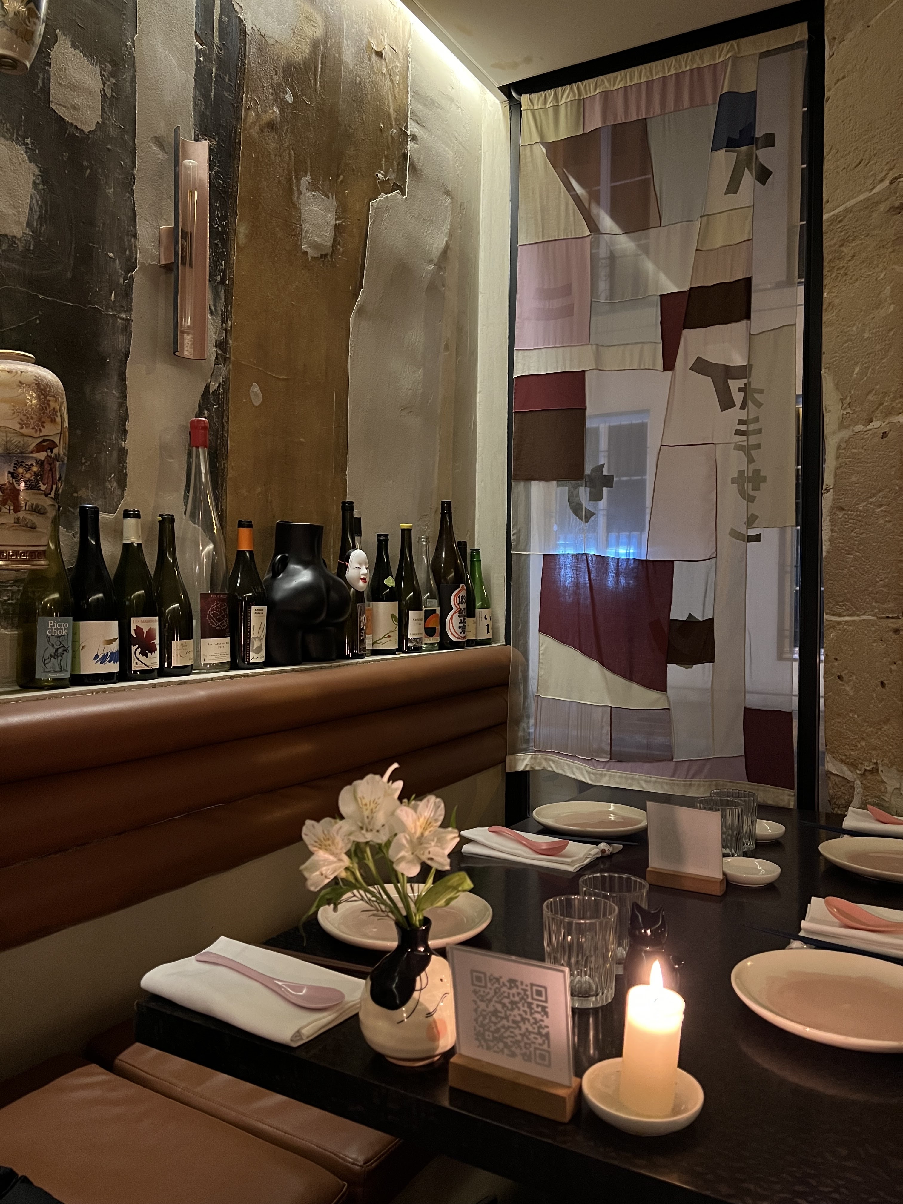 Restaurant dont on parle beaucoup en ce moment. Le cadre est très jolie grande attention sur la déco à chaque recoin. Les serveuses sont très sympathiques. La carte a des prix assez élevées et les portions dans l’assiette sont plutôt moyennes. Les avis sur le restaurant sont très mitigé et pour ma part j’ai été un peu déçue, le tartare de boeuf ainsi que l’aubergine miso manquait d’assaisonnements. La bavette de wagyu était simple il n’y avait rien d’extraordinaire. Par contre le thon gras maturé accompagné d’huile de shiso et juste de la fleur de sel dessus excellent, la maturation apporte plus de texture au poisson et un parfum, c’était divin. La carte change assez souvent donc c’est vraiment en fonction des goûts de chacun, les produits utilisés sont de qualités.