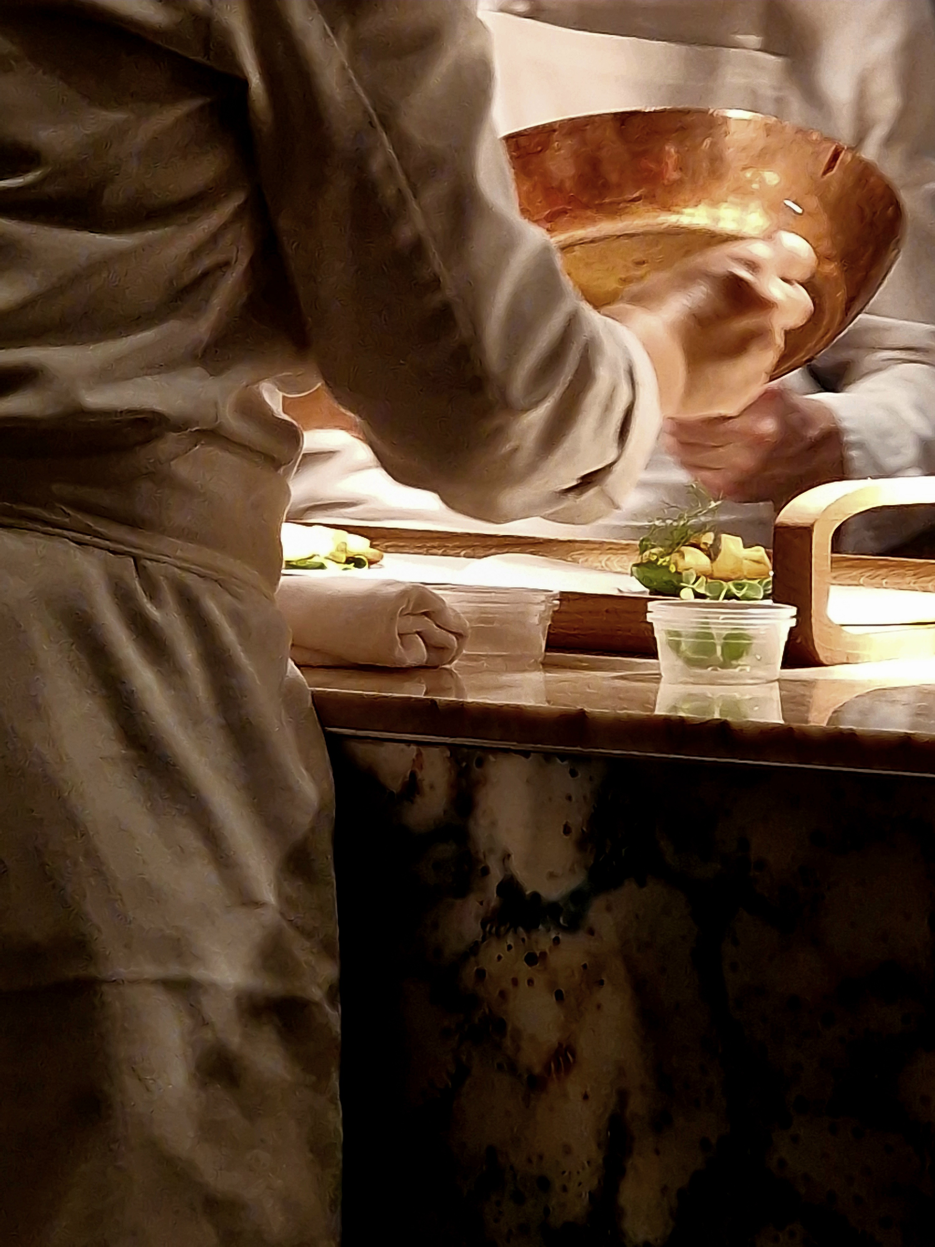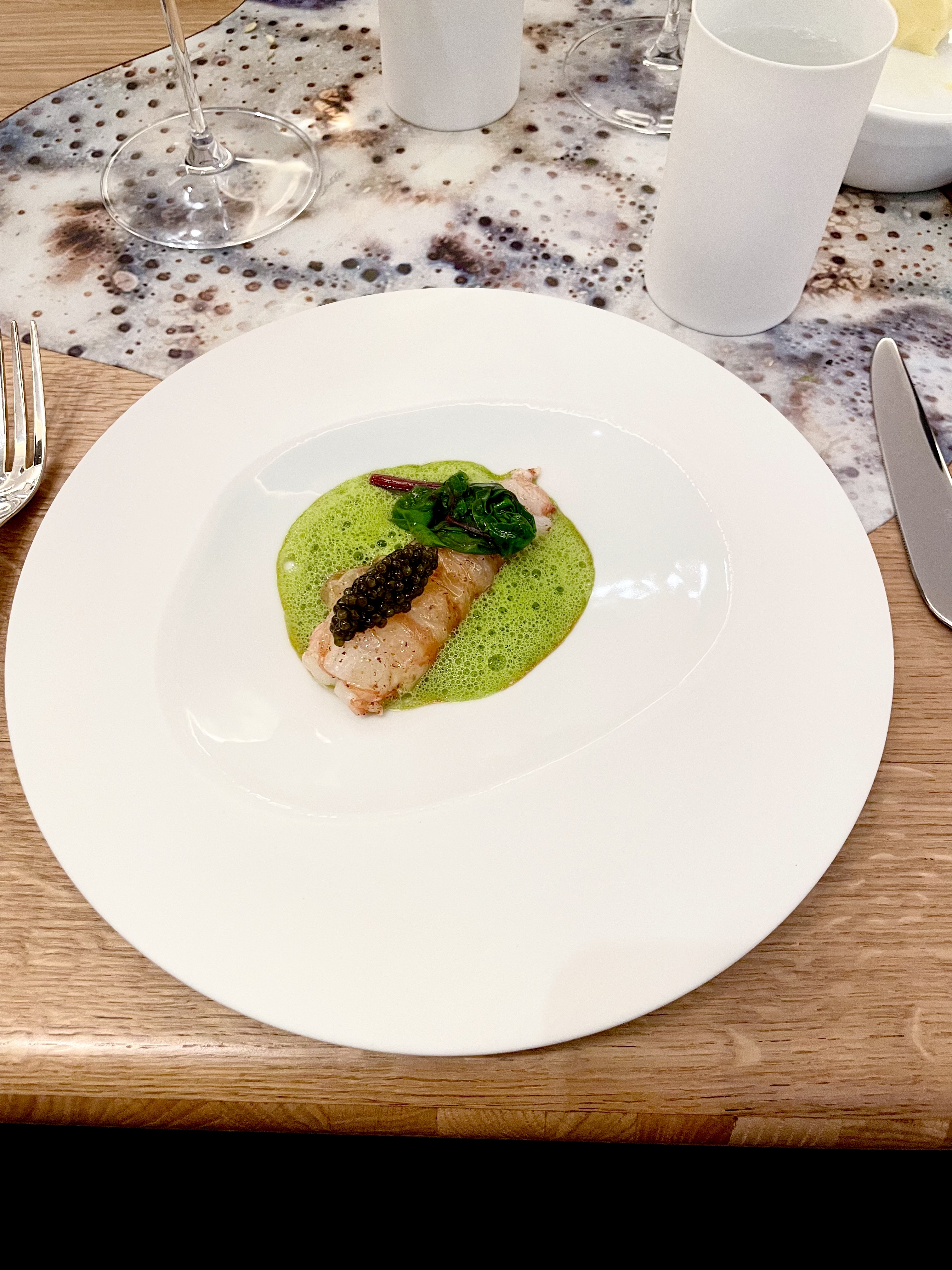 Beaucoup d’originalité dans les plats proposés avec des saveurs subtiles et équilibrées. Une très belle expérience en gardant un œil sur la cuisine où l’on voyait le chef piloter son équipe.